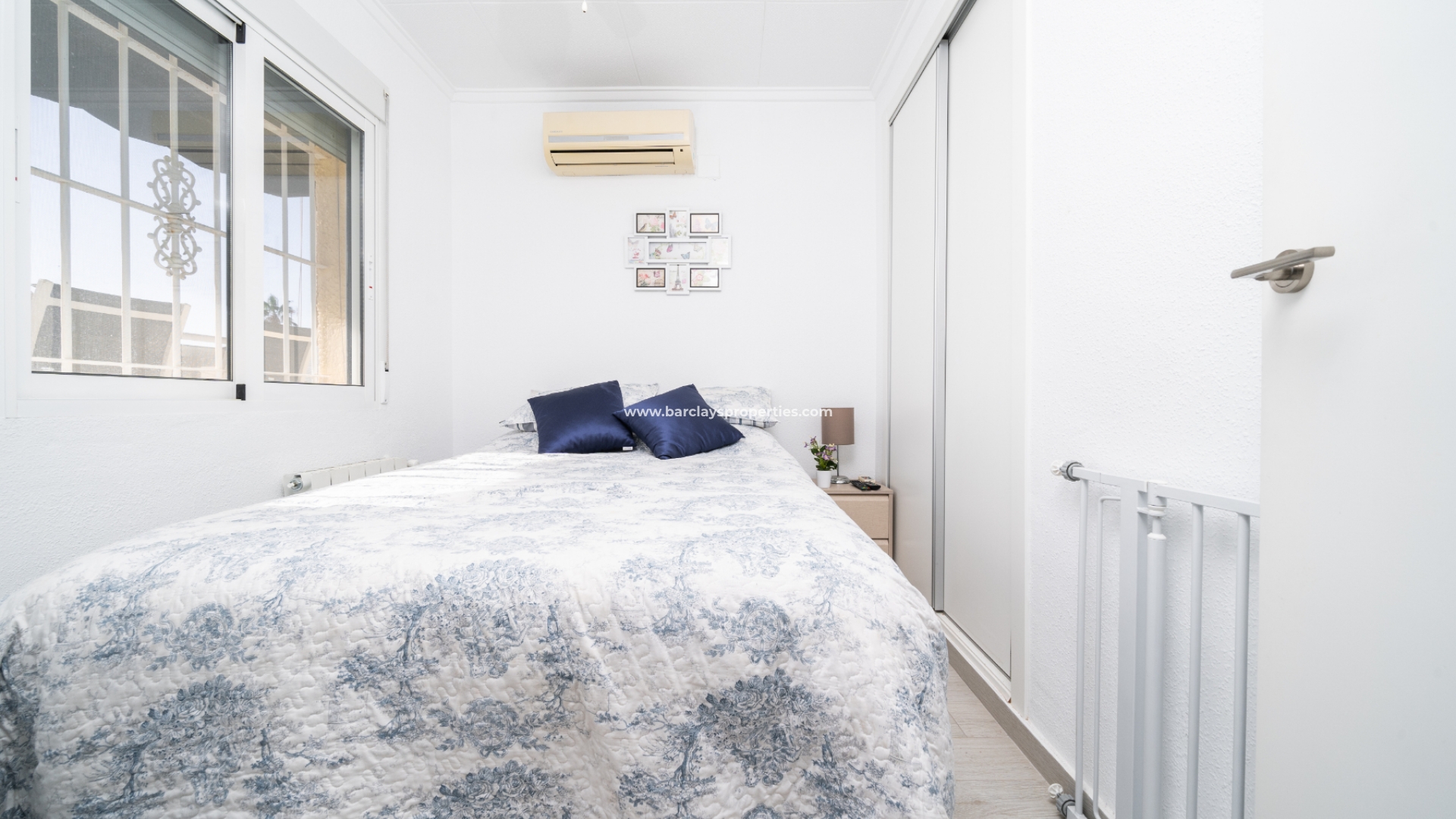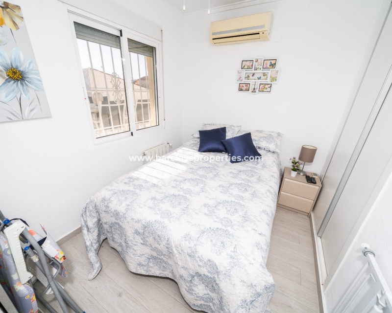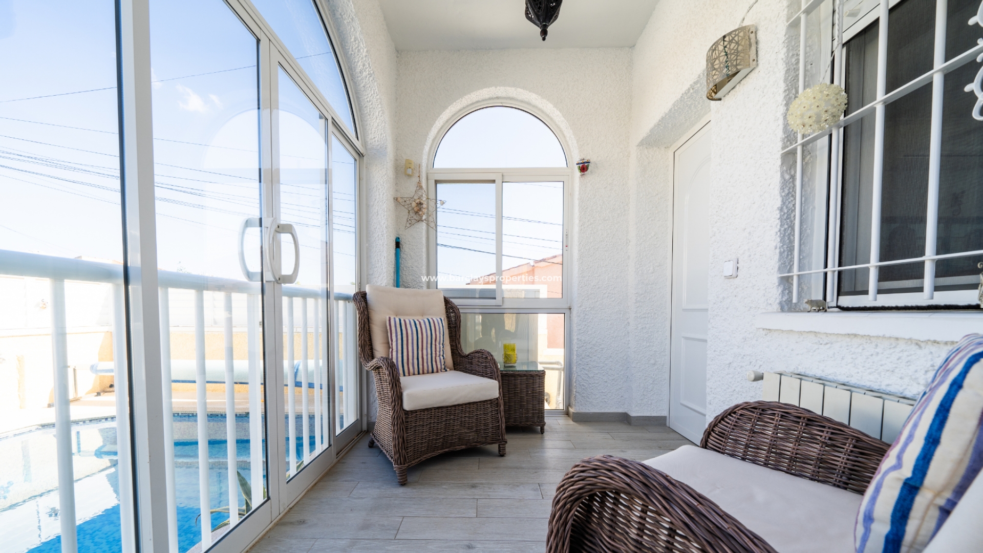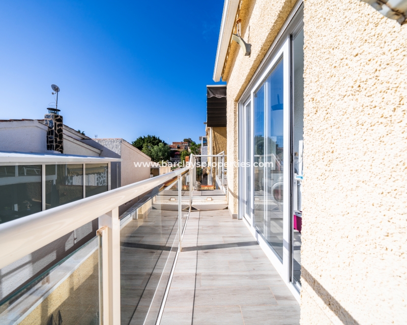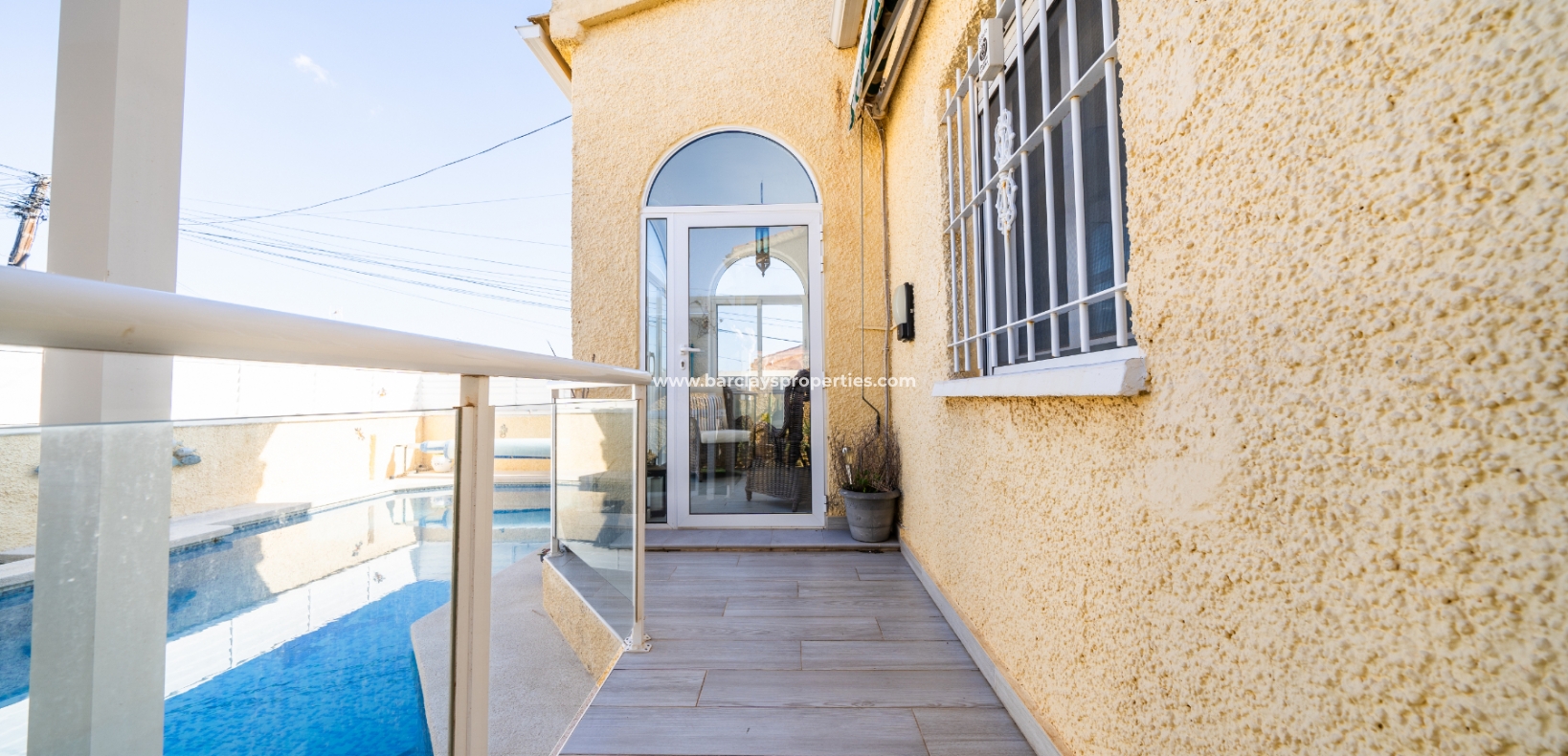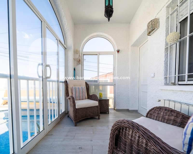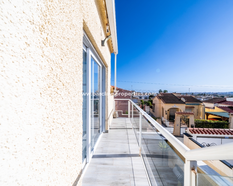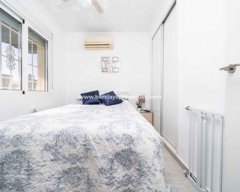 Op de bovenverdieping bevat de hoofdvilla een lichte, betegelde veranda met uitzicht op het zwembad, een ruime woonkamer met airconditioning en plafondventilator, twee slaapkamers met inbouwkasten, airconditioning en plafondventilatoren, een gerenoveerde, aparte inbouwkeuken met toegang tot de wasruimte en een verhoogd achterterras met eet- en zonnengebieden die een mooi uitzicht bieden op Guardamar del Segura.