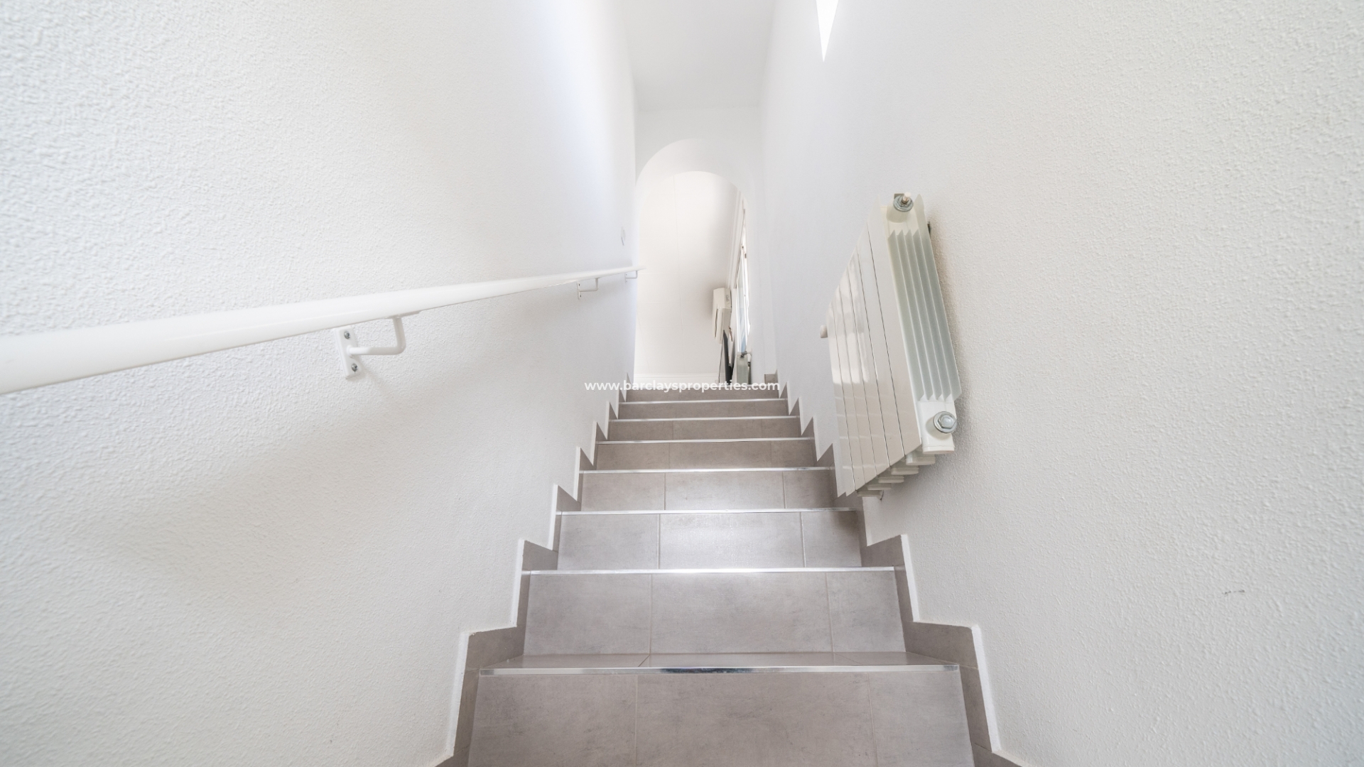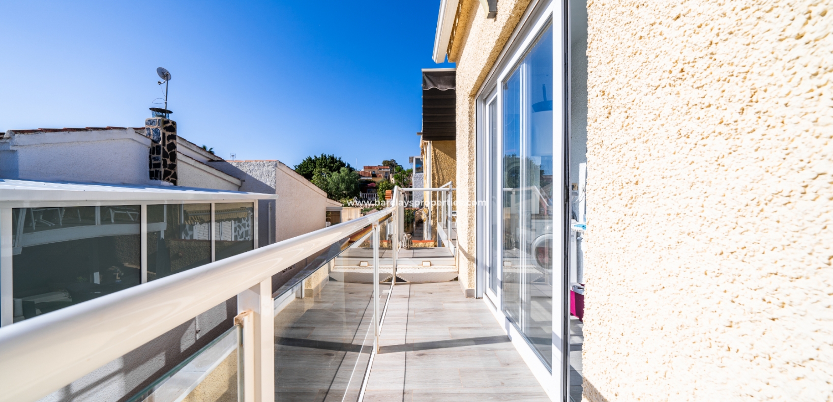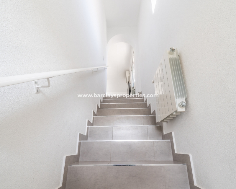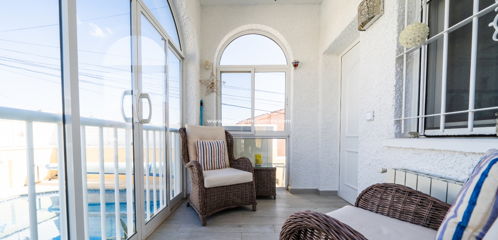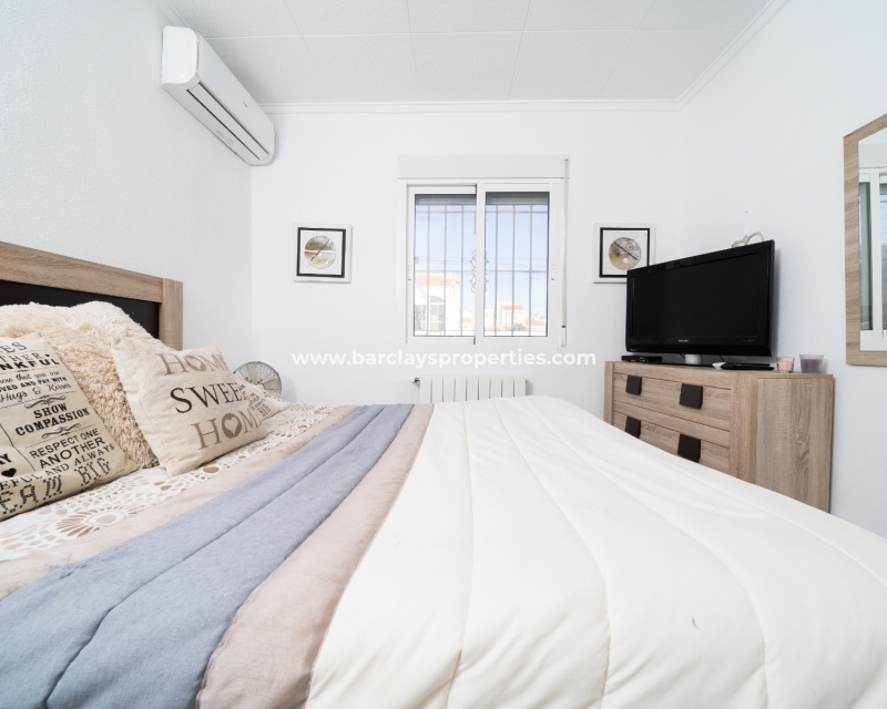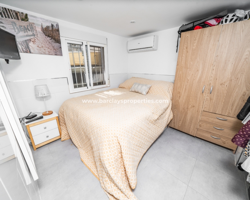 Op de bovenverdieping bevat de hoofdvilla een lichte, betegelde veranda met uitzicht op het zwembad, een ruime woonkamer met airconditioning en plafondventilator, twee slaapkamers met inbouwkasten, airconditioning en plafondventilatoren, een gerenoveerde, aparte inbouwkeuken met toegang tot de wasruimte en een verhoogd achterterras met eet- en zonnengebieden die een mooi uitzicht bieden op Guardamar del Segura.