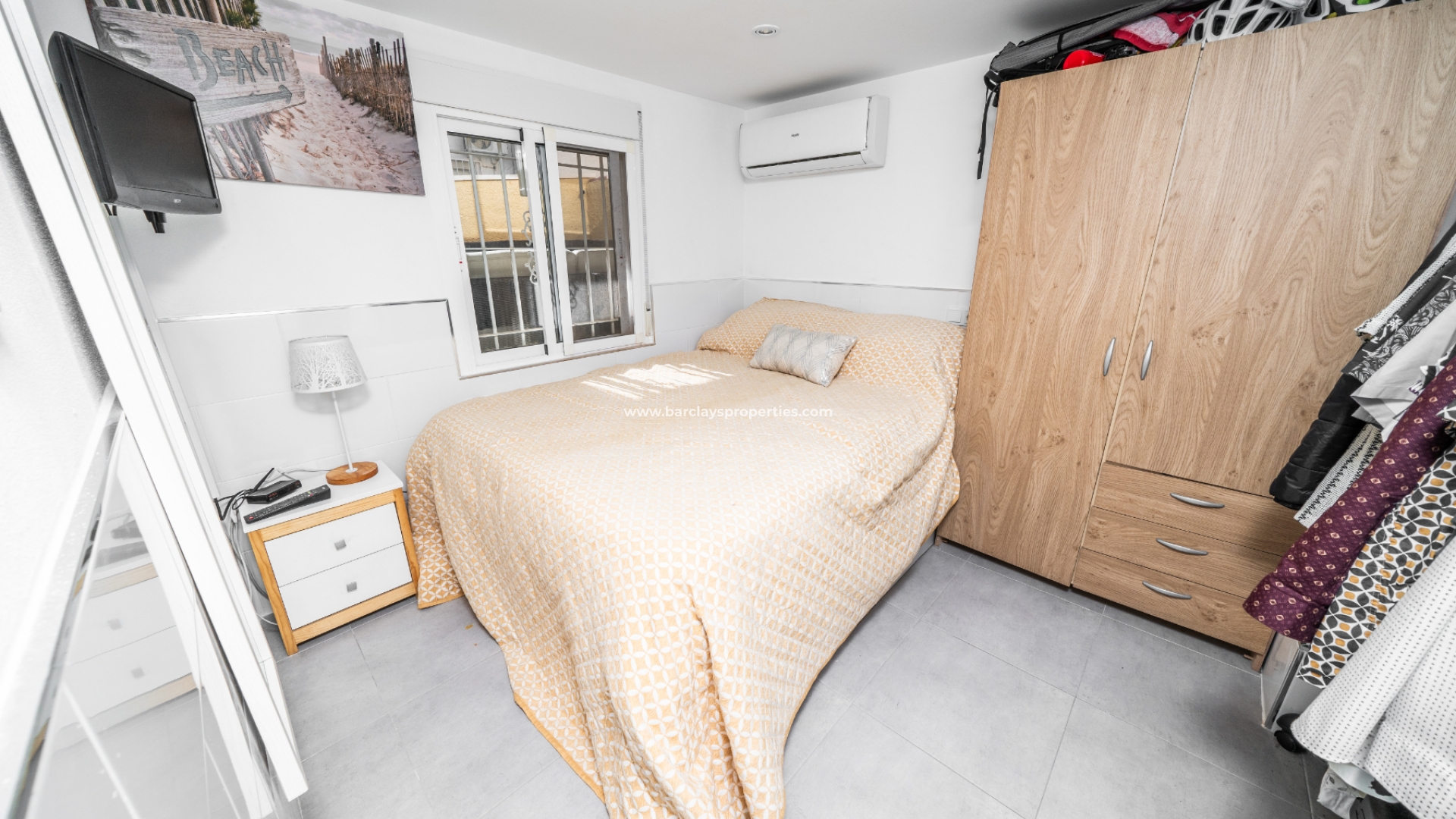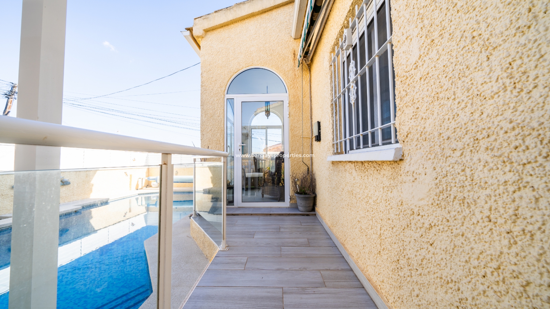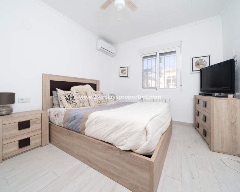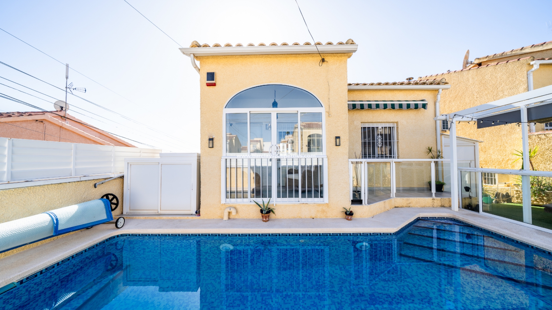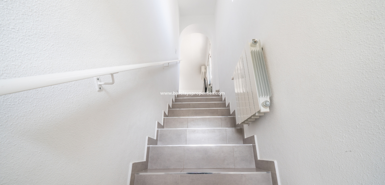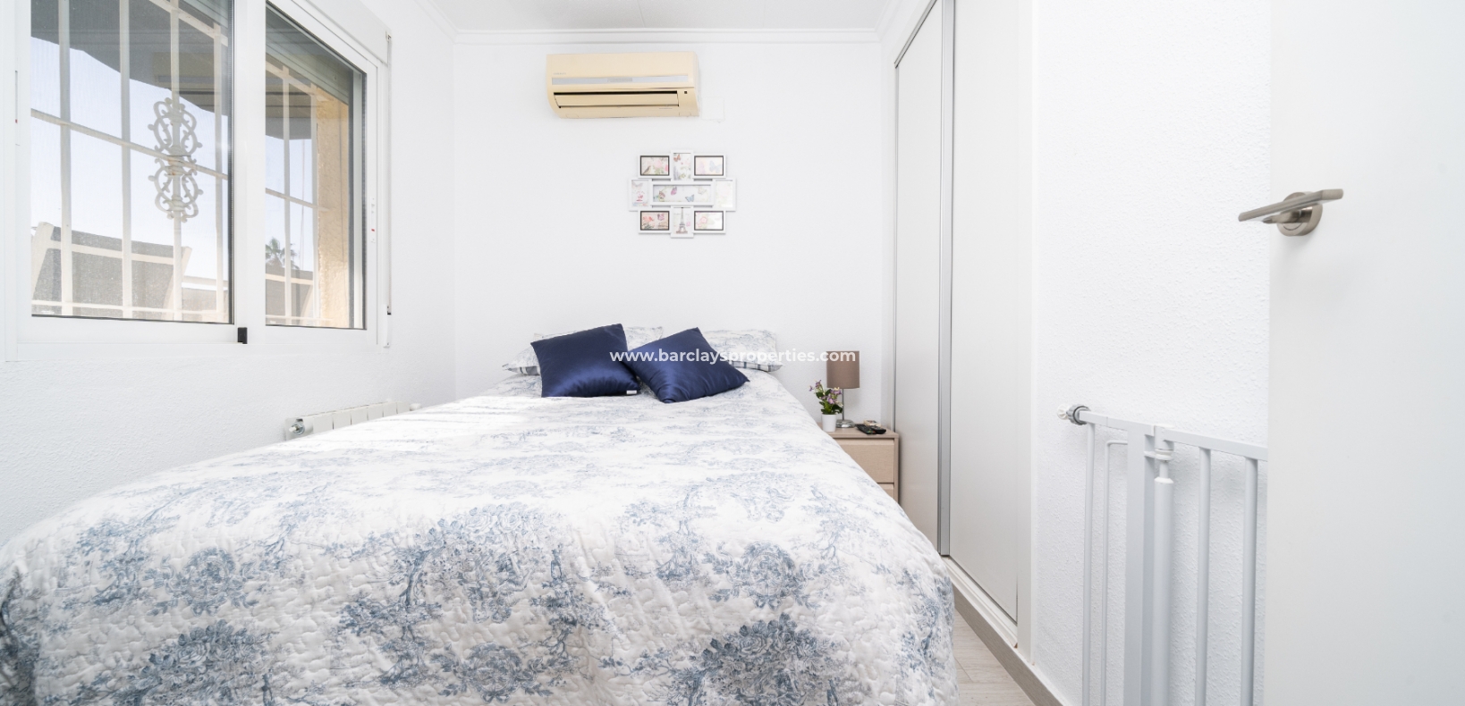 Op de bovenverdieping bevat de hoofdvilla een lichte, betegelde veranda met uitzicht op het zwembad, een ruime woonkamer met airconditioning en plafondventilator, twee slaapkamers met inbouwkasten, airconditioning en plafondventilatoren, een gerenoveerde, aparte inbouwkeuken met toegang tot de wasruimte en een verhoogd achterterras met eet- en zonnengebieden die een mooi uitzicht bieden op Guardamar del Segura.