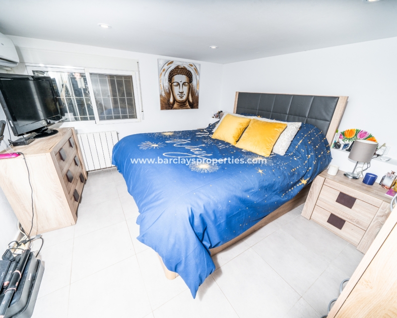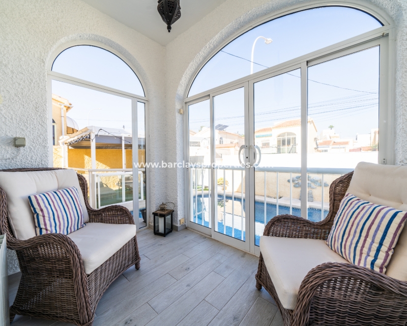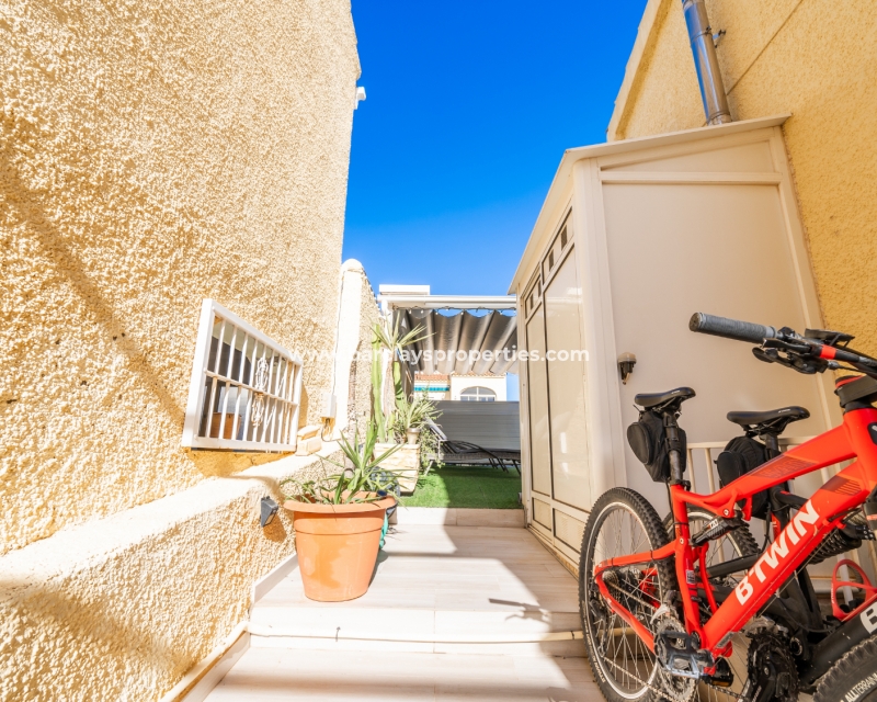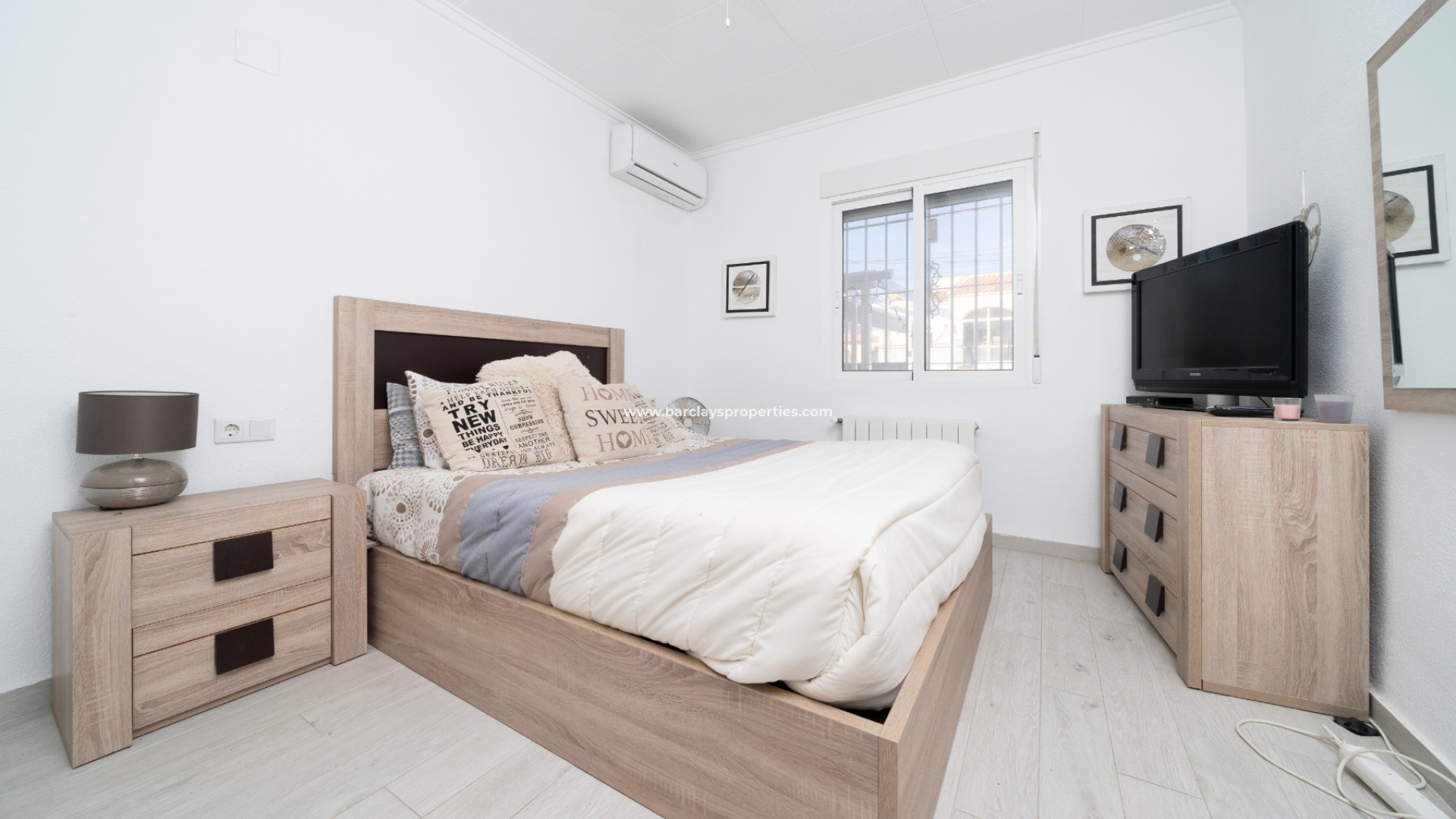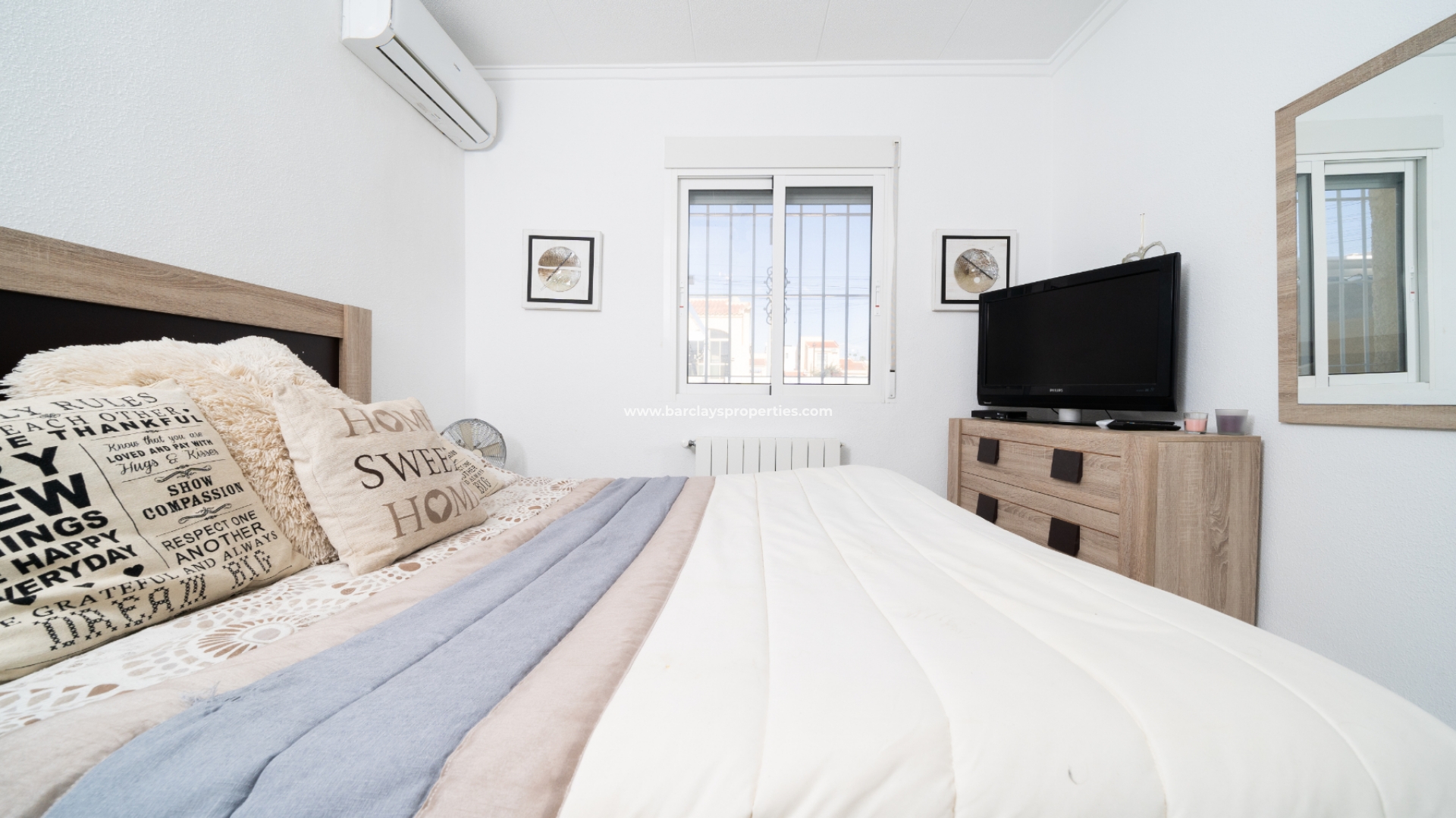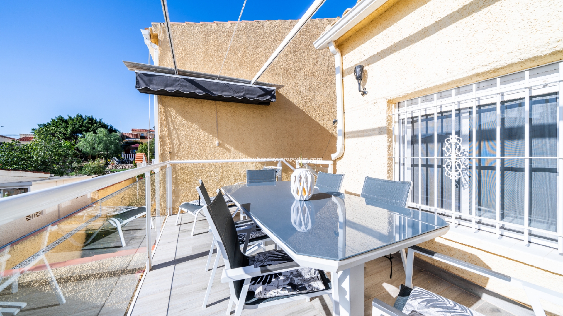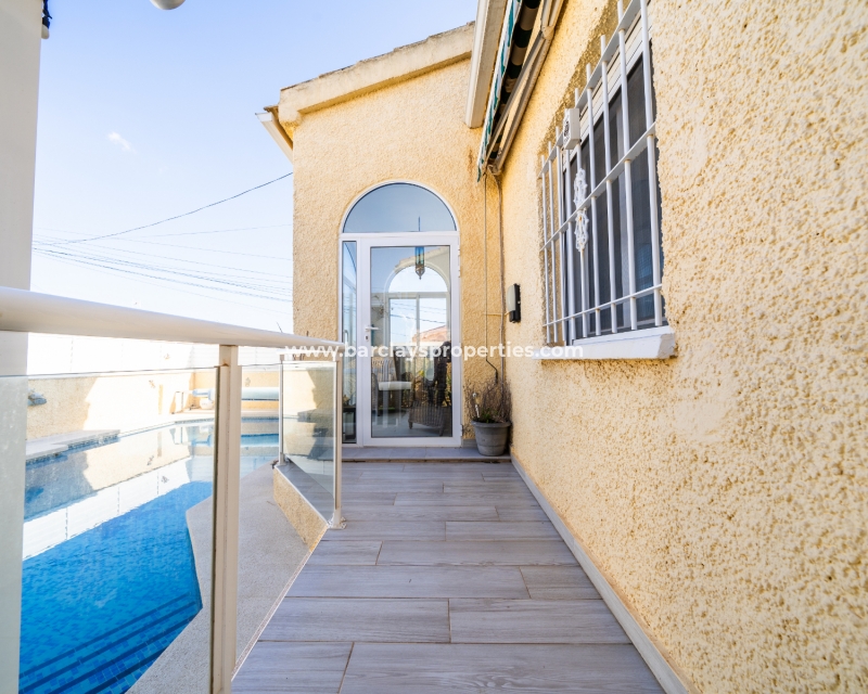 Op de bovenverdieping bevat de hoofdvilla een lichte, betegelde veranda met uitzicht op het zwembad, een ruime woonkamer met airconditioning en plafondventilator, twee slaapkamers met inbouwkasten, airconditioning en plafondventilatoren, een gerenoveerde, aparte inbouwkeuken met toegang tot de wasruimte en een verhoogd achterterras met eet- en zonnengebieden die een mooi uitzicht bieden op Guardamar del Segura.