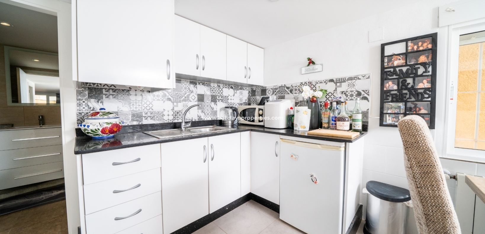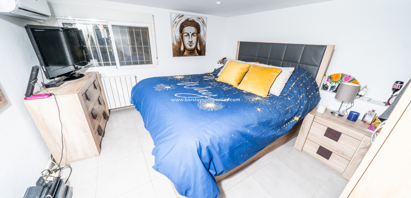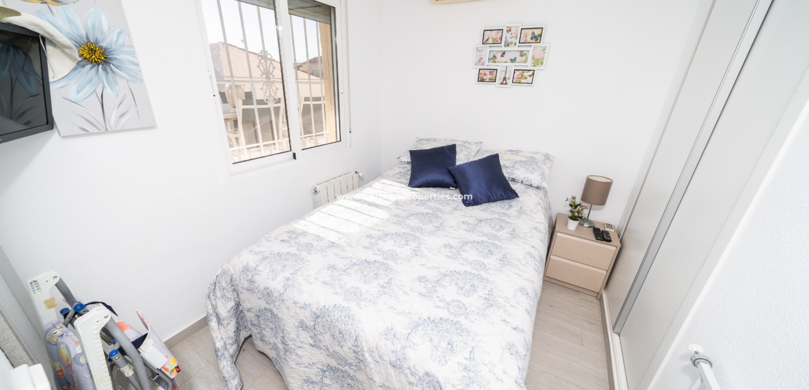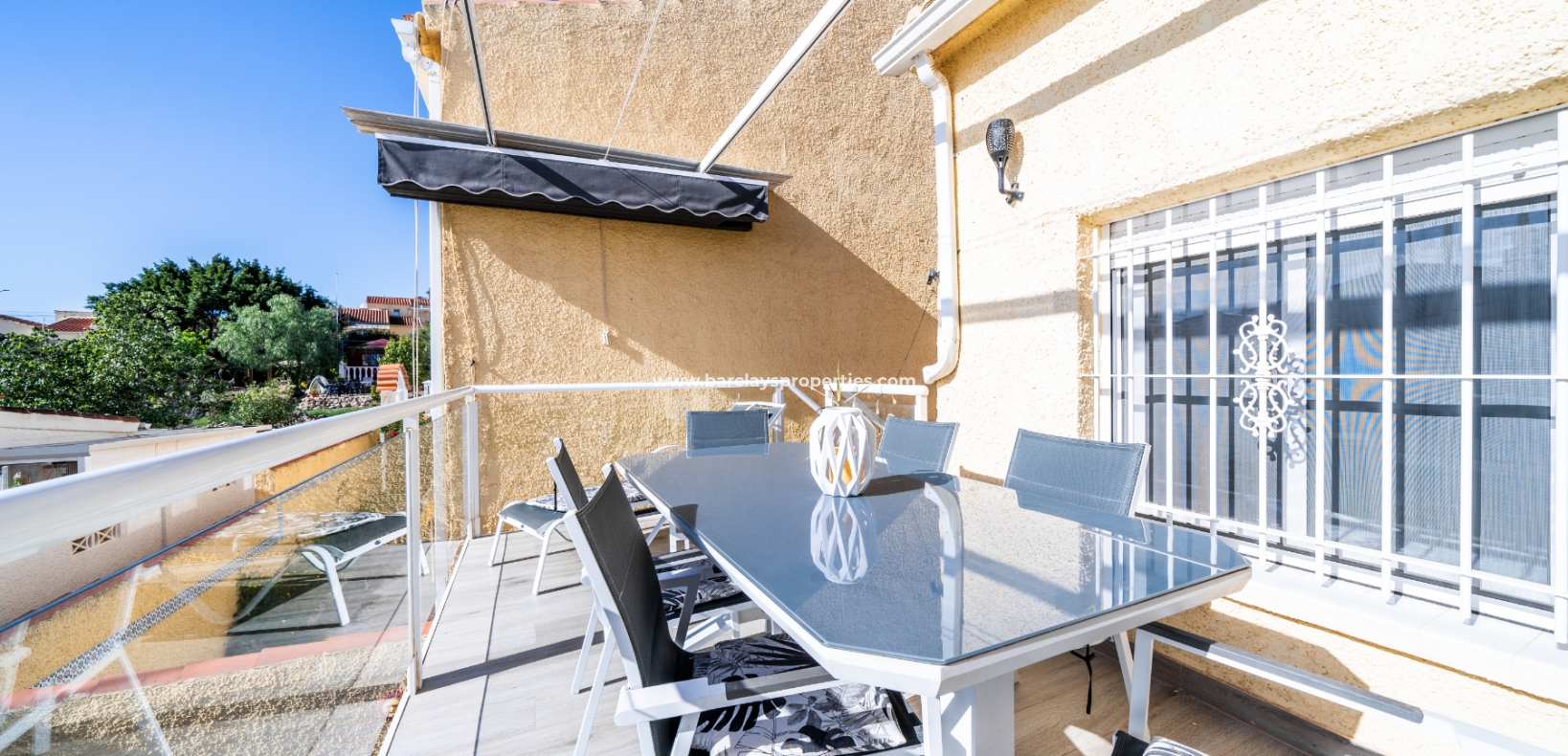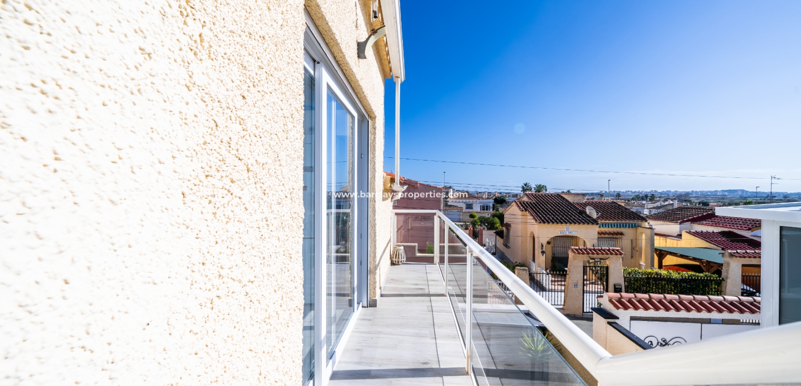 Op de bovenverdieping bevat de hoofdvilla een lichte, betegelde veranda met uitzicht op het zwembad, een ruime woonkamer met airconditioning en plafondventilator, twee slaapkamers met inbouwkasten, airconditioning en plafondventilatoren, een gerenoveerde, aparte inbouwkeuken met toegang tot de wasruimte en een verhoogd achterterras met eet- en zonnengebieden die een mooi uitzicht bieden op Guardamar del Segura.
