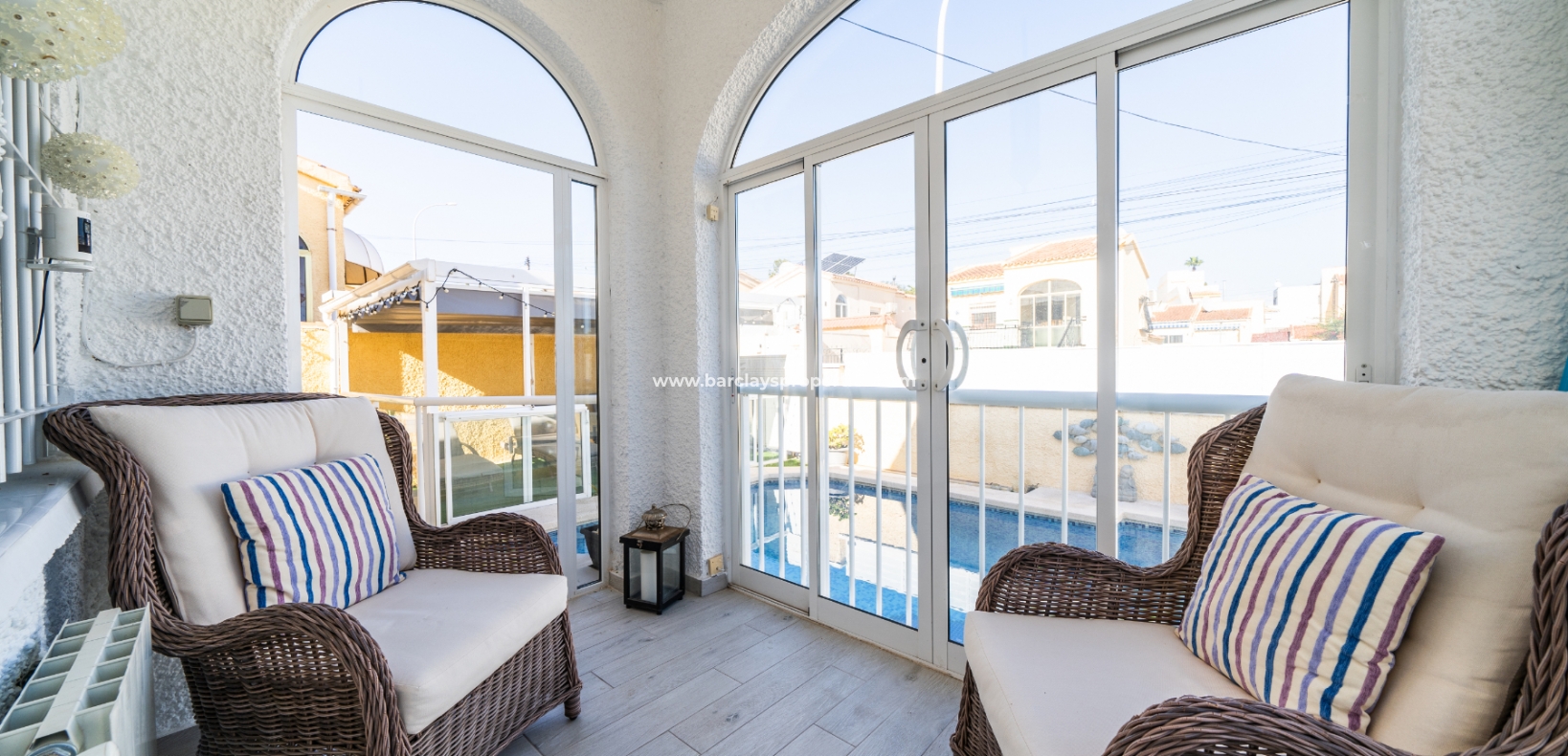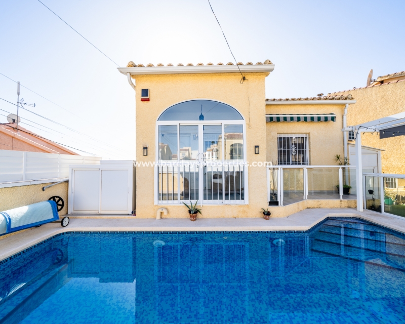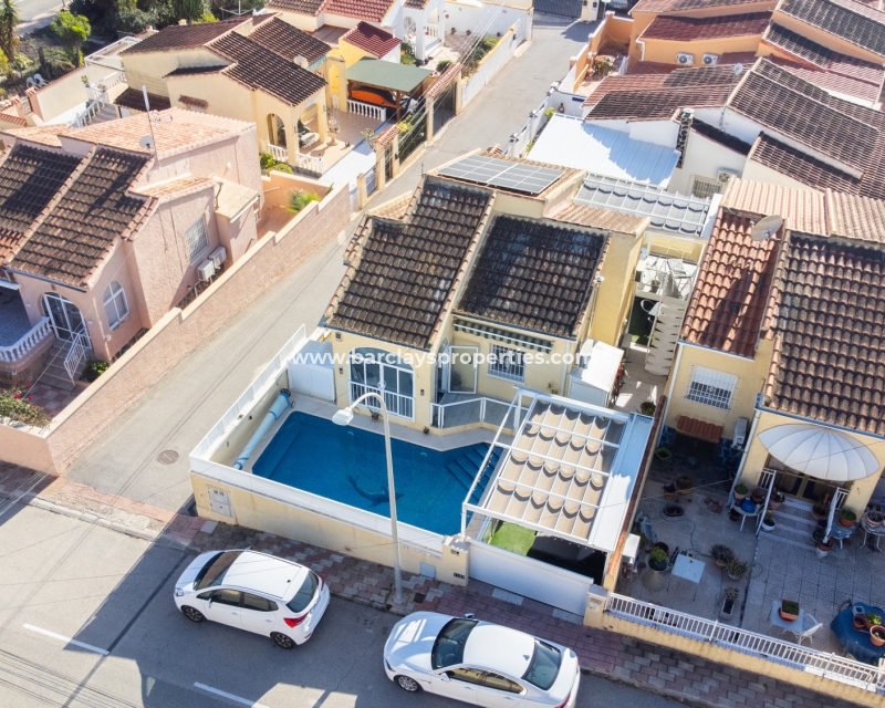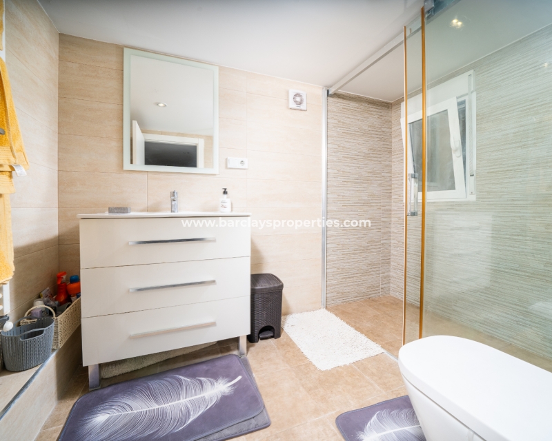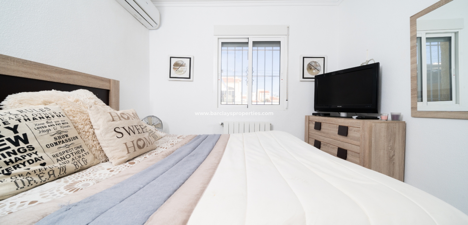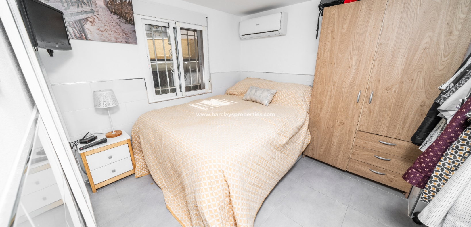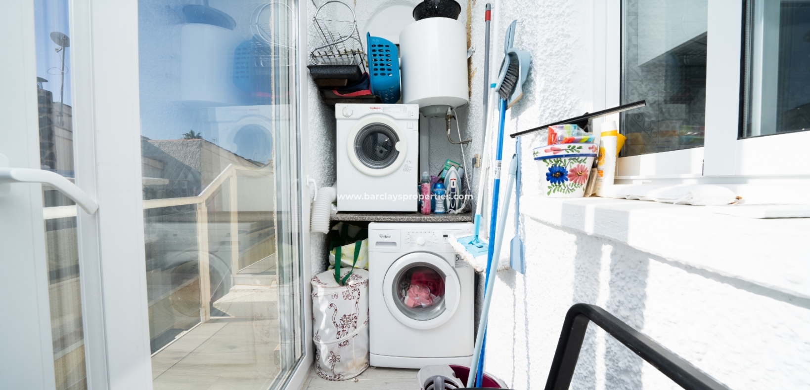Op de bovenverdieping bevat de hoofdvilla een lichte, betegelde veranda met uitzicht op het zwembad, een ruime woonkamer met airconditioning en plafondventilator, twee slaapkamers met inbouwkasten, airconditioning en plafondventilatoren, een gerenoveerde, aparte inbouwkeuken met toegang tot de wasruimte en een verhoogd achterterras met eet- en zonnengebieden die een mooi uitzicht bieden op Guardamar del Segura.
