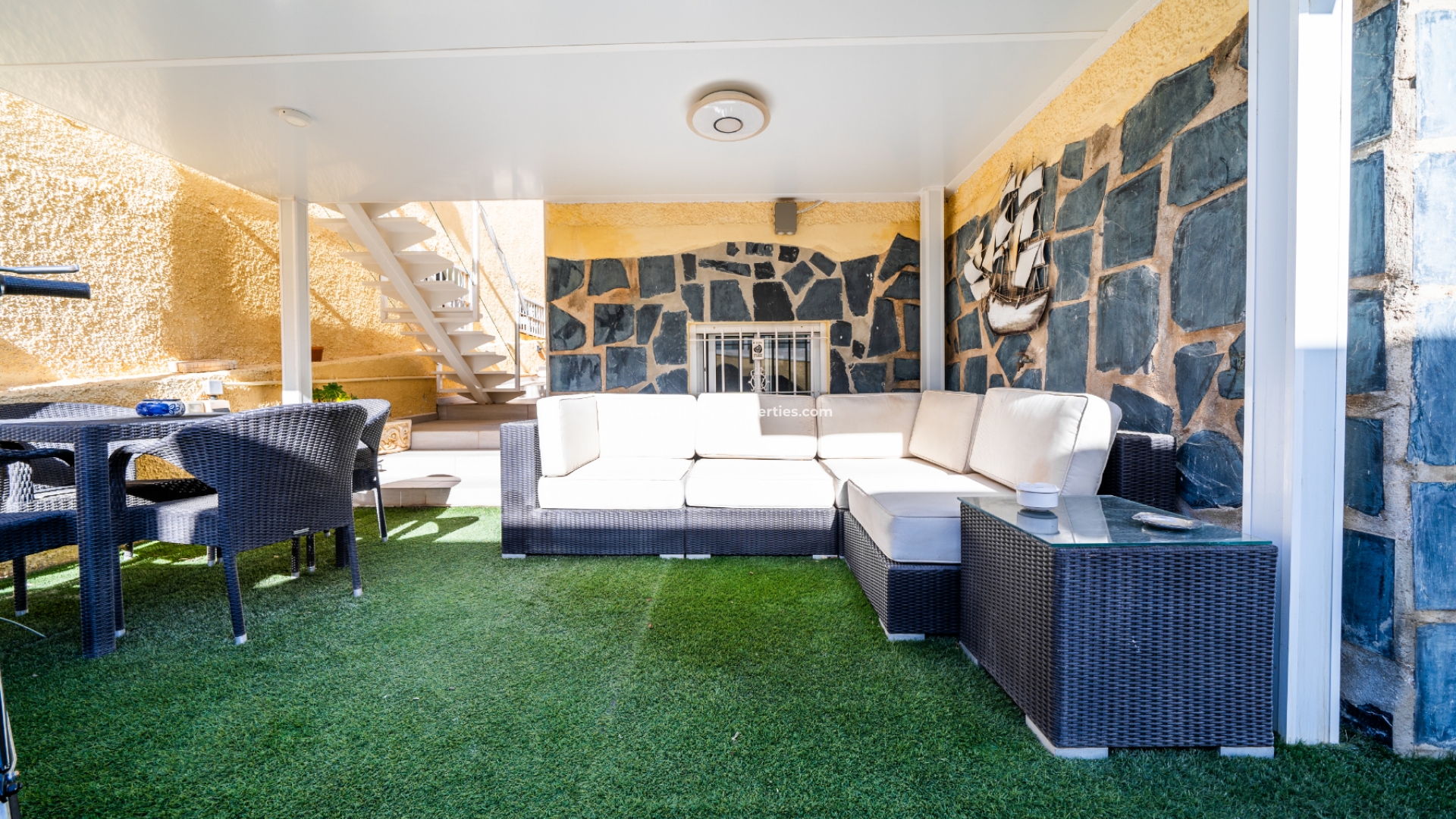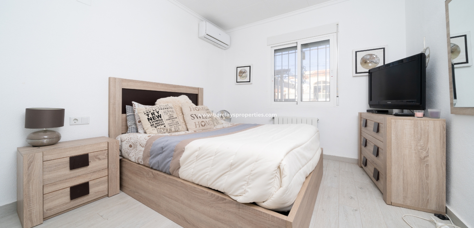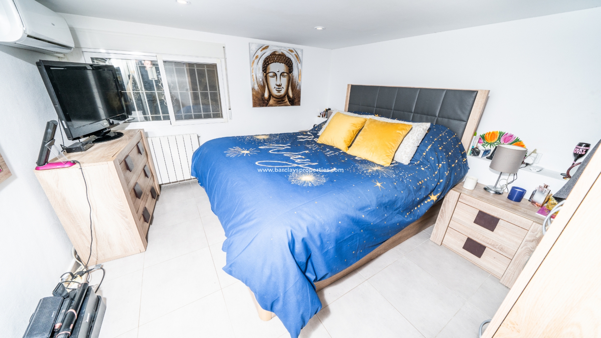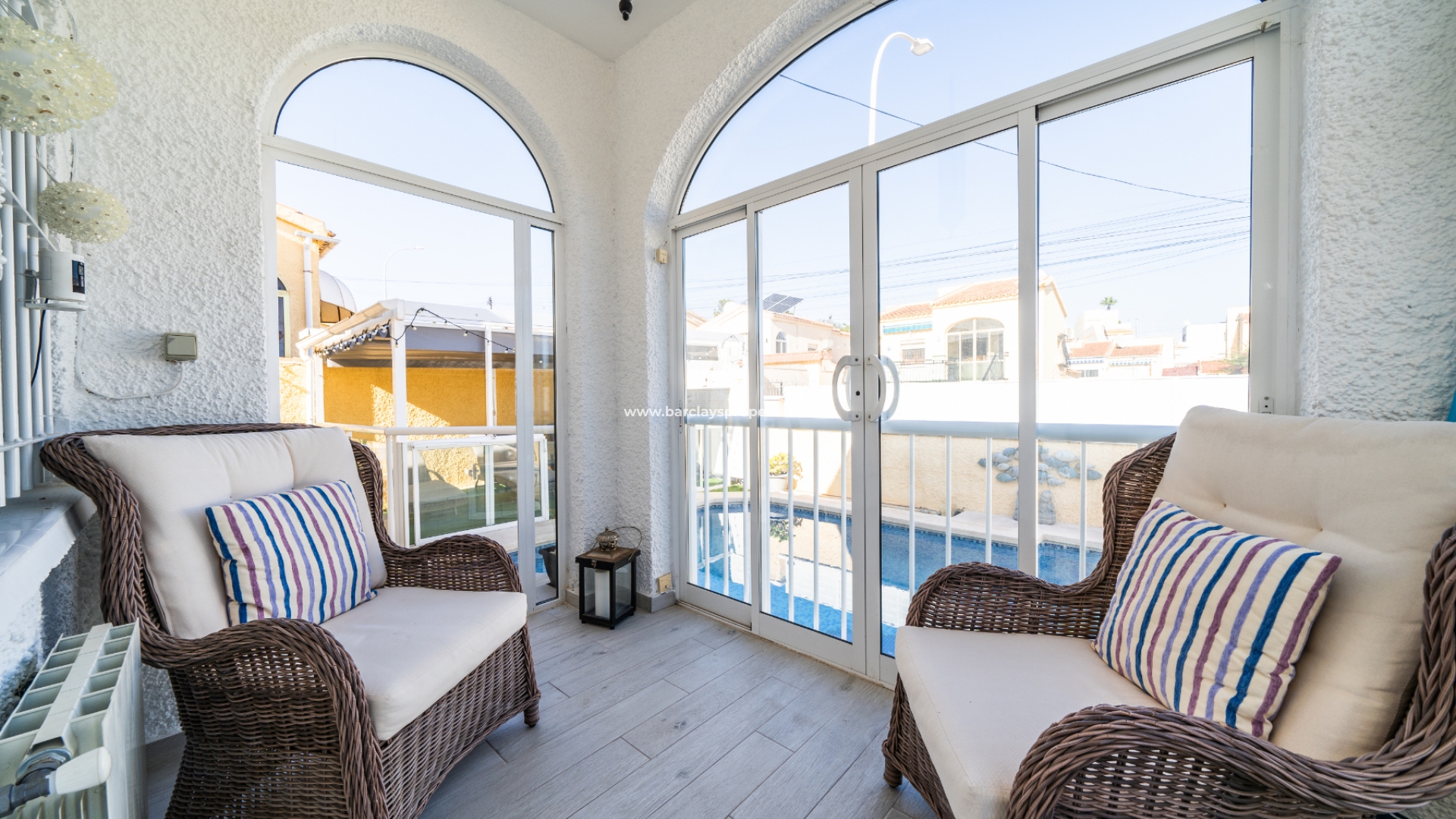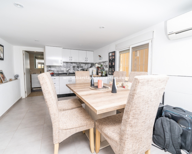 Op de bovenverdieping bevat de hoofdvilla een lichte, betegelde veranda met uitzicht op het zwembad, een ruime woonkamer met airconditioning en plafondventilator, twee slaapkamers met inbouwkasten, airconditioning en plafondventilatoren, een gerenoveerde, aparte inbouwkeuken met toegang tot de wasruimte en een verhoogd achterterras met eet- en zonnengebieden die een mooi uitzicht bieden op Guardamar del Segura.
