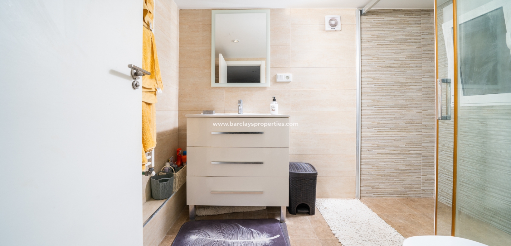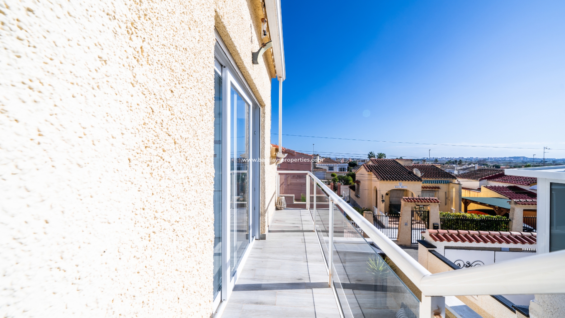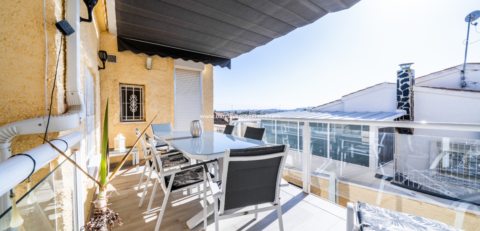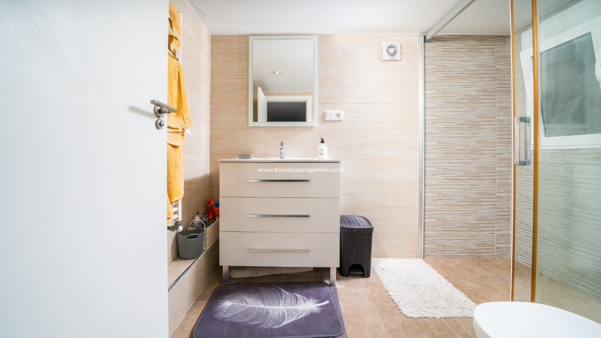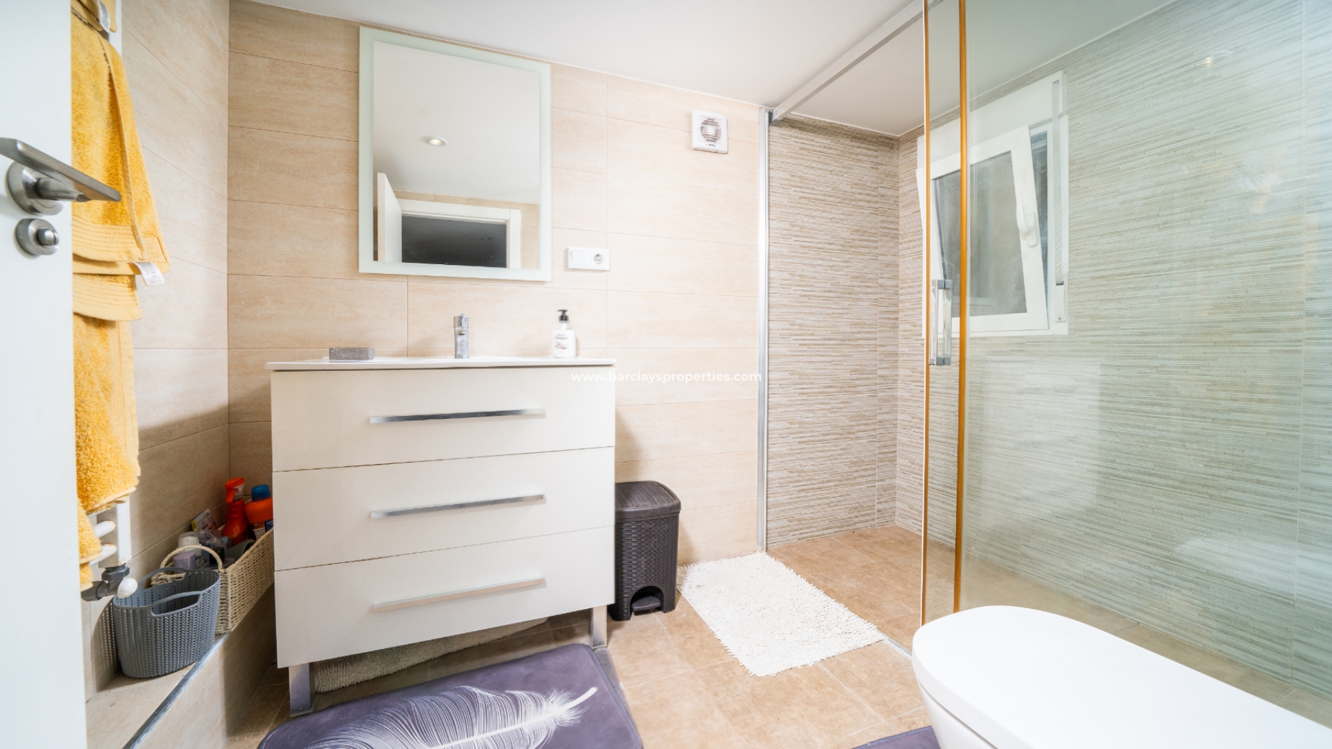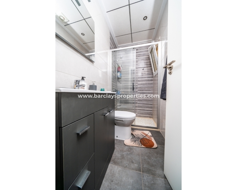 Op de bovenverdieping bevat de hoofdvilla een lichte, betegelde veranda met uitzicht op het zwembad, een ruime woonkamer met airconditioning en plafondventilator, twee slaapkamers met inbouwkasten, airconditioning en plafondventilatoren, een gerenoveerde, aparte inbouwkeuken met toegang tot de wasruimte en een verhoogd achterterras met eet- en zonnengebieden die een mooi uitzicht bieden op Guardamar del Segura.