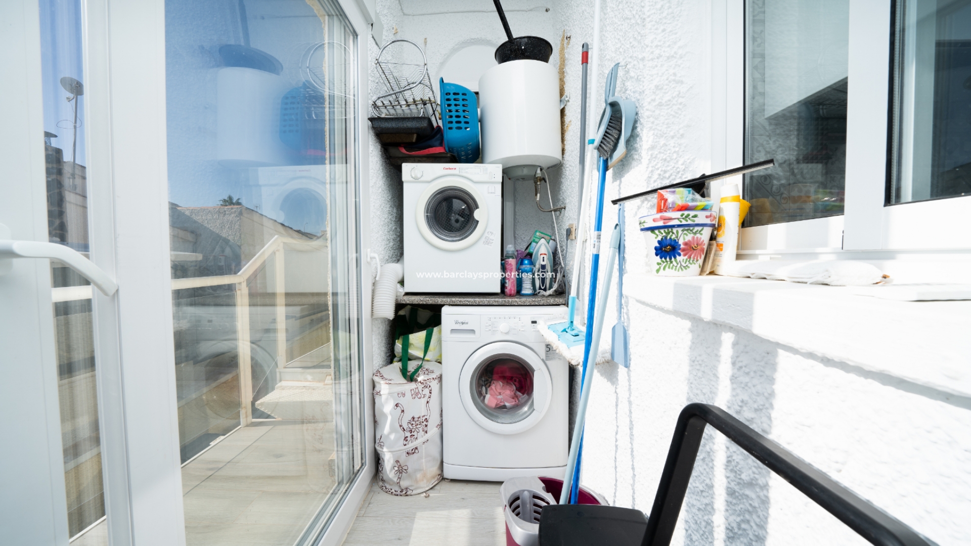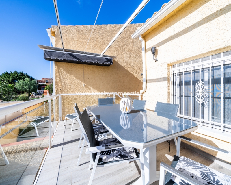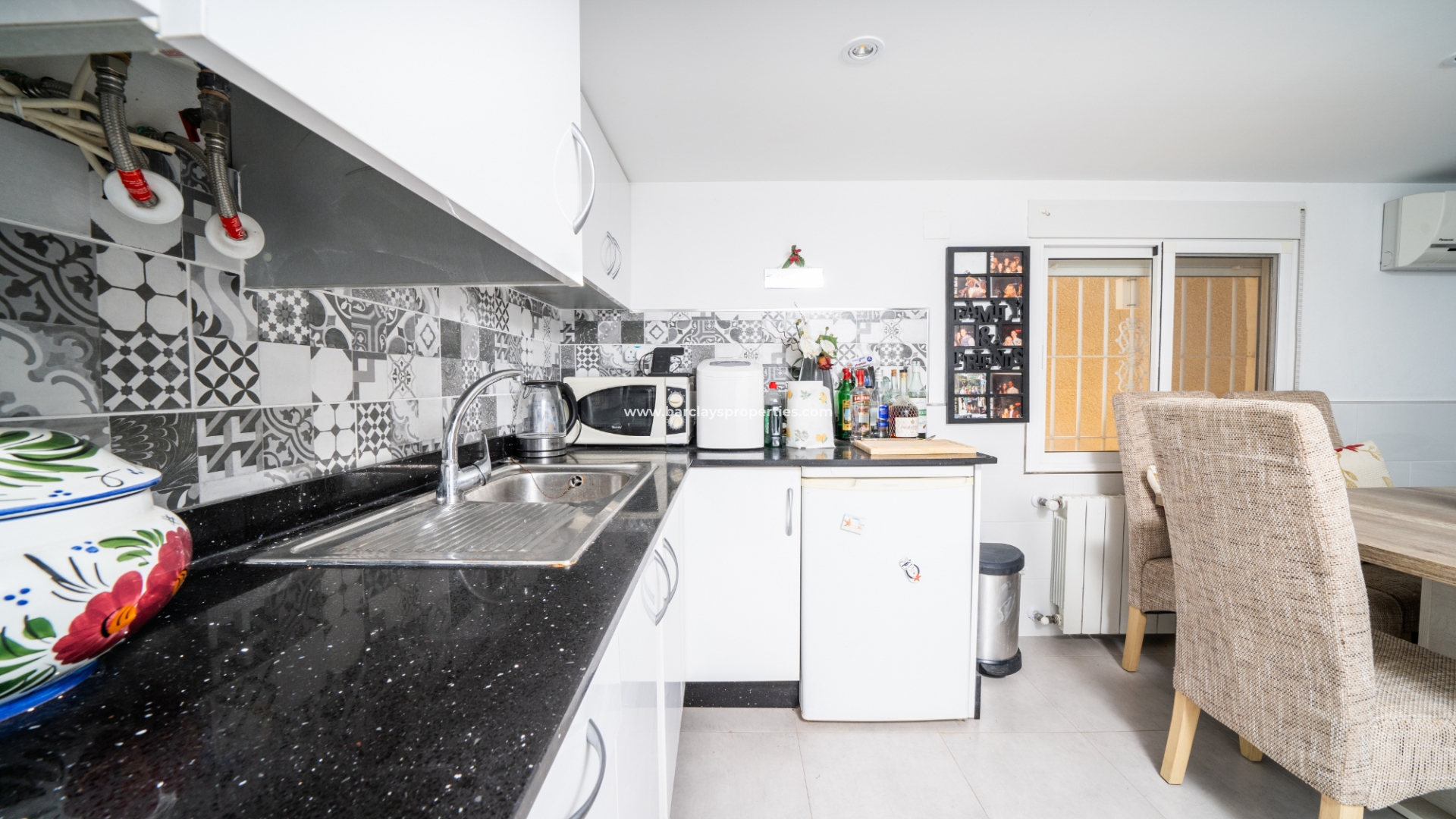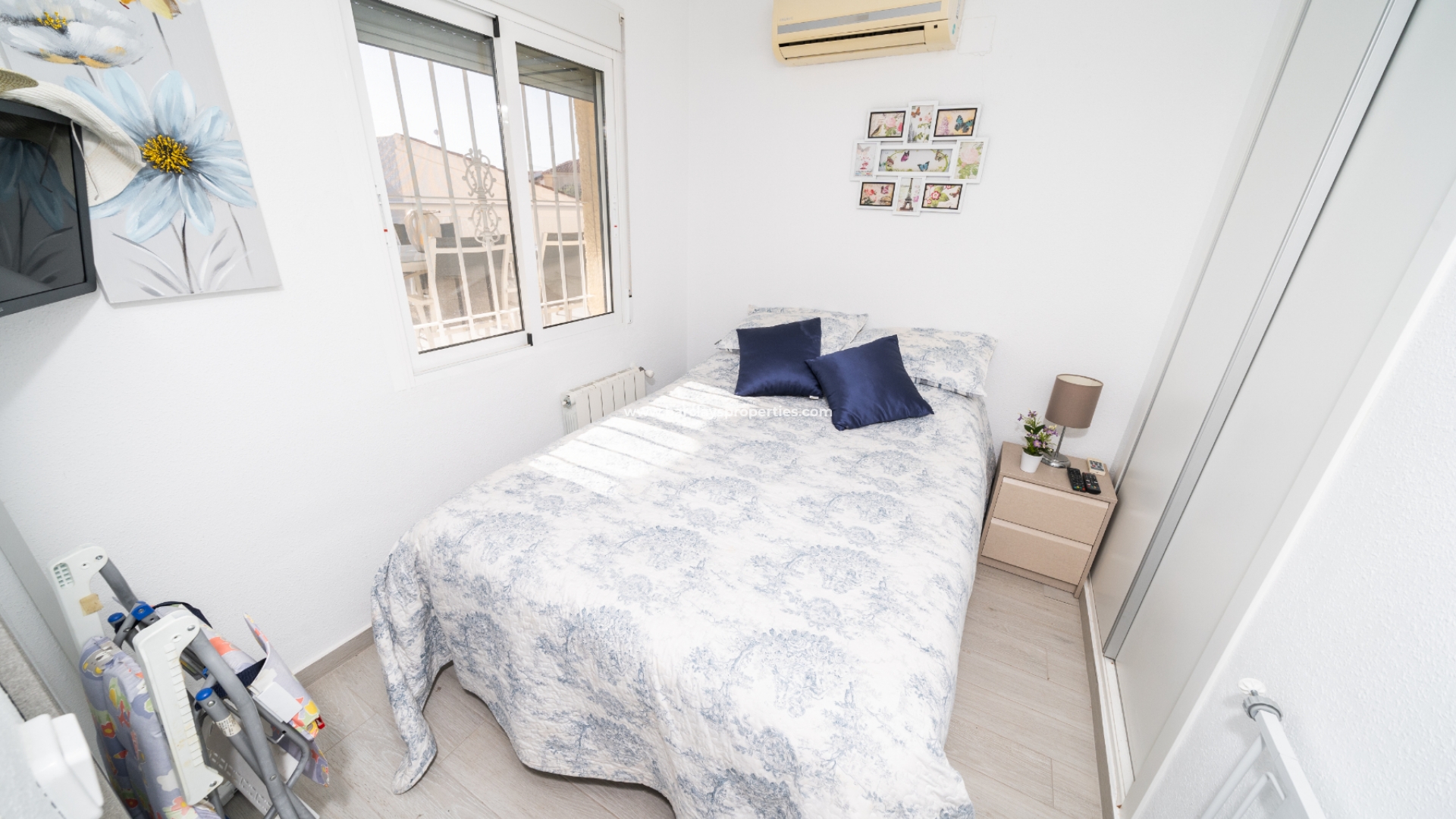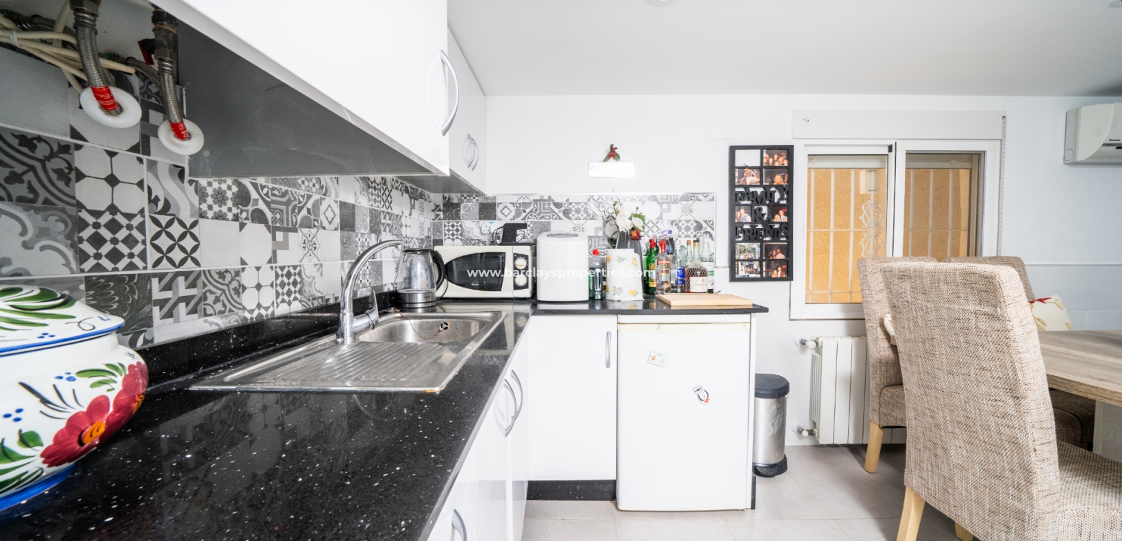 Op de bovenverdieping bevat de hoofdvilla een lichte, betegelde veranda met uitzicht op het zwembad, een ruime woonkamer met airconditioning en plafondventilator, twee slaapkamers met inbouwkasten, airconditioning en plafondventilatoren, een gerenoveerde, aparte inbouwkeuken met toegang tot de wasruimte en een verhoogd achterterras met eet- en zonnengebieden die een mooi uitzicht bieden op Guardamar del Segura.