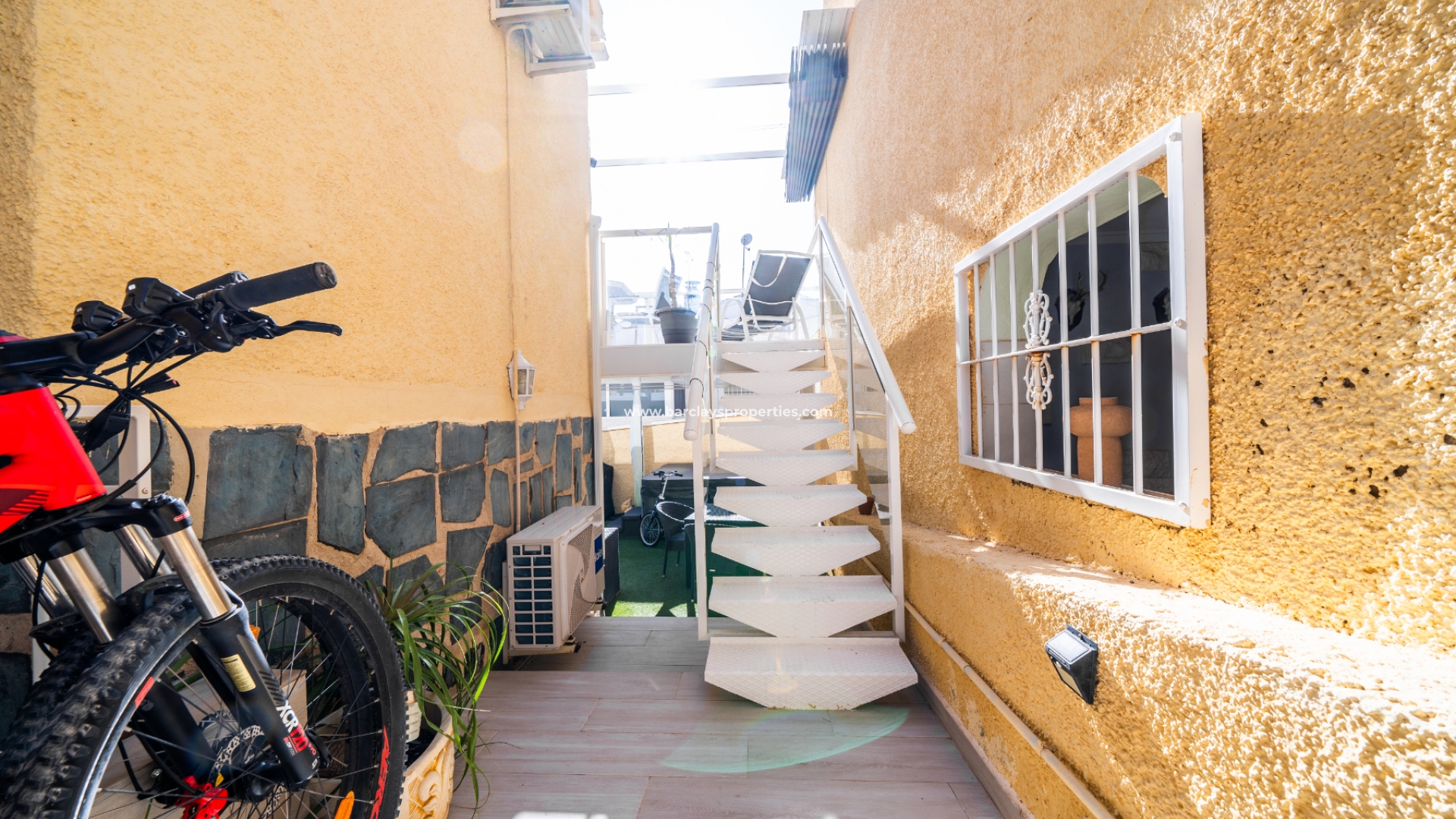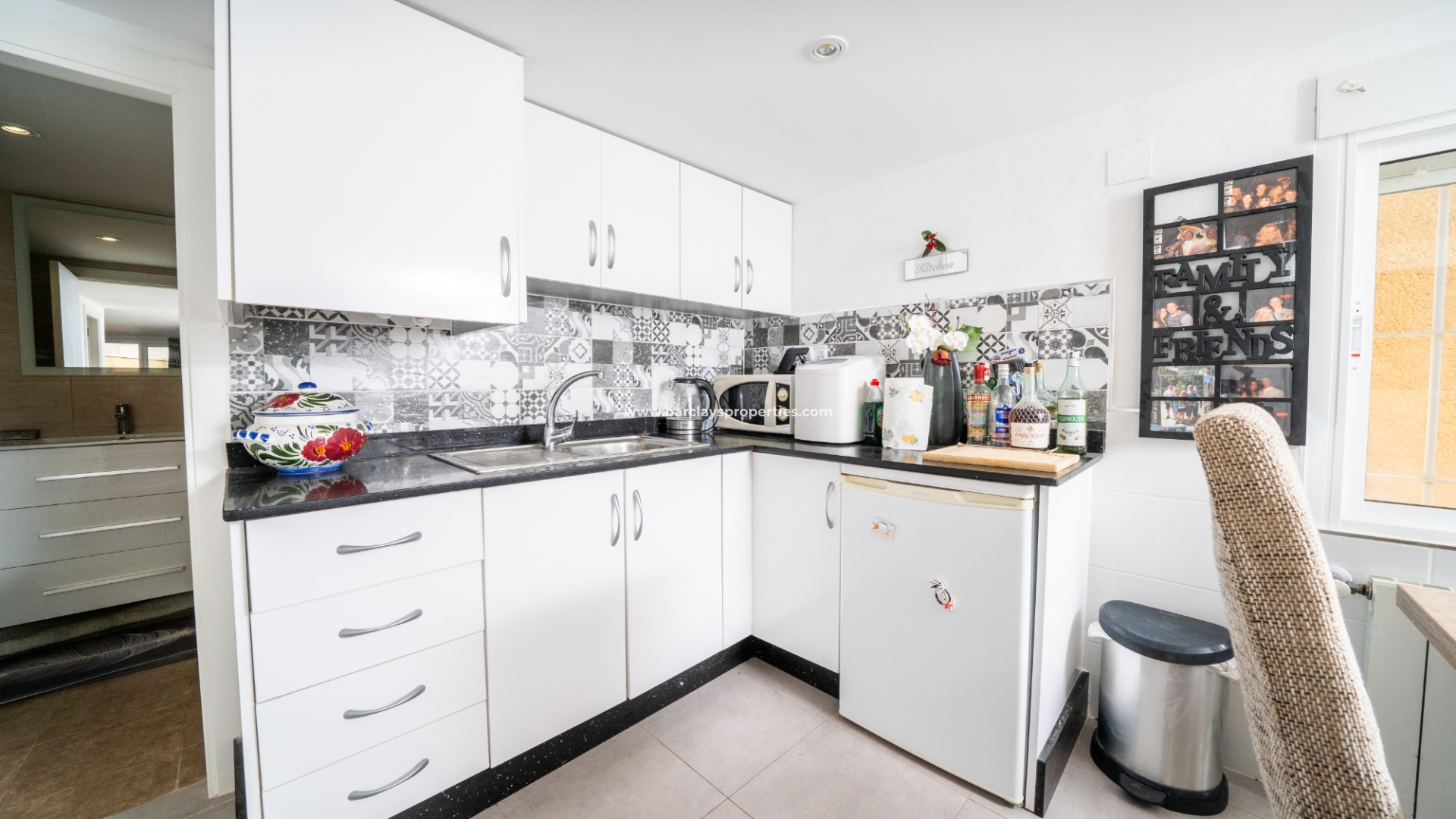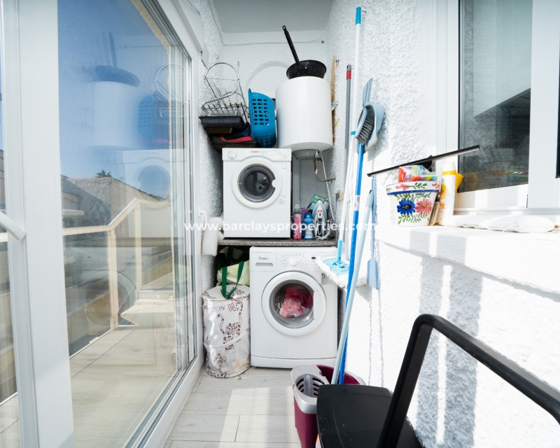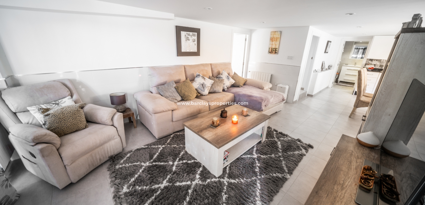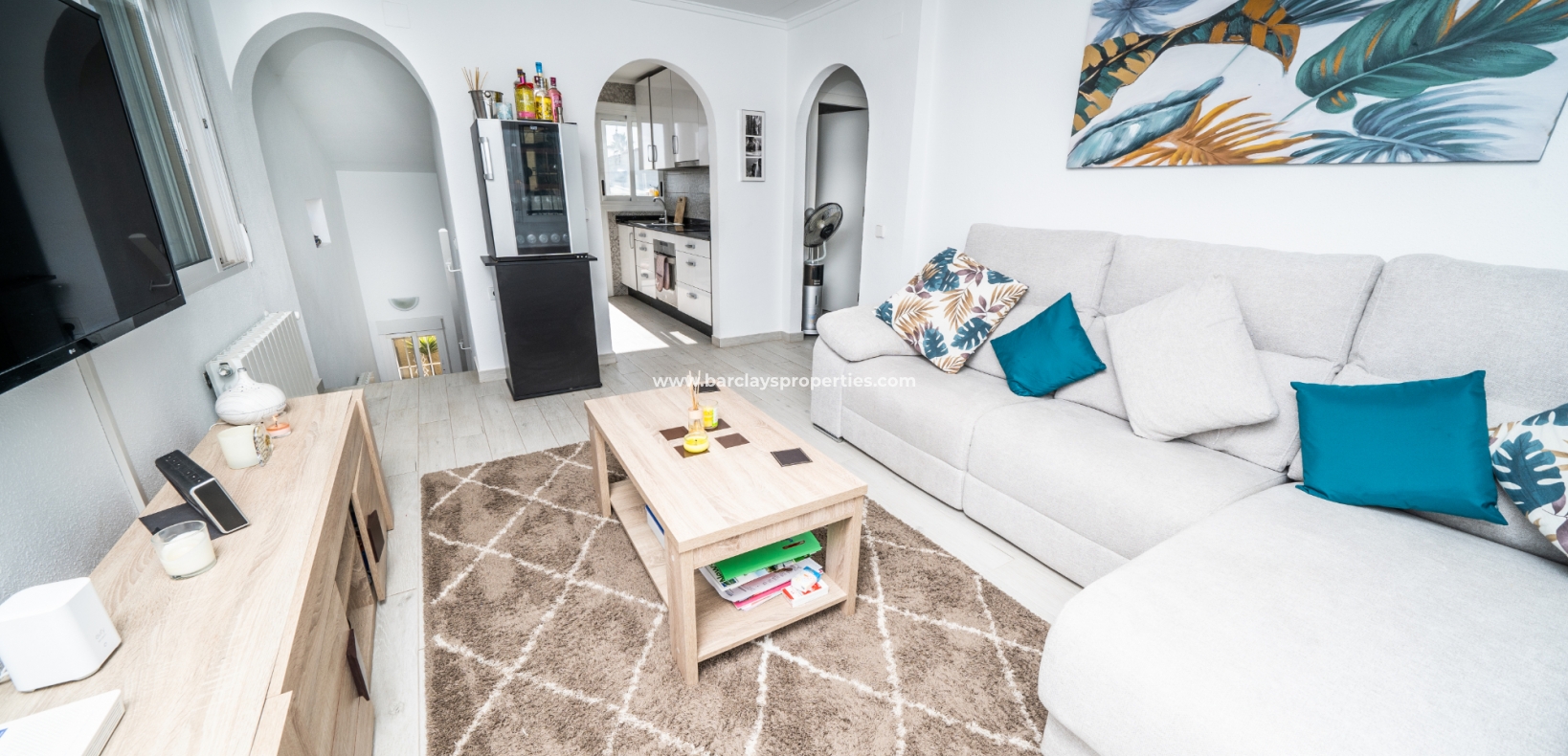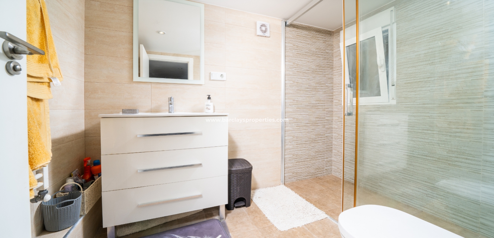 Op de bovenverdieping bevat de hoofdvilla een lichte, betegelde veranda met uitzicht op het zwembad, een ruime woonkamer met airconditioning en plafondventilator, twee slaapkamers met inbouwkasten, airconditioning en plafondventilatoren, een gerenoveerde, aparte inbouwkeuken met toegang tot de wasruimte en een verhoogd achterterras met eet- en zonnengebieden die een mooi uitzicht bieden op Guardamar del Segura.