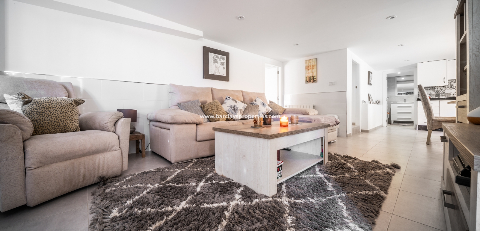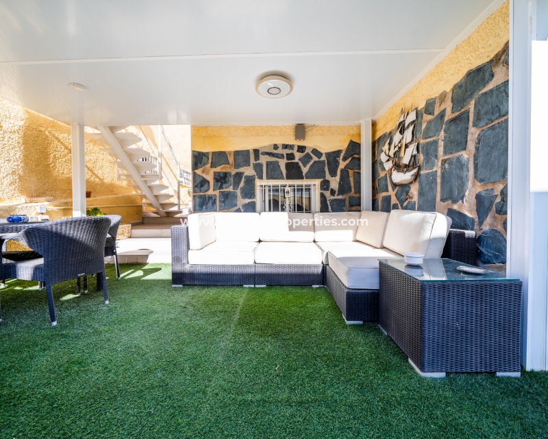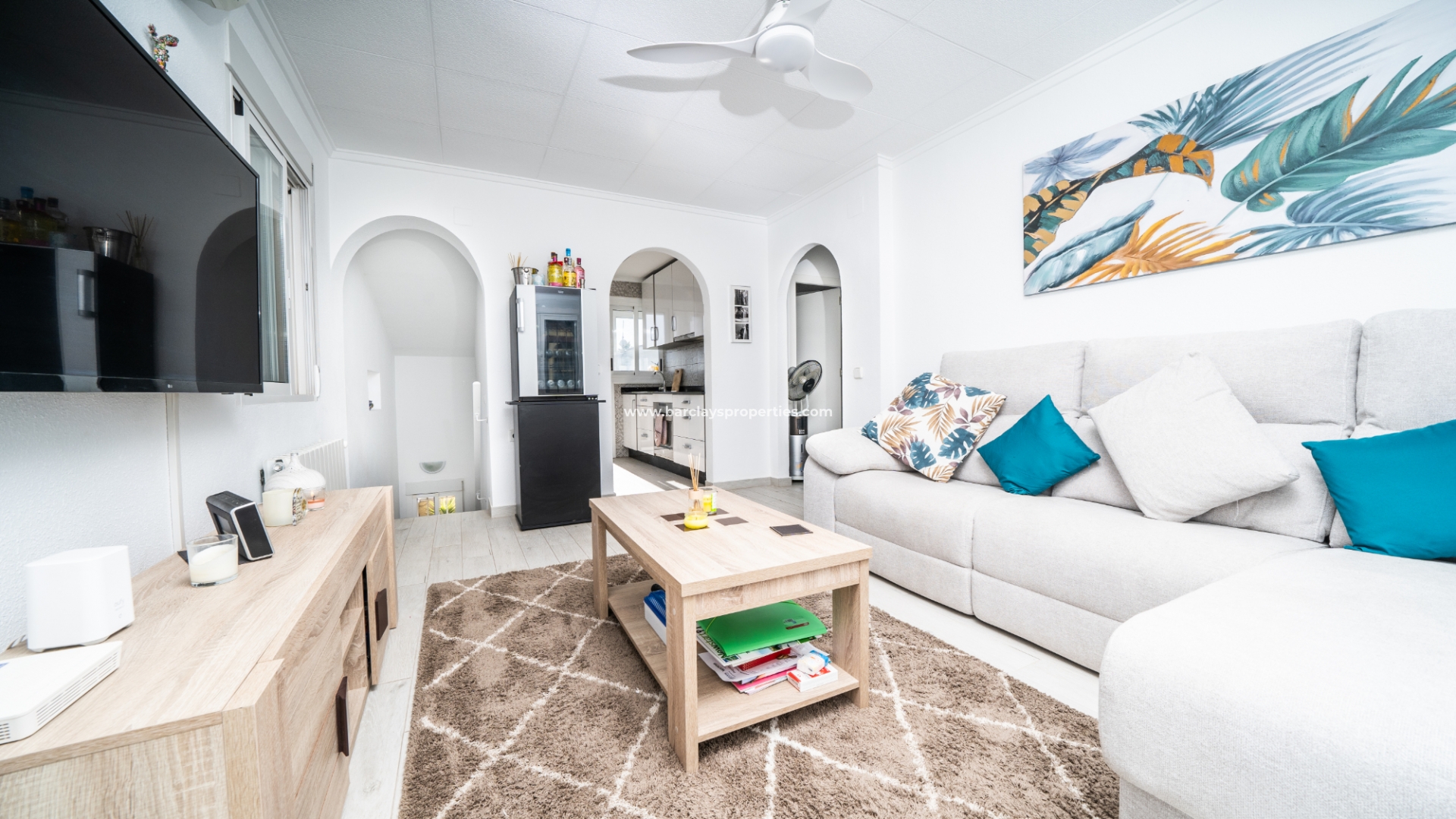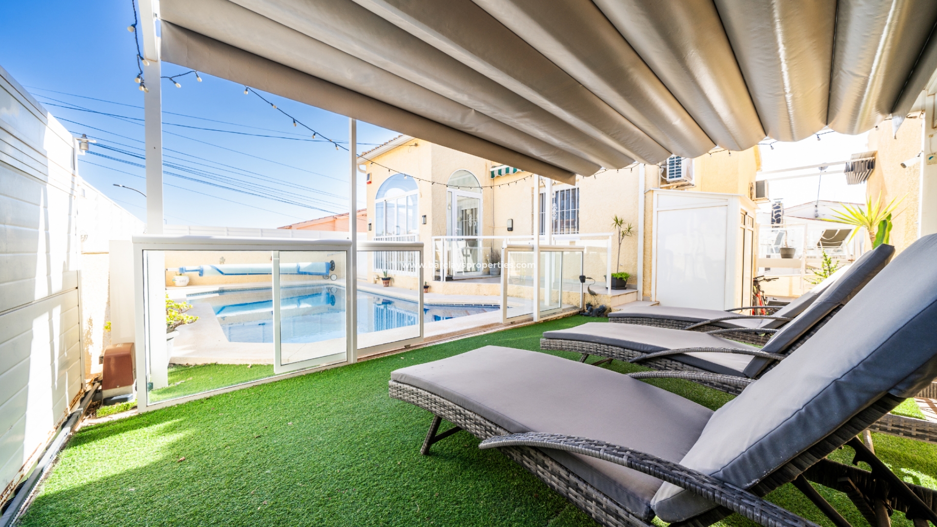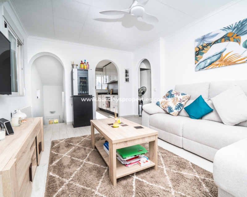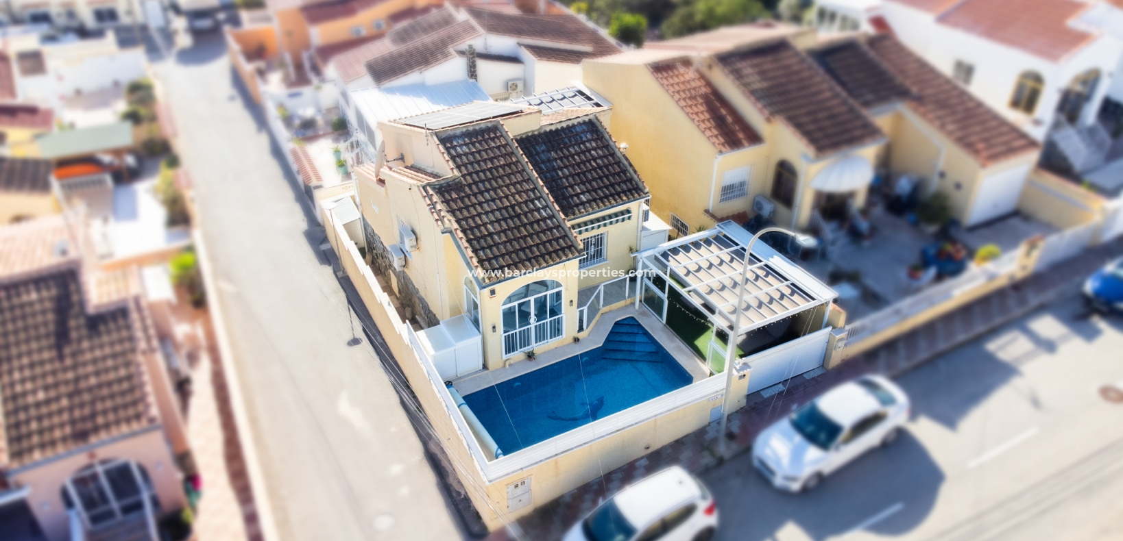 Op de bovenverdieping bevat de hoofdvilla een lichte, betegelde veranda met uitzicht op het zwembad, een ruime woonkamer met airconditioning en plafondventilator, twee slaapkamers met inbouwkasten, airconditioning en plafondventilatoren, een gerenoveerde, aparte inbouwkeuken met toegang tot de wasruimte en een verhoogd achterterras met eet- en zonnengebieden die een mooi uitzicht bieden op Guardamar del Segura.