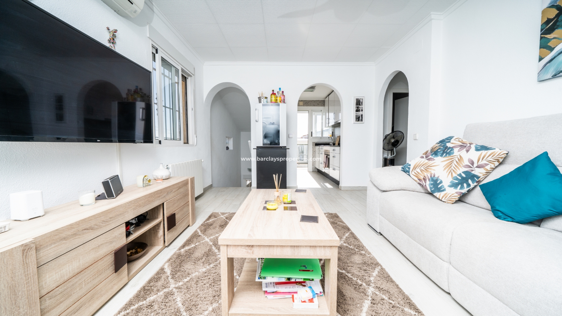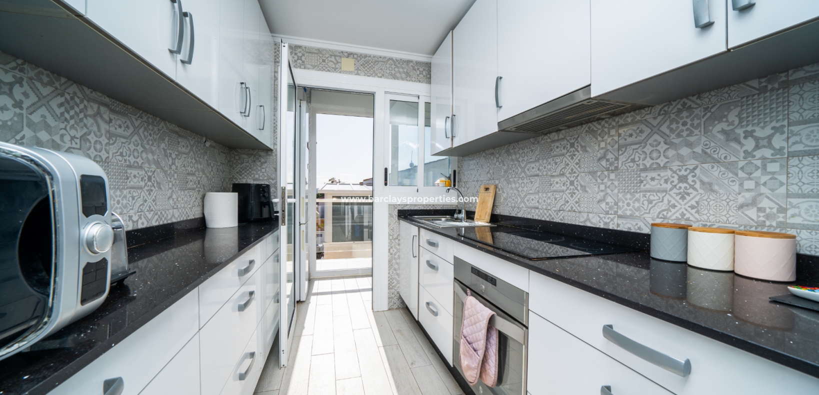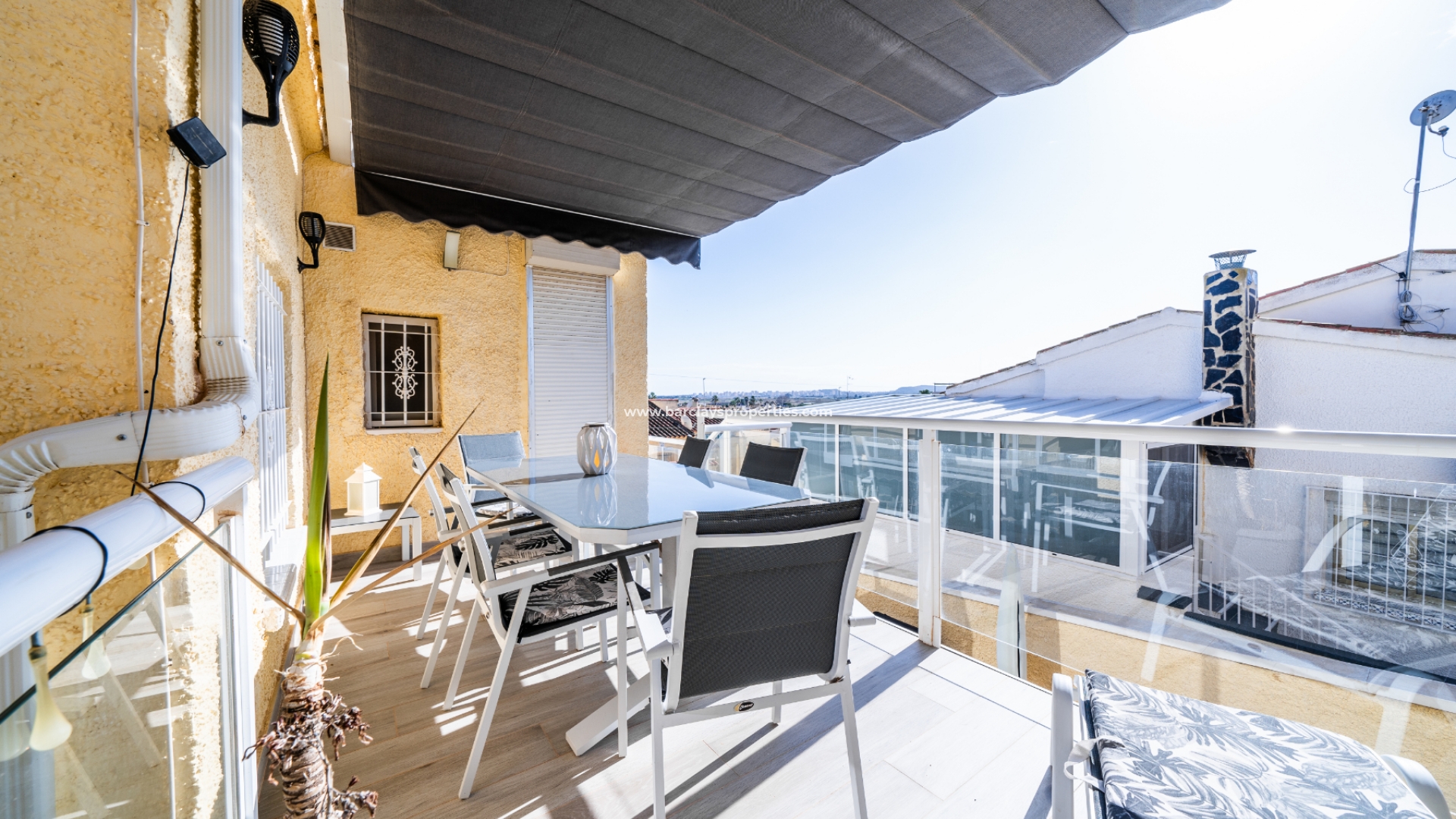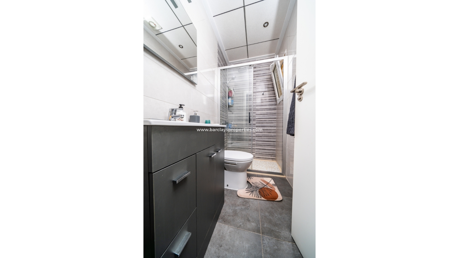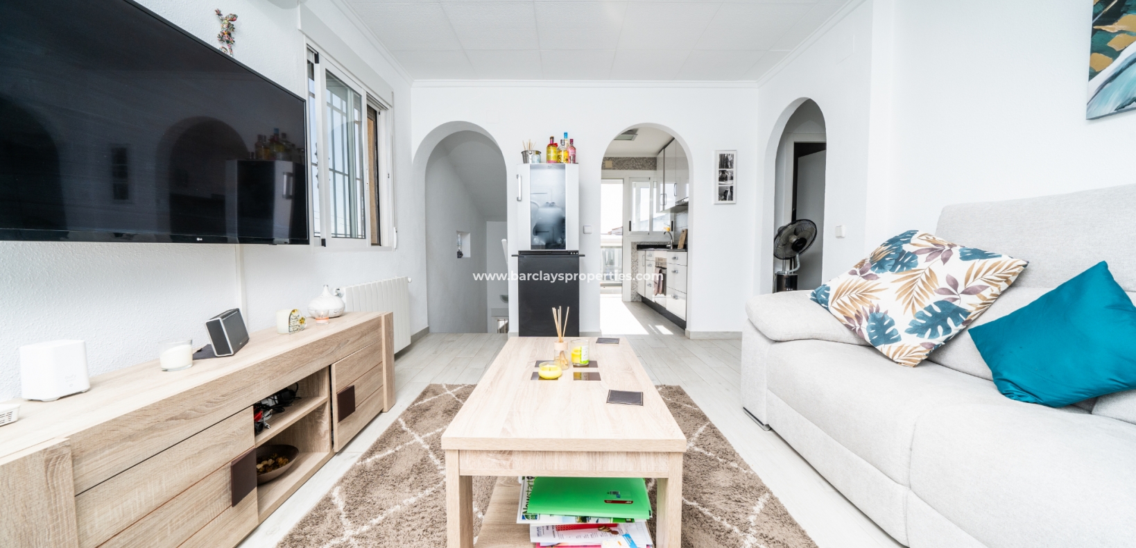 Op de bovenverdieping bevat de hoofdvilla een lichte, betegelde veranda met uitzicht op het zwembad, een ruime woonkamer met airconditioning en plafondventilator, twee slaapkamers met inbouwkasten, airconditioning en plafondventilatoren, een gerenoveerde, aparte inbouwkeuken met toegang tot de wasruimte en een verhoogd achterterras met eet- en zonnengebieden die een mooi uitzicht bieden op Guardamar del Segura.