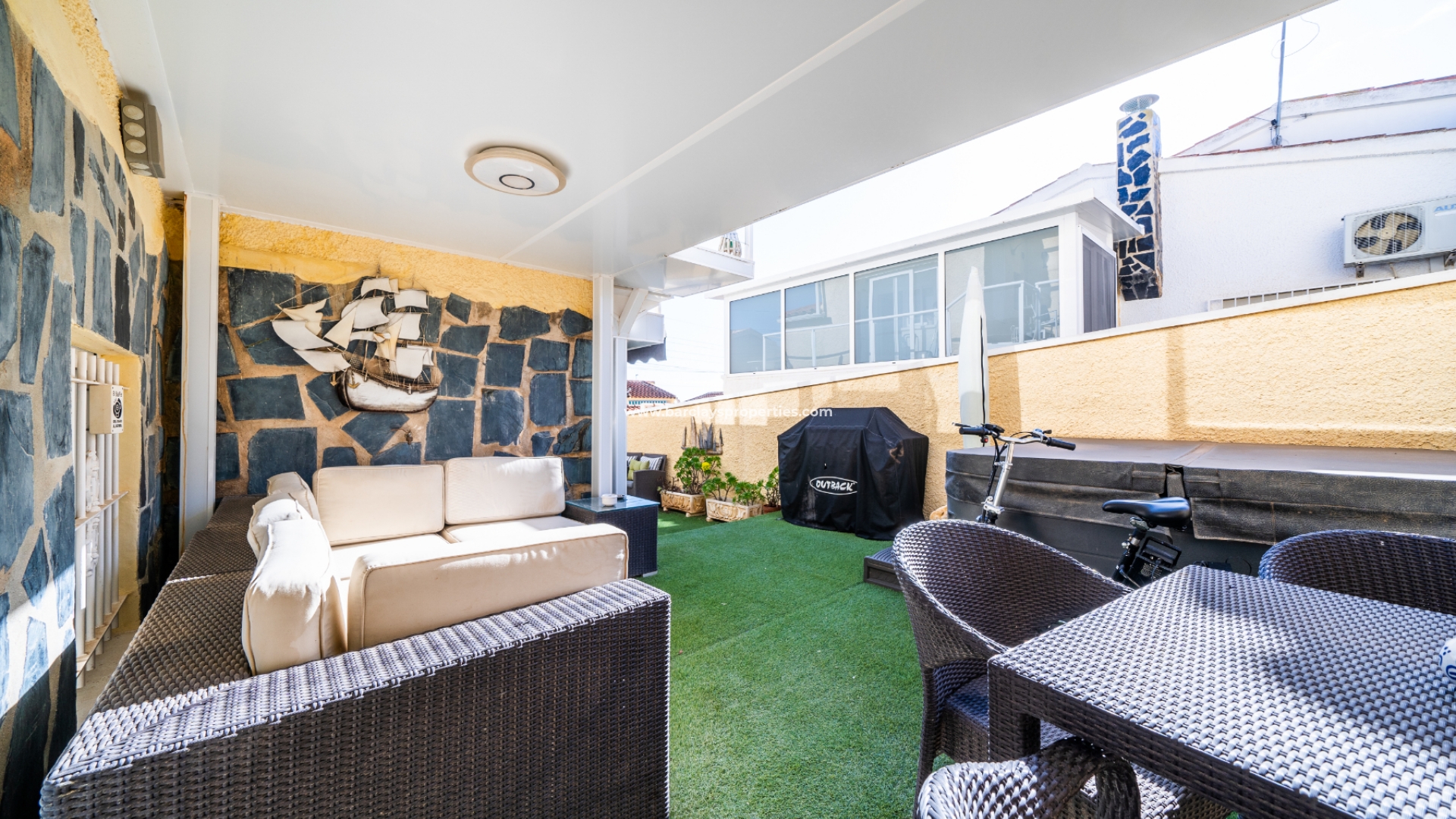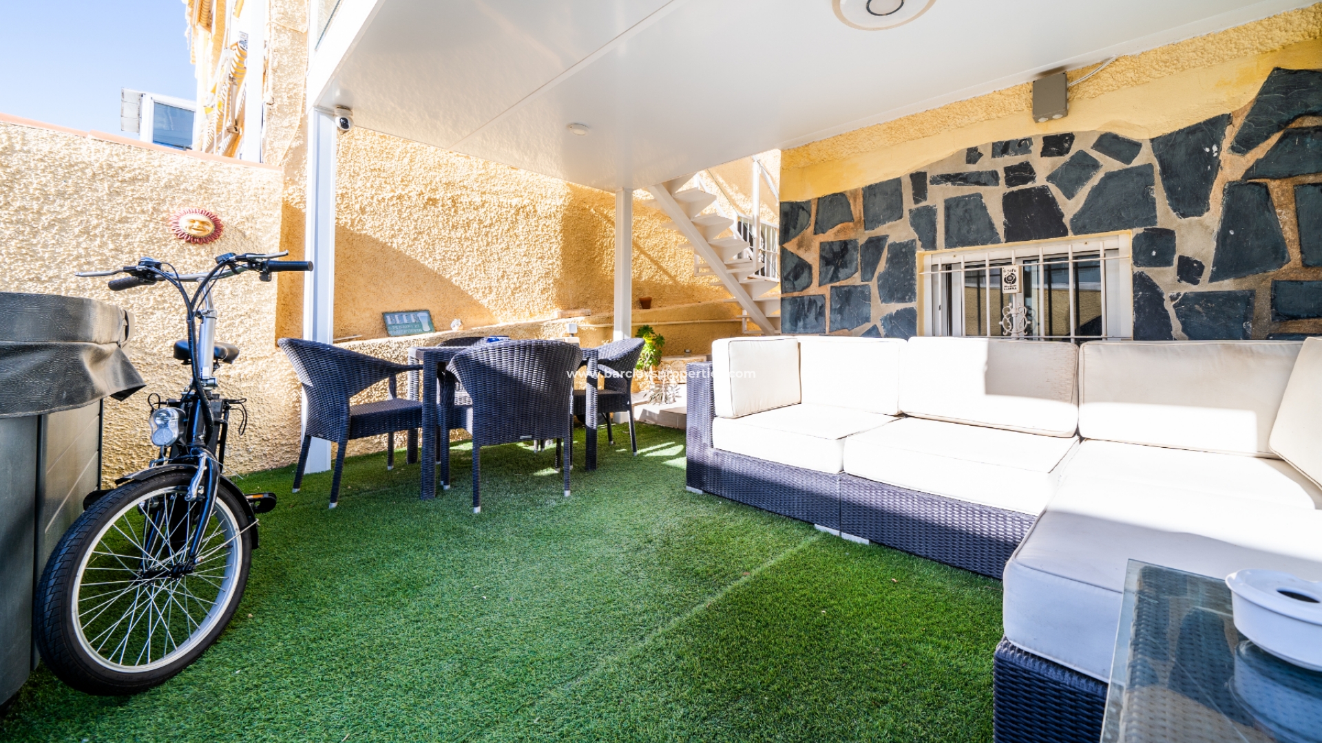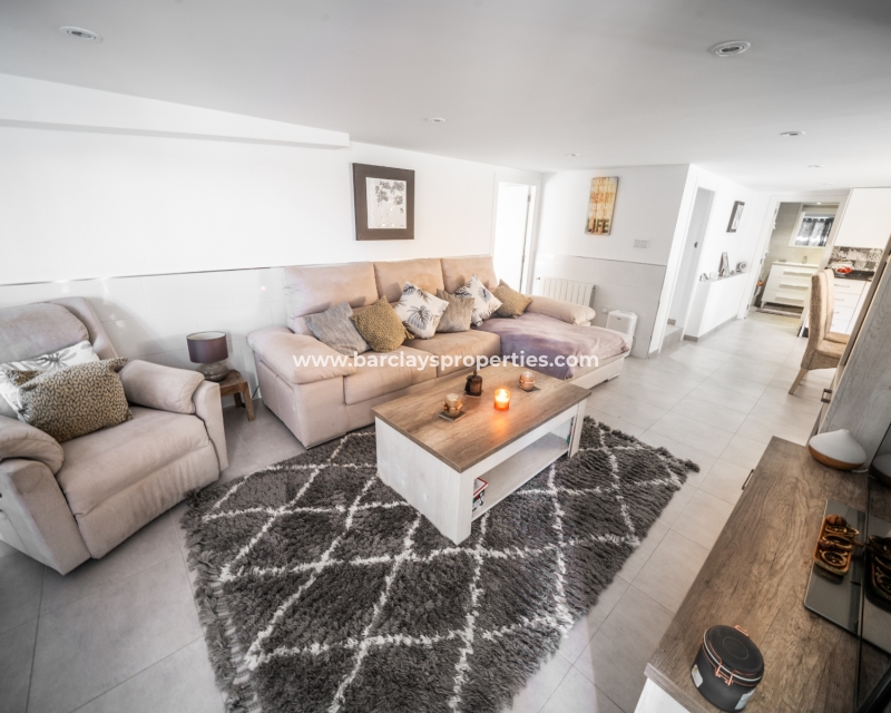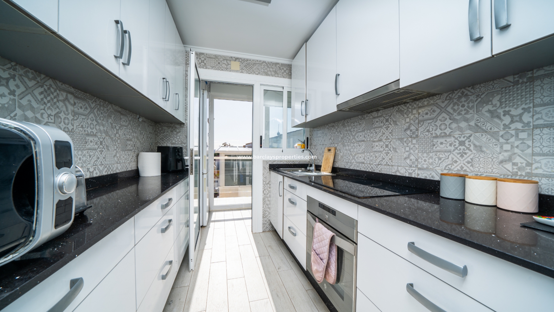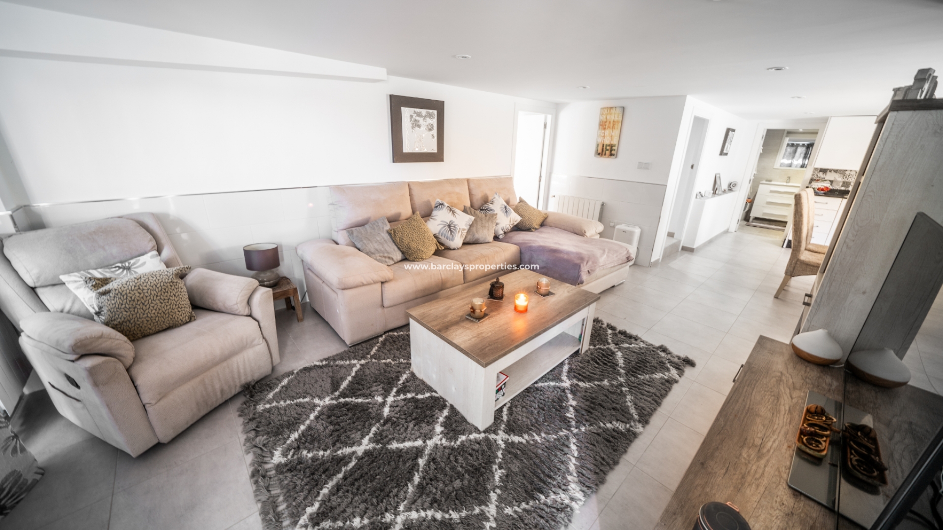 Op de bovenverdieping bevat de hoofdvilla een lichte, betegelde veranda met uitzicht op het zwembad, een ruime woonkamer met airconditioning en plafondventilator, twee slaapkamers met inbouwkasten, airconditioning en plafondventilatoren, een gerenoveerde, aparte inbouwkeuken met toegang tot de wasruimte en een verhoogd achterterras met eet- en zonnengebieden die een mooi uitzicht bieden op Guardamar del Segura.