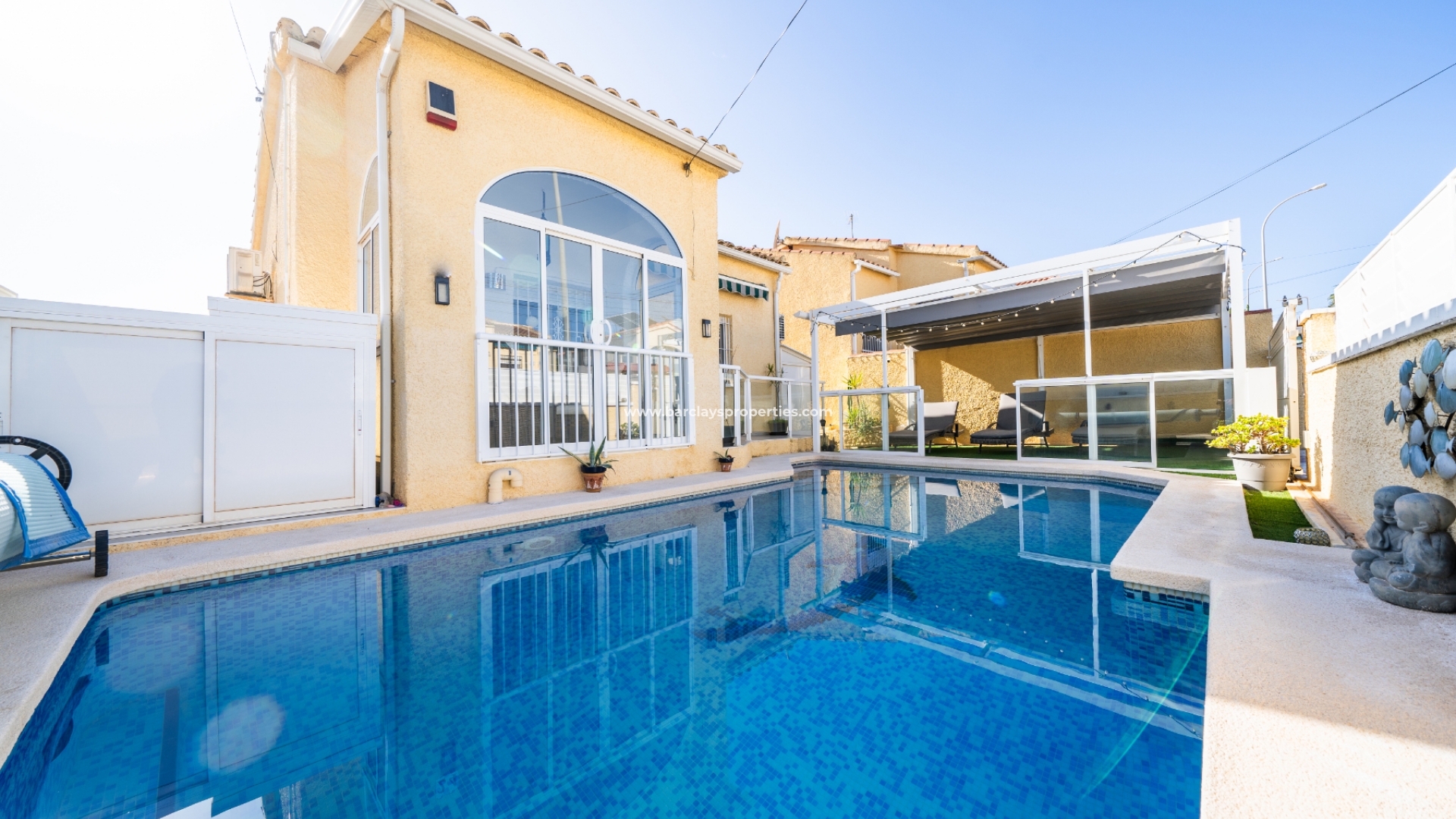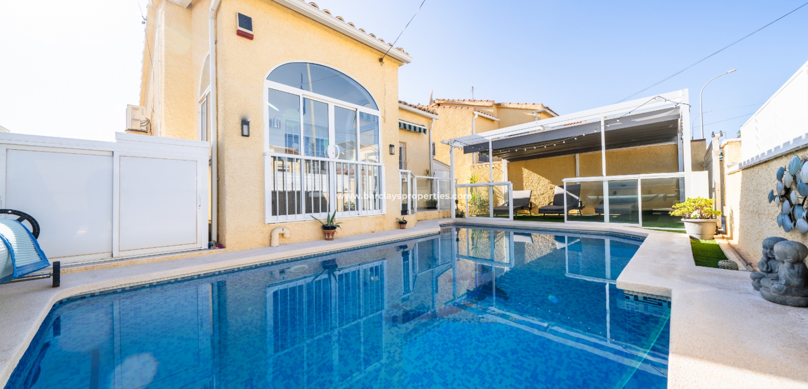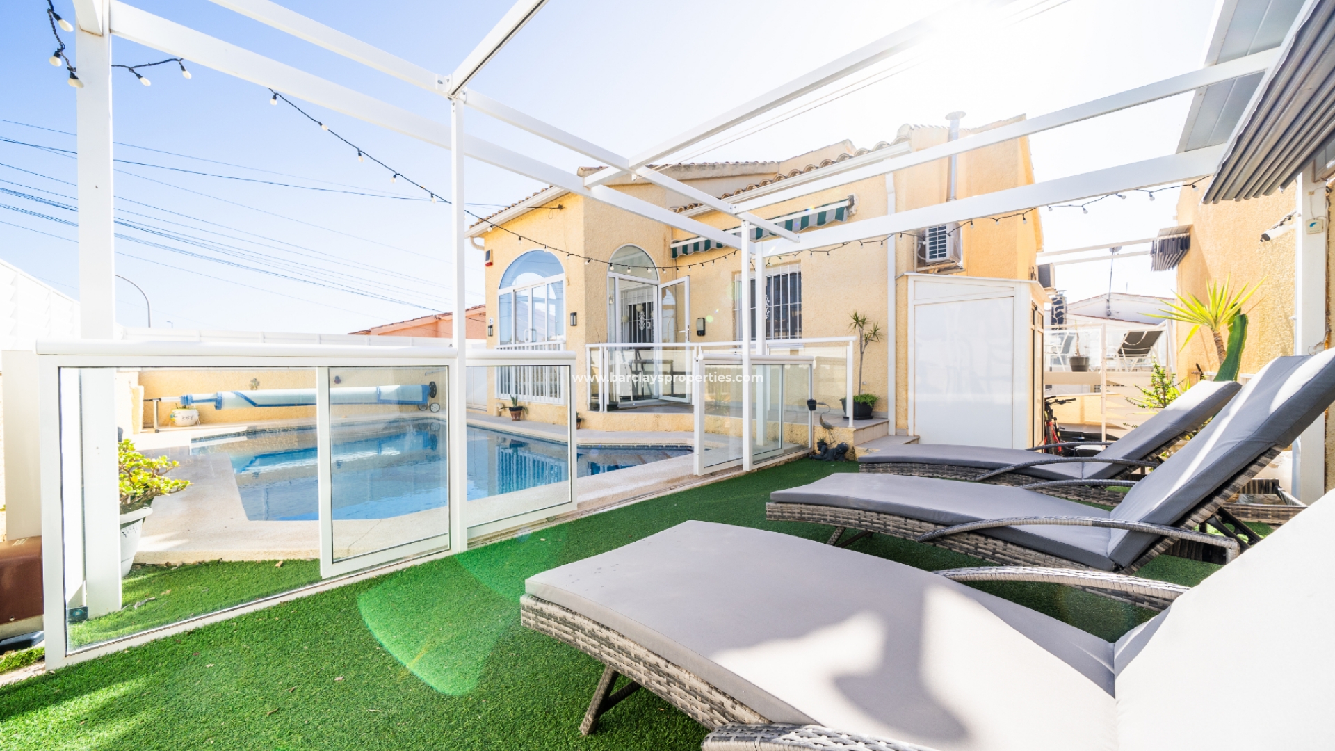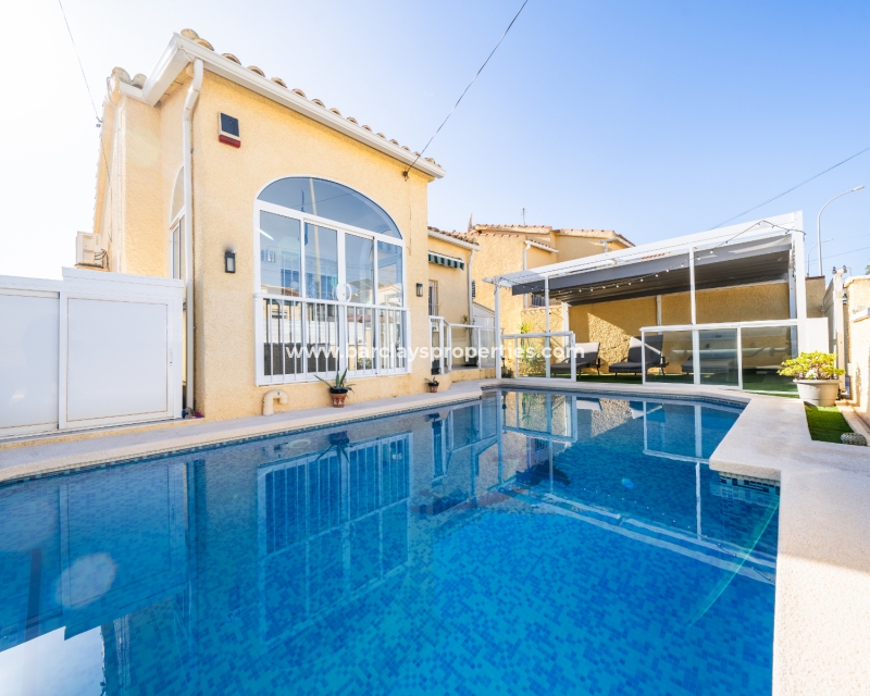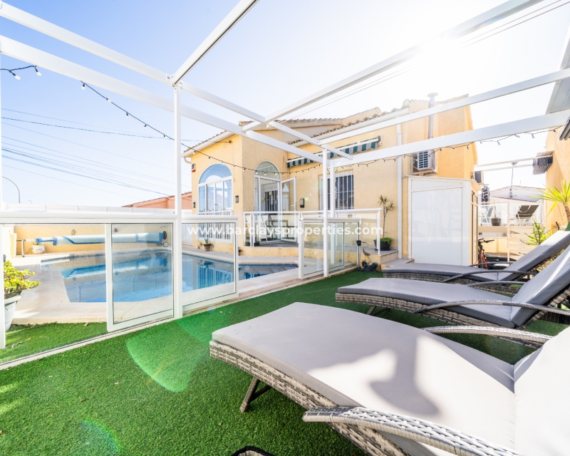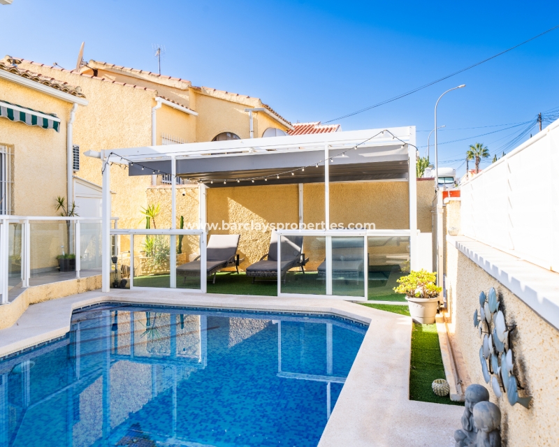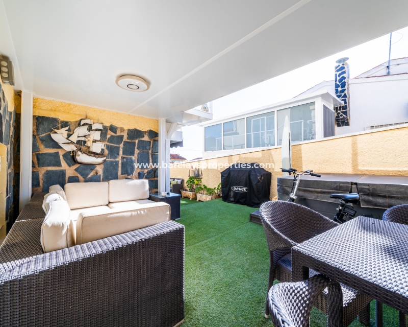 Deze uitgebreide vrijstaande villa in Urb. La Marina biedt ruime woonruimtes met moderne upgrades en uitstekende voorzieningen, waardoor het een veelzijdig pand is voor zowel gezinsleven als het ontvangen van gasten. De villa beschikt over ✅een privé verwarmd zwembad van 7 x 3 meter en een luxueuze jacuzzi voor zes personen, die de perfecte plekken voor ontspanning bieden. De villa is gunstig gelegen, op slechts 10 minuten lopen van het Consum-plein, 5 minuten met de auto van de prachtige stranden van “Playa de La Marina” en Playa del Pinet, en slechts 25 minuten van de luchthaven Alicante-Elche via de nationale route N-332.