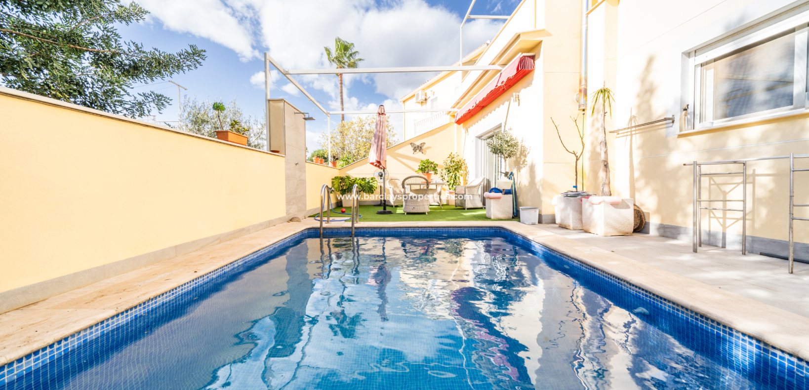 De buitenruimte is volledig betegeld en omsloten, wat minimaal onderhoud vergt. De hoge privacyomheining beschermt de woning tegen inkijk vanaf de straat, waardoor een rustige sfeer ontstaat. Aan de achterzijde biedt een privéterras de perfecte plek voor buiten dineren of ontspannen bij het ➡️ fonkelende zwembad. Een buitendouche voegt gemak toe na een verfrissende duik.