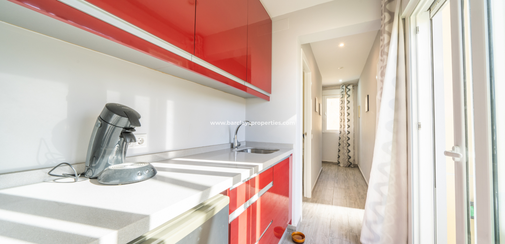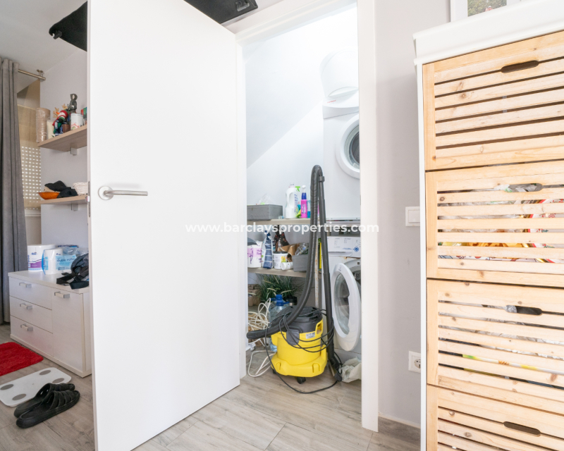 De Amerikaanse moderne keuken is voorzien van moderne apparatuur en biedt alles wat nodig is om moeiteloos te koken en gasten te ontvangen. Een doucheruimte verhoogt de functionaliteit van de begane grond, terwijl de goed ingerichte slaapkamer comfort en gemak biedt voor gasten of gelijkvloers wonen, met een spiegelende ingebouwde kast en airconditioning. De bijkeuken, uitgerust met een wasmachine en droger, houdt huishoudelijke taken netjes uit het zicht.