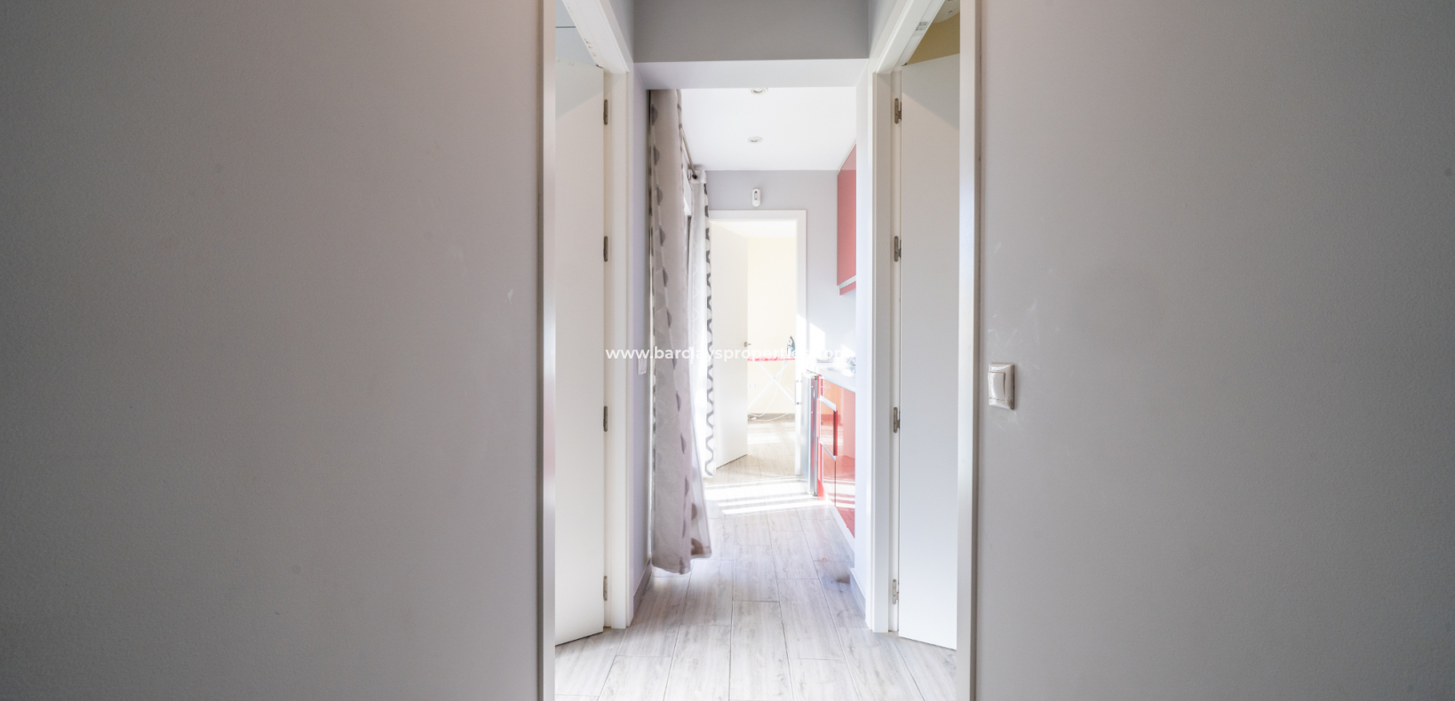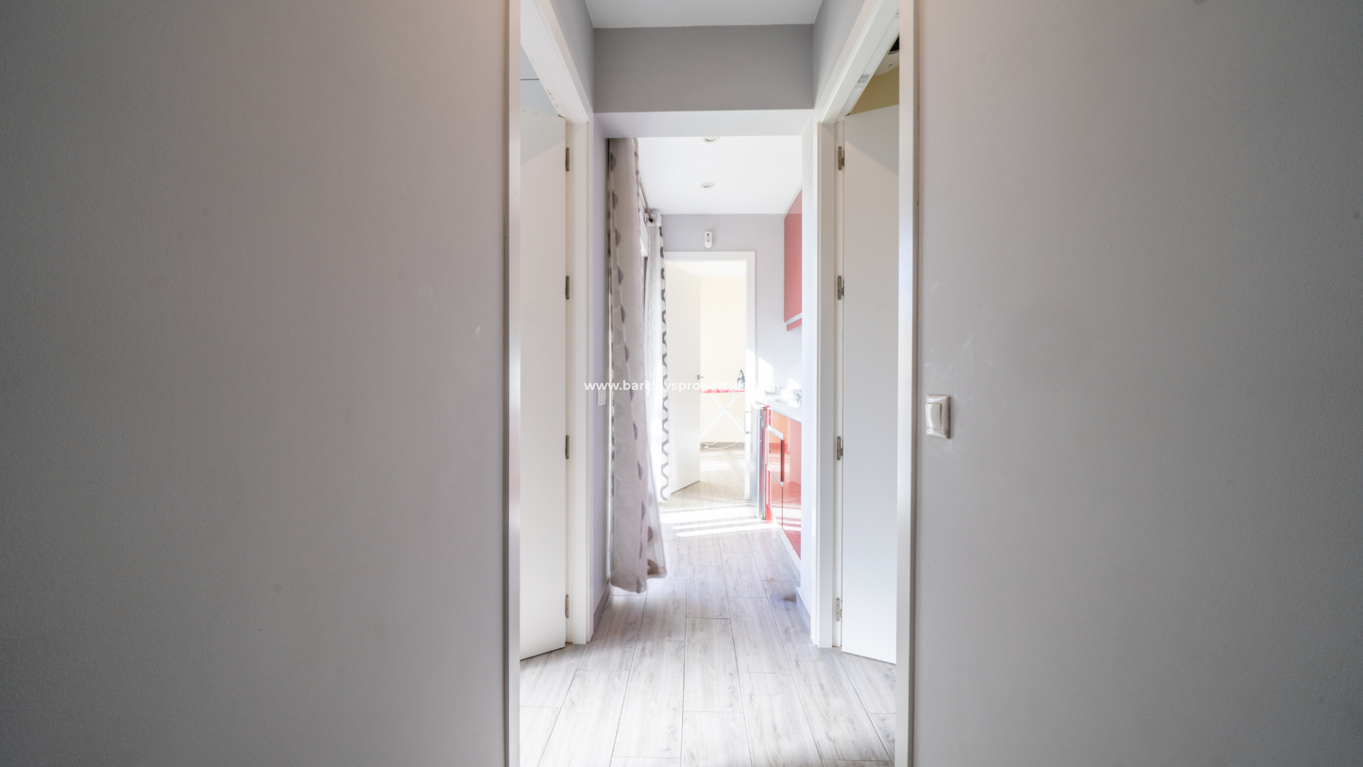 De bovenverdieping zet het doordachte ontwerp van de woning voort met een lichte hal die een handige pantry-keuken biedt voor extra opslag en functionaliteit. Twee ruime slaapkamers bieden volop ruimte voor ontspanning en rust, beide zorgvuldig ontworpen om maximaal comfort te garanderen. De moderne badkamer op deze verdieping is stijlvol afgewerkt met moderne voorzieningen. Een privébalkon vanuit deze verdieping biedt een rustige plek om van de zon te genieten of 's ochtends koffie te drinken.