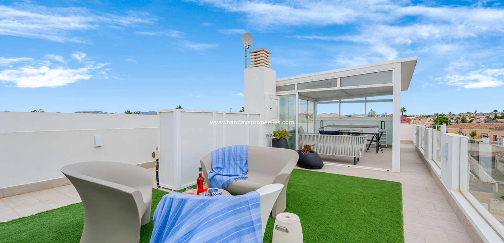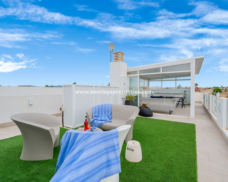 Op de bovenverdieping bevindt zich de ruime hoofdslaapkamer met een ✅ensuite badkamer, een inloopkast en toegang tot een privéterras. Twee extra slaapkamers, waarvan er een momenteel als kantoor wordt gebruikt, samen met een gedeelde badkamer, maken de eerste verdieping compleet. Het terras leidt naar een trap die omhoog leidt naar een indrukwekkend solarium met panoramisch uitzicht op de omliggende omgeving. Deze open ruimte is verdeeld in een ontspanningszone met kunstgras en een comfortabele zithoek, evenals een gecrystalliseerd gedeelte met een eetgedeelte, een kookbar en apparaten, perfect om gasten te ontvangen.
