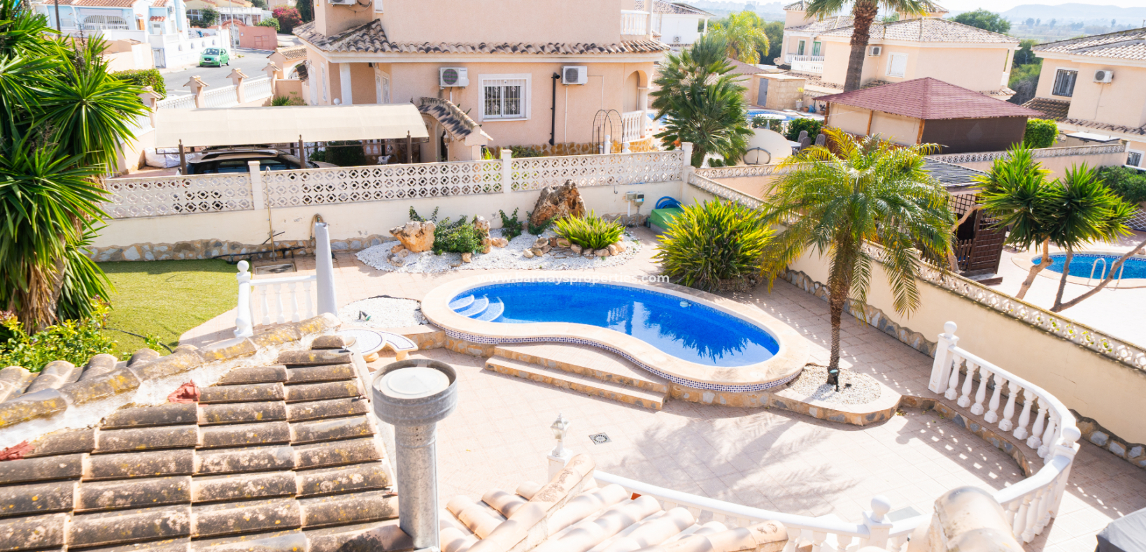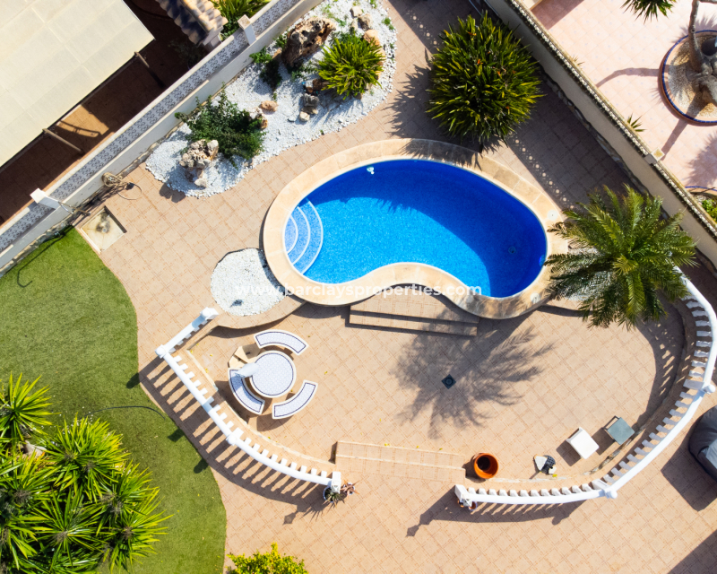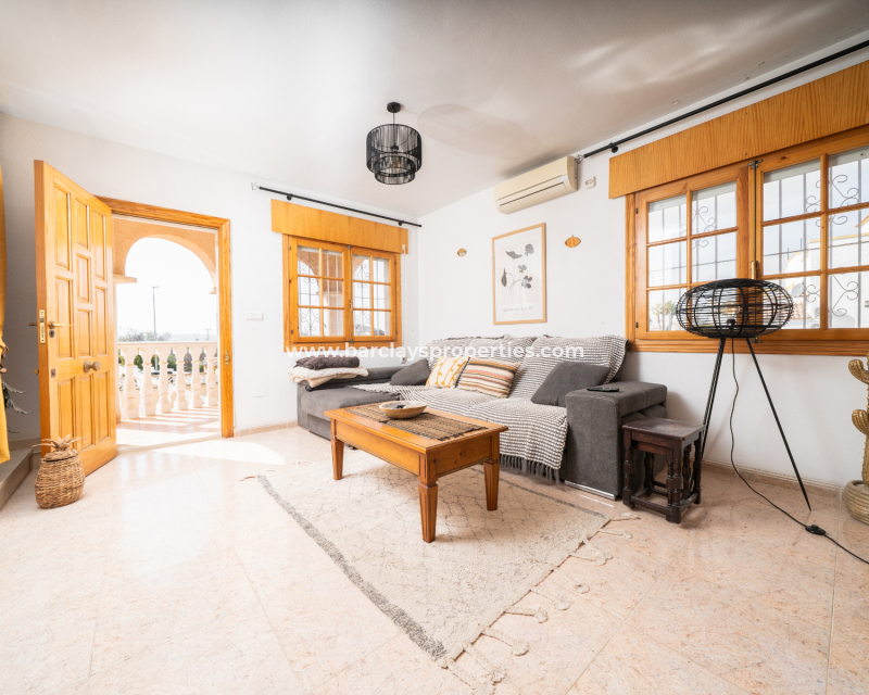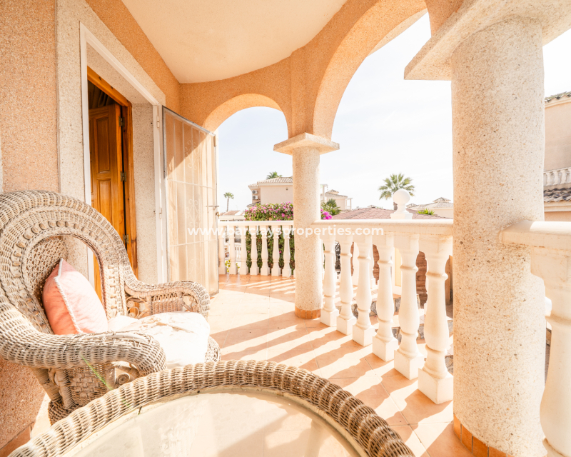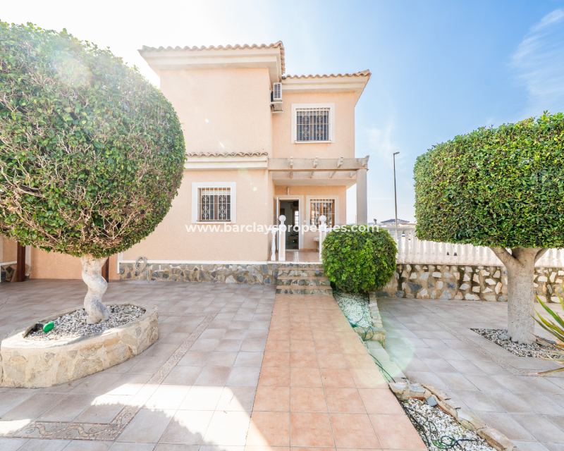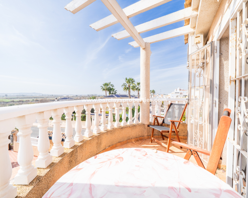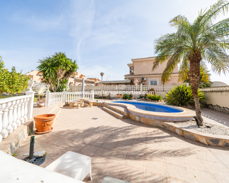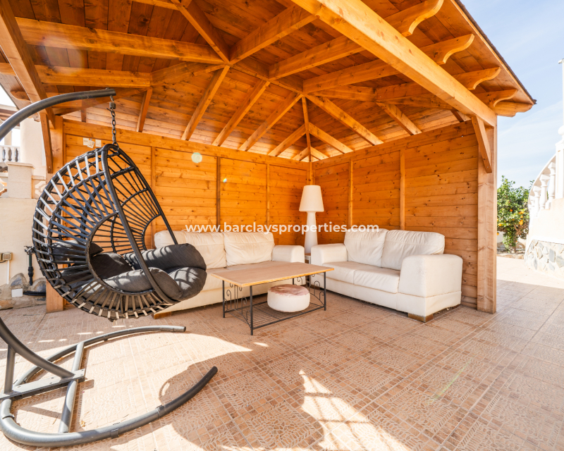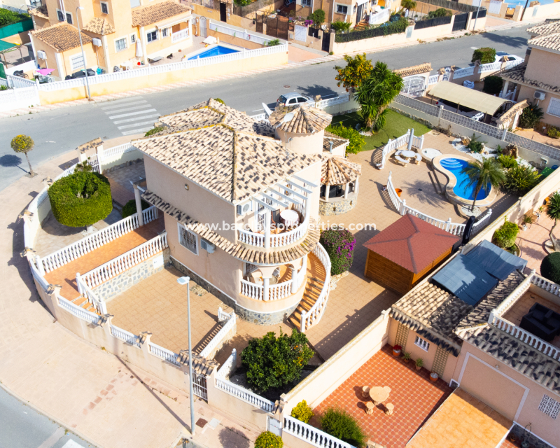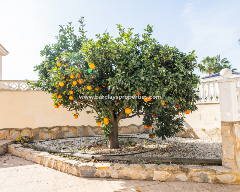 Deze vrijstaande villa in het “Azucena”-model, gelegen in Urb La Marina, biedt een ✅ruim hoekperceel van 555 m2 met privacy en rust. De geplaveide tuin wordt aangevuld met een buitenberging, sinaasappel- en citroenbomen, een niervormig ✅privézwembad, een pergola met een buitenlounge en een buitendouche. Een carport met een gesloten ingang biedt veilige parkeergelegenheid, terwijl een buitenkeuken met een spoelbak en een gasbarbecue een ideale ruimte voor buitenvermaak creëert. Buitenverlichting versterkt de sfeer, waardoor de buitenruimtes op elk moment van de dag aangenaam zijn.