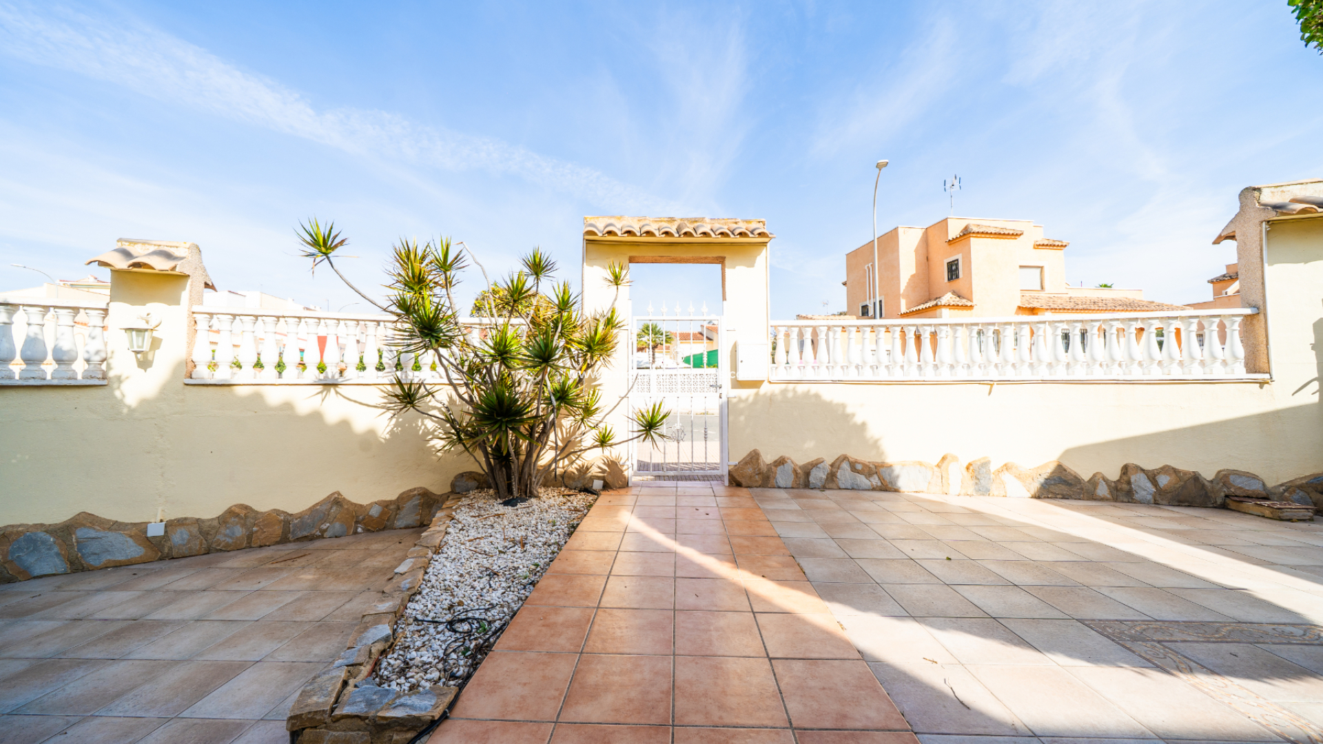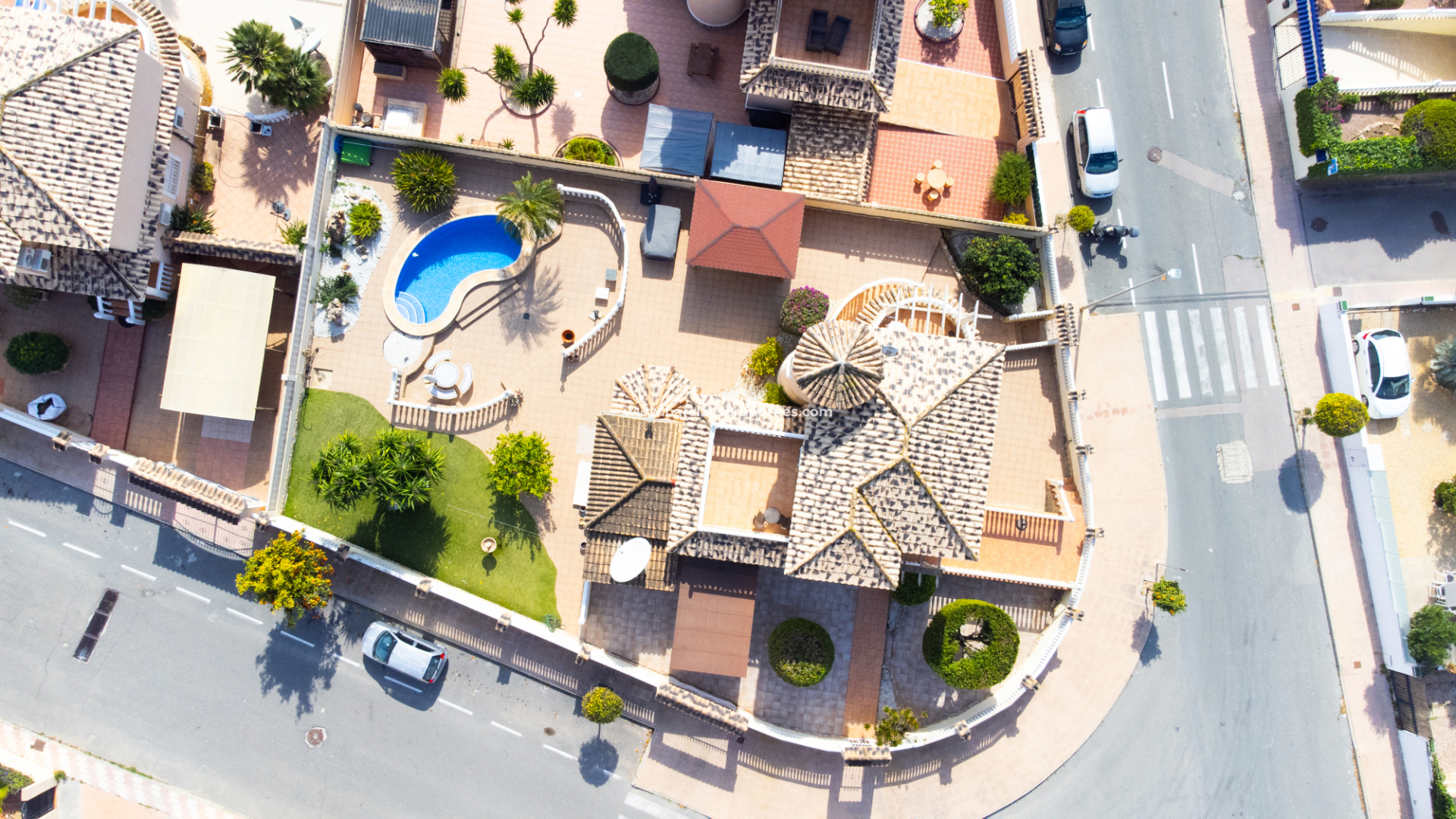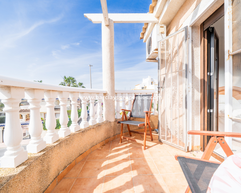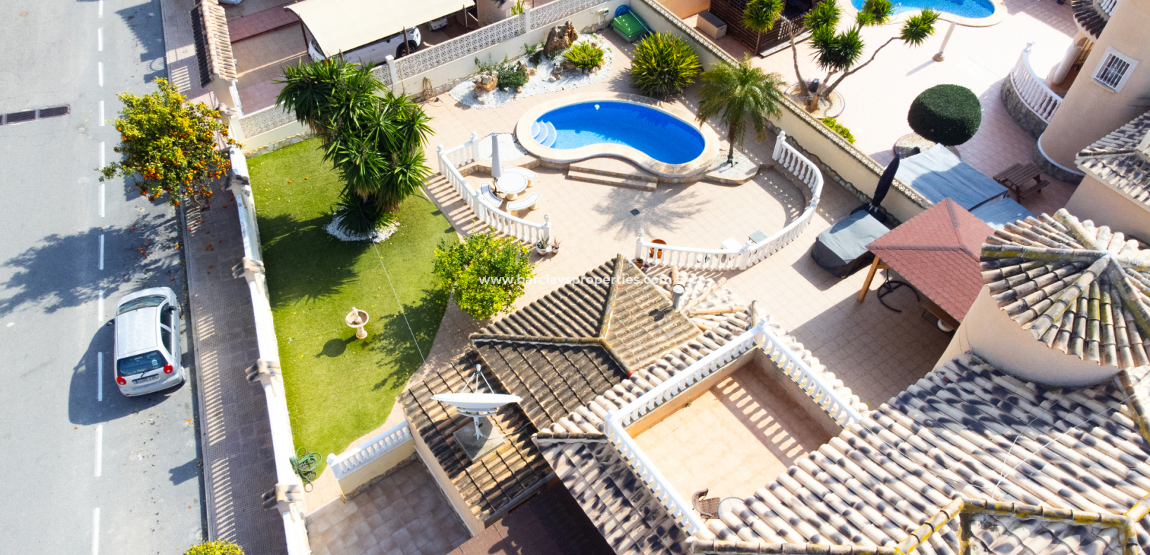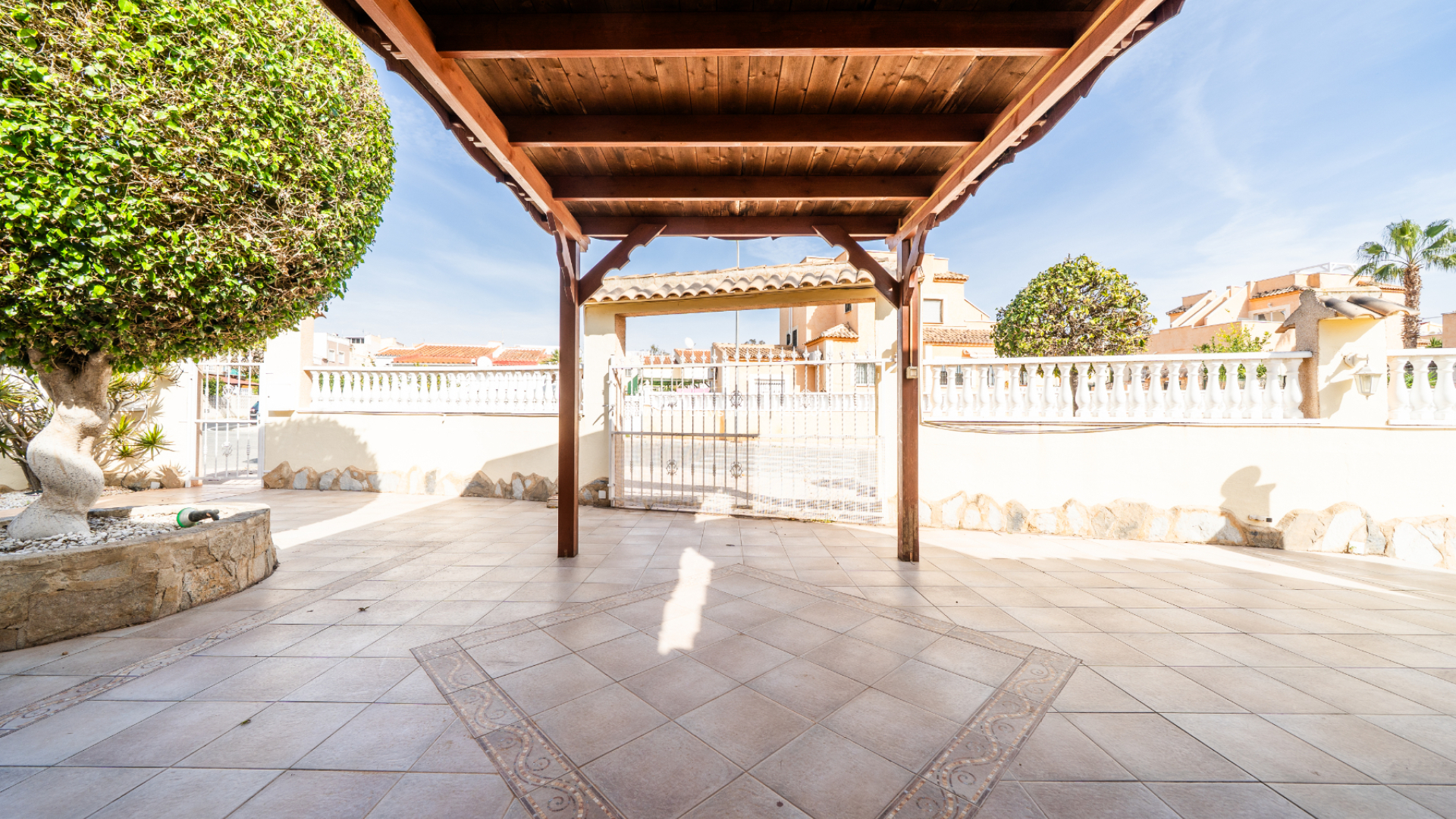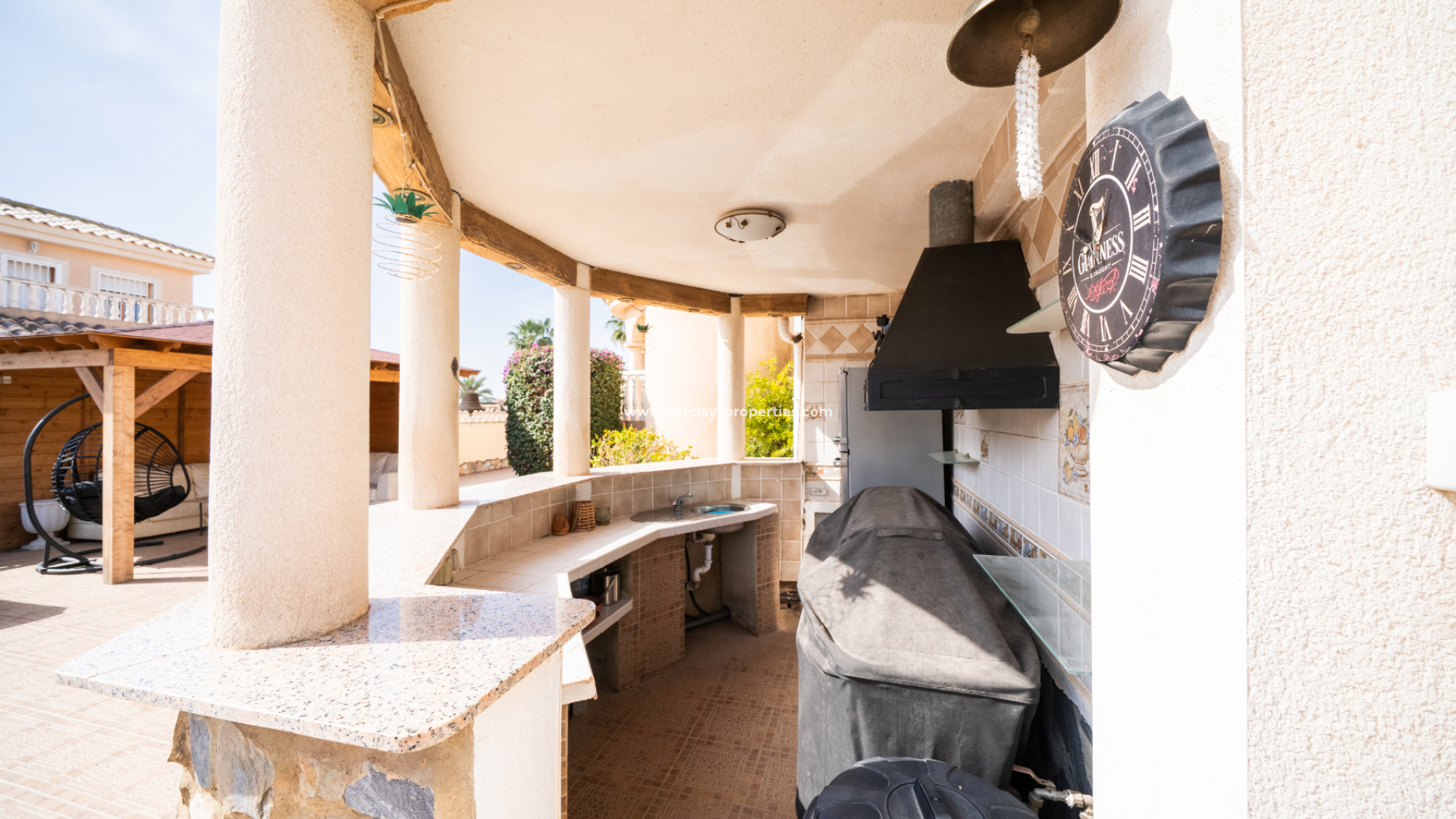 Deze vrijstaande villa in het “Azucena”-model, gelegen in Urb La Marina, biedt een ✅ruim hoekperceel van 555 m2 met privacy en rust. De geplaveide tuin wordt aangevuld met een buitenberging, sinaasappel- en citroenbomen, een niervormig ✅privézwembad, een pergola met een buitenlounge en een buitendouche. Een carport met een gesloten ingang biedt veilige parkeergelegenheid, terwijl een buitenkeuken met een spoelbak en een gasbarbecue een ideale ruimte voor buitenvermaak creëert. Buitenverlichting versterkt de sfeer, waardoor de buitenruimtes op elk moment van de dag aangenaam zijn.