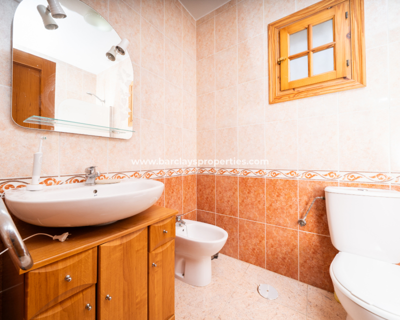 Op de begane grond bevindt zich een ruime woonkamer met airconditioning, die leidt naar een achterterras met uitzicht op het omliggende landschap. De ruime gerenoveerde keuken is voorzien van een afzuigkap, vaatwasser, oven, kookplaat, magnetron, ontbijtbalk, en een grote koelkast. Een ruime eetkamer stroomt naadloos door naar de tweede woonkamer en opent via terrasdeuren naar de tuin. De eerste slaapkamer bevindt zich op dit niveau, samen met een badkamer met douche, wastafel en toilet. Een opbergruimte biedt extra ruimte.