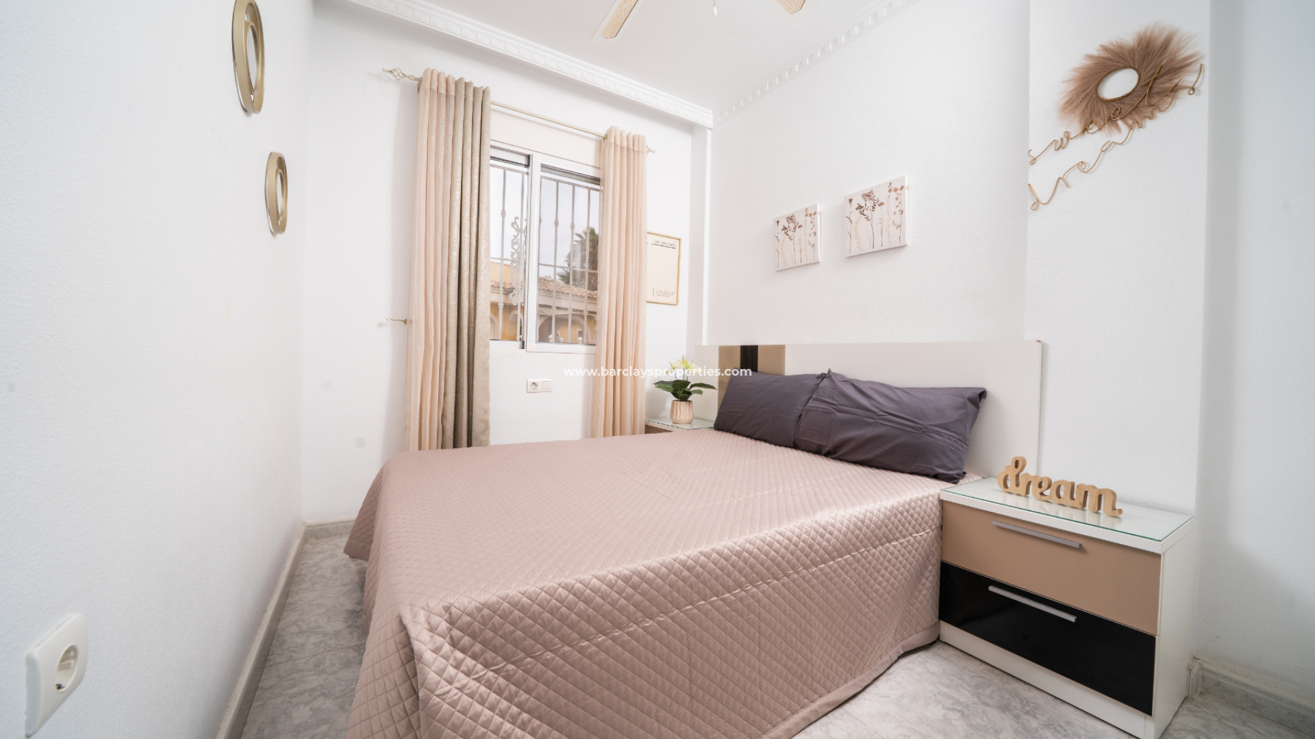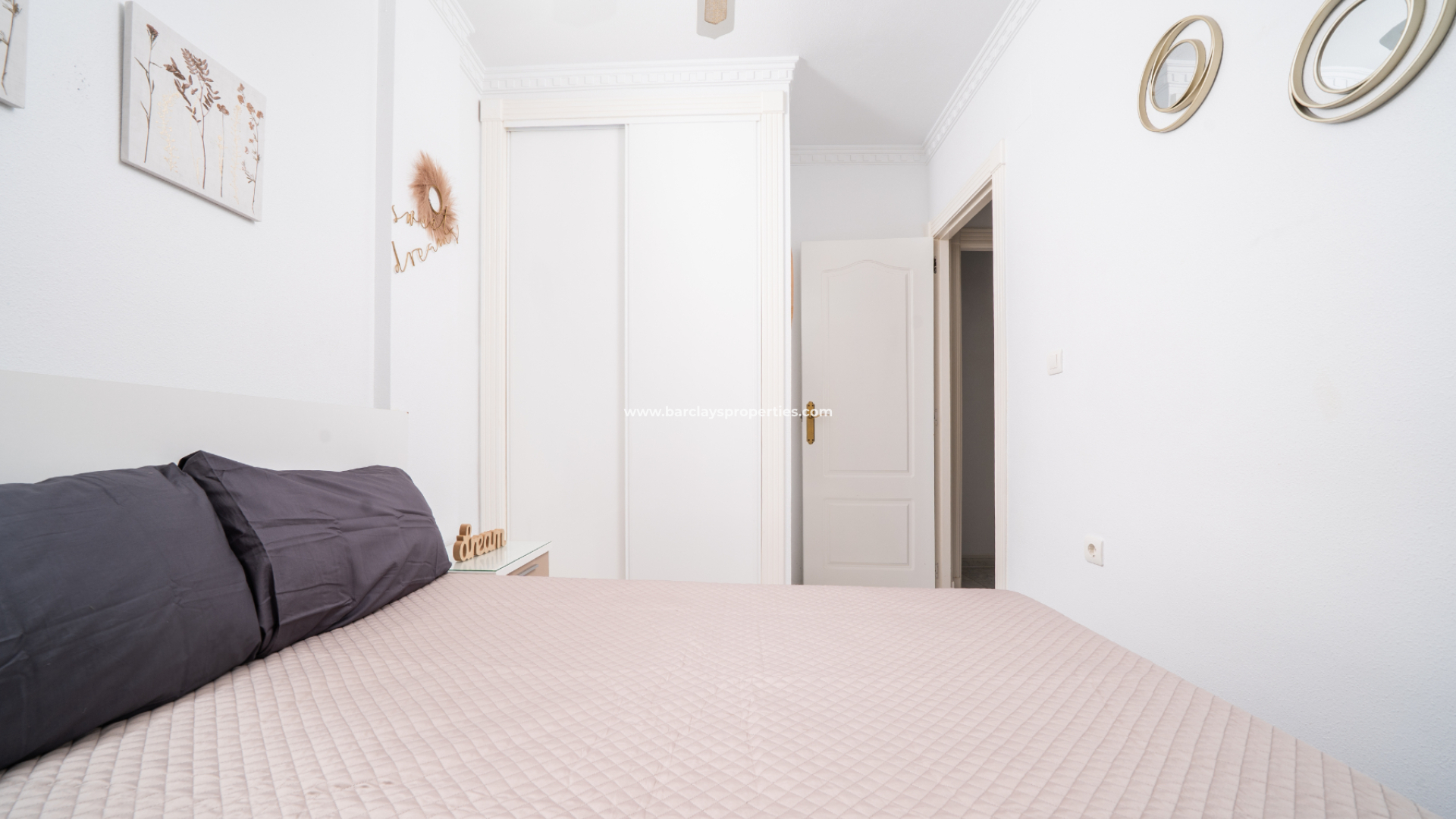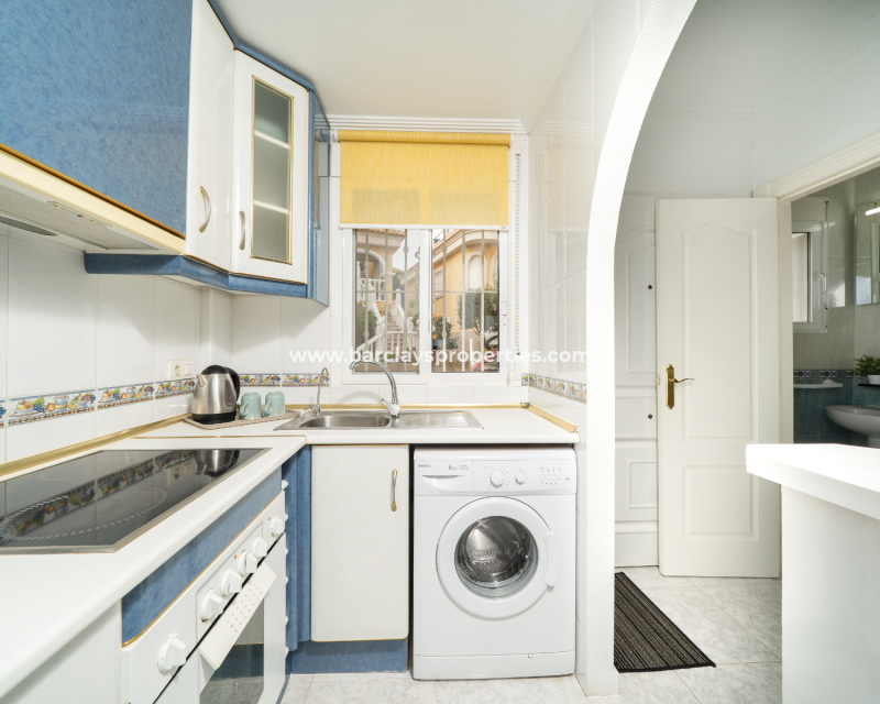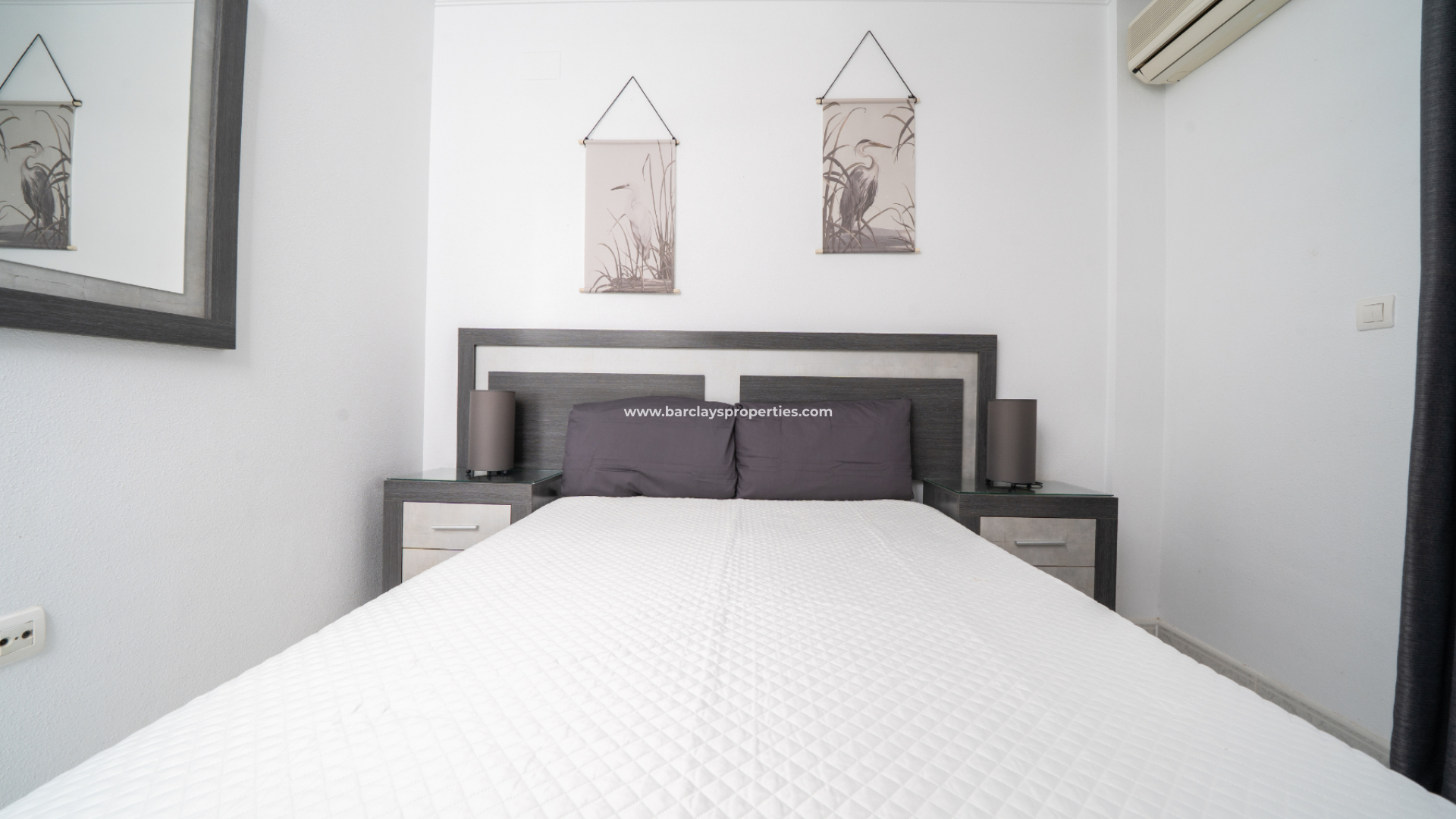 De woning heeft een wasruimte voor extra gemak en een complete badkamer met WC, wastafel, bidet en badkuip. De eerste slaapkamer is een tweepersoonskamer met een plafondventilator en inbouwkast. De tweede tweepersoonskamer heeft airconditioning, een plafondventilator, een inbouwkast en een eigen privé balkon met mooi uitzicht over het naburige stadje Guardamar del Segura.