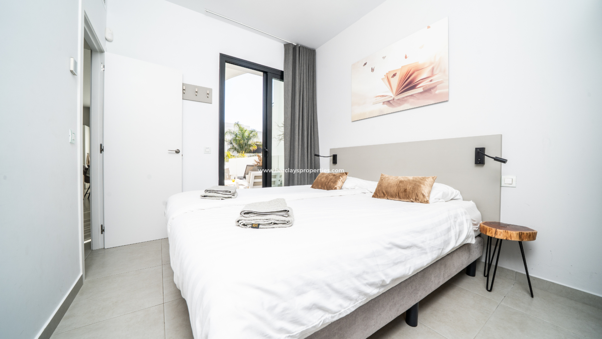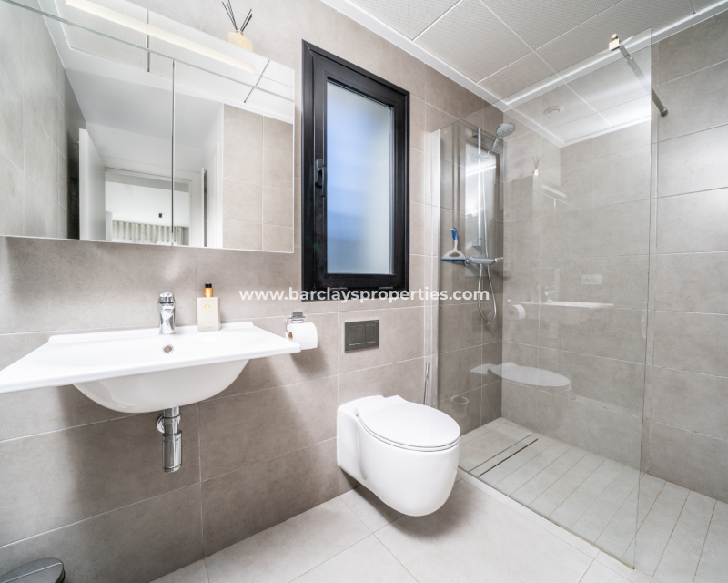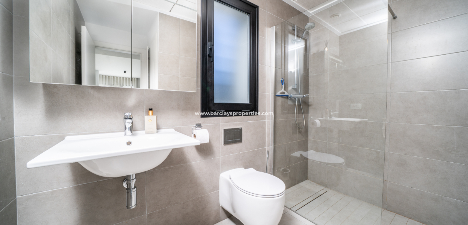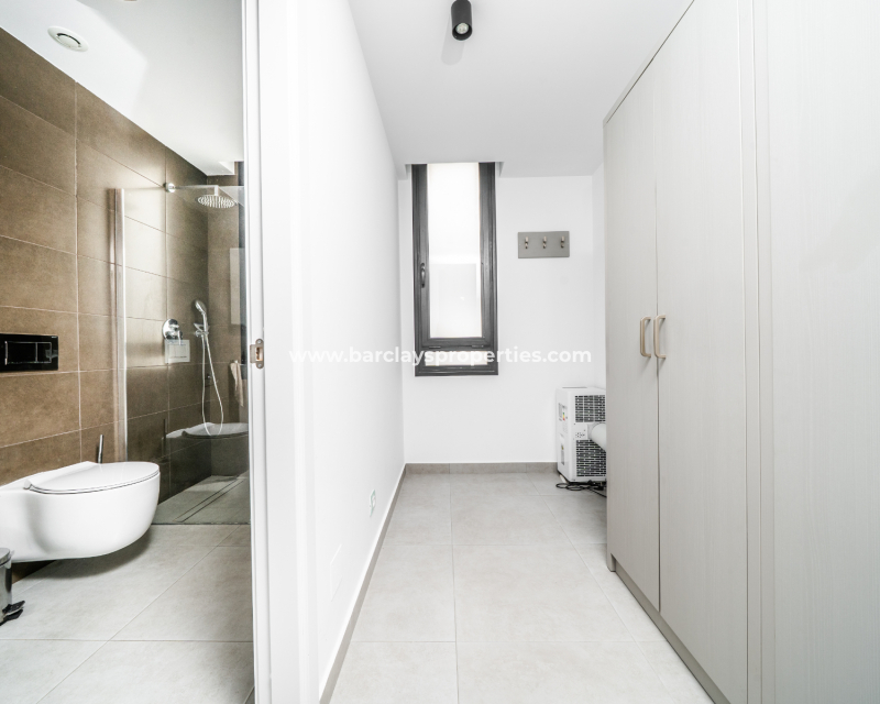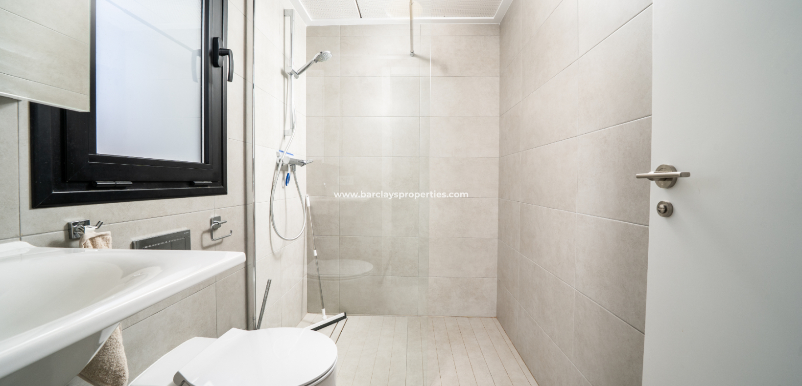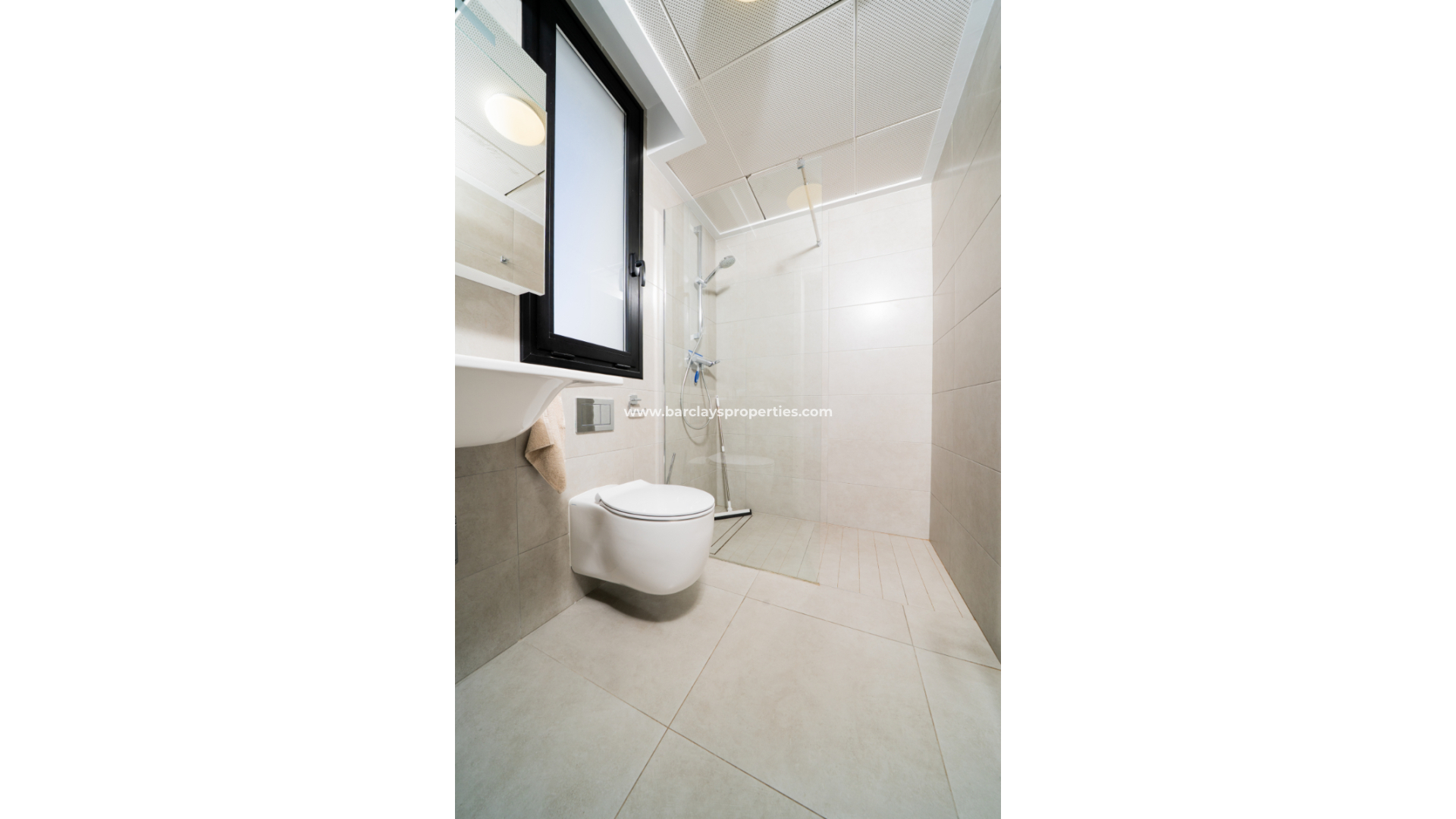 De begane grond beschikt over een tweepersoonsslaapkamer met directe toegang aan beide zijden tot de tuin en een badkamer met een inloopdouche, hangend toilet, wastafel en LED-spiegel. Boven bevat de tweede tweepersoonsslaapkamer een kledingkastgedeelte, een en-suite badkamer met alle moderne voorzieningen en patio deuren die toegang geven tot buiten. De master suite biedt extra privacy met een eigen en-suite badkamer, kledingkastgedeelte en een en-suite badkamer met inloopdouche en moderne voorzieningen. De hoofdslaapkamer heeft ook toegang tot het rondom zonneterras dat bereikbaar is vanuit de andere slaapkamer boven, evenals een deur vanaf de overloop.