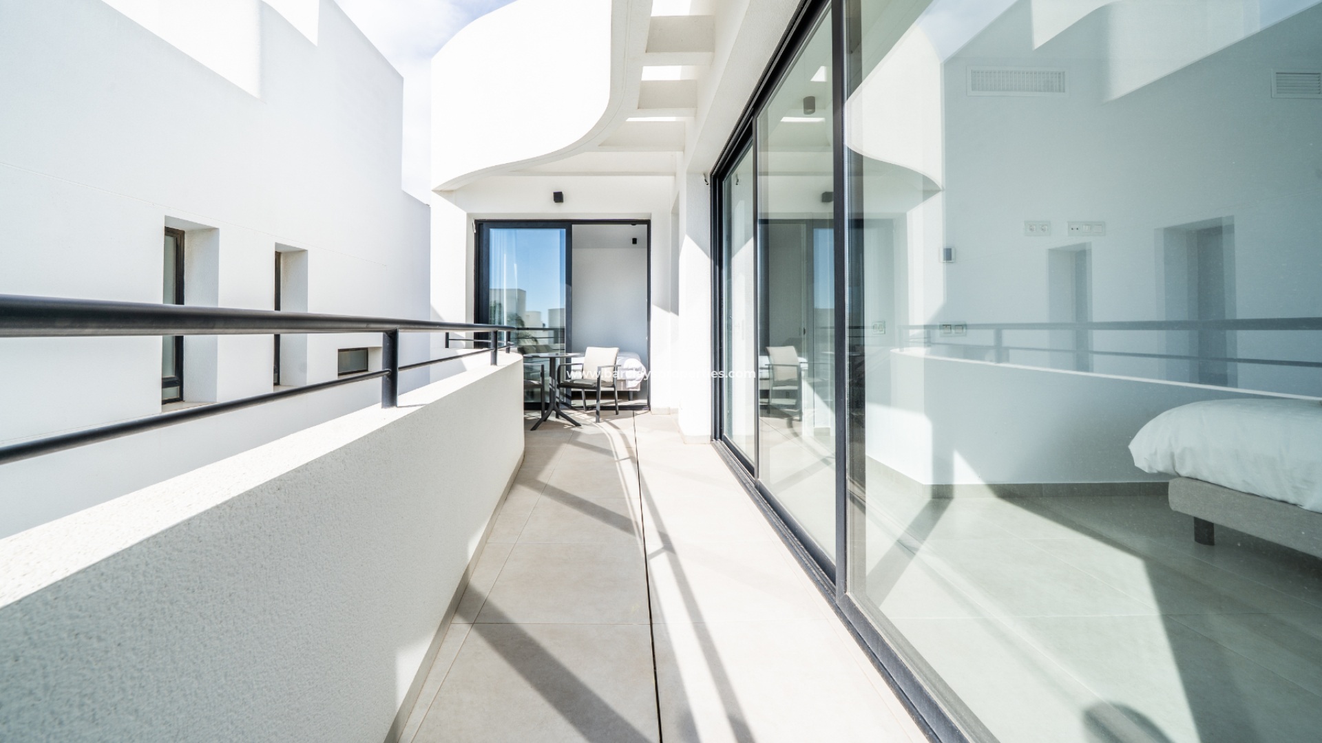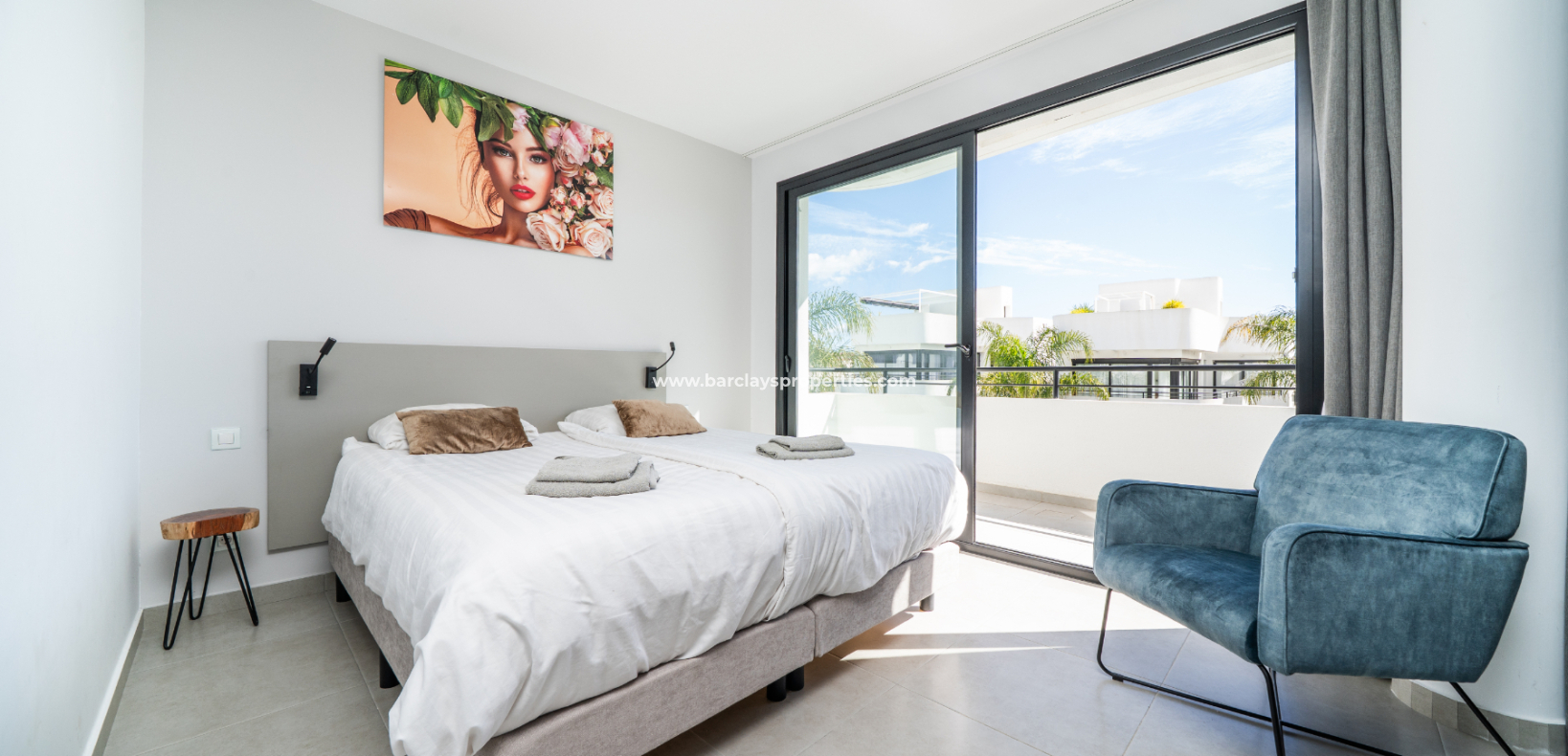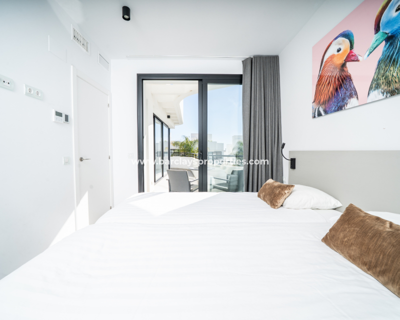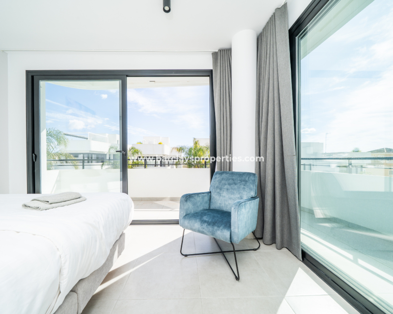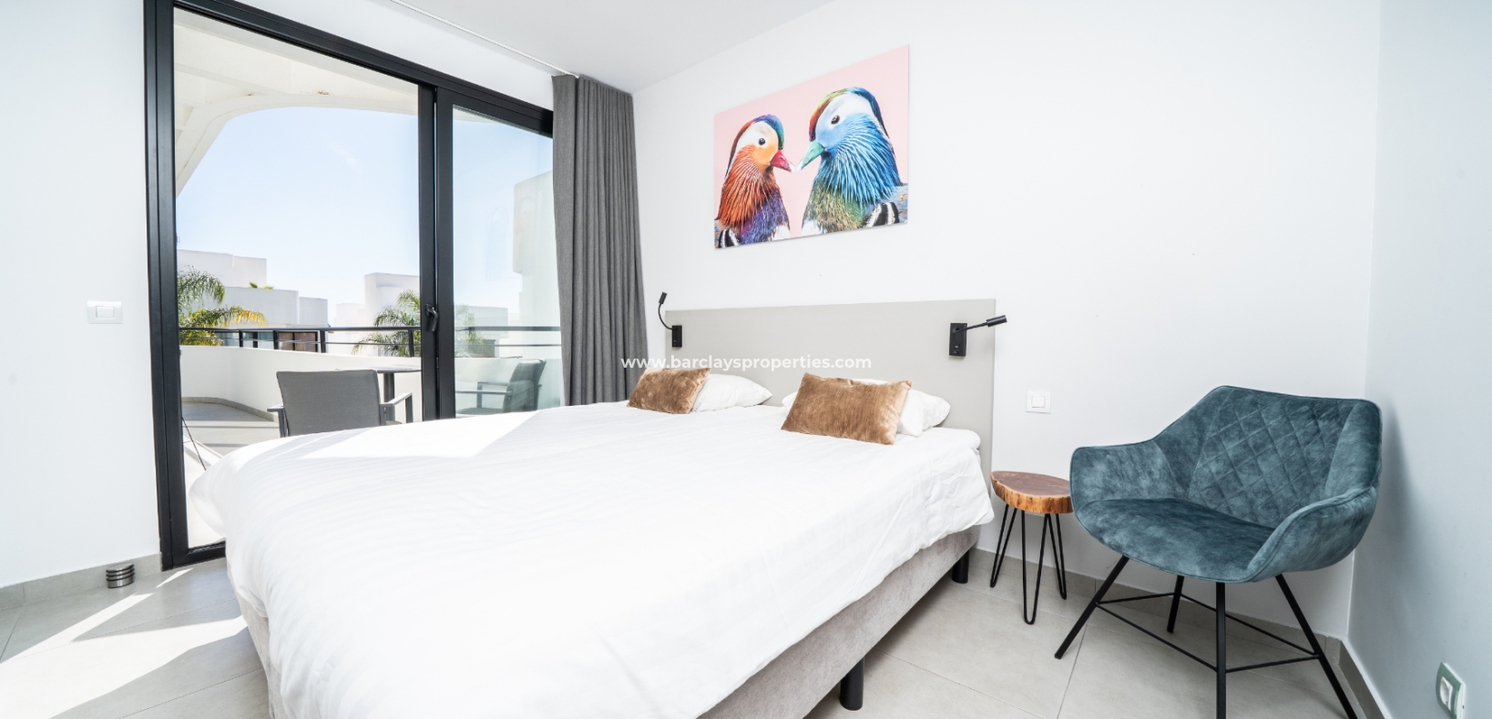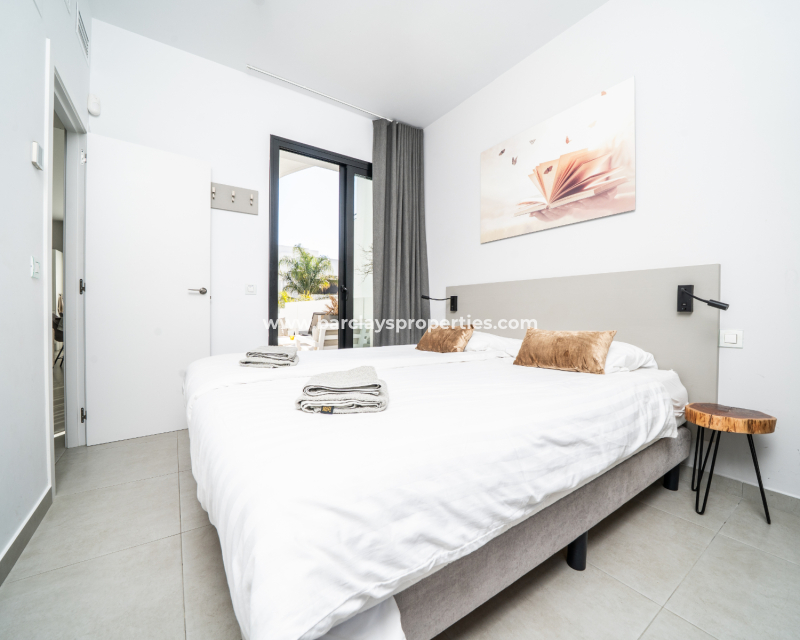 De begane grond beschikt over een tweepersoonsslaapkamer met directe toegang aan beide zijden tot de tuin en een badkamer met een inloopdouche, hangend toilet, wastafel en LED-spiegel. Boven bevat de tweede tweepersoonsslaapkamer een kledingkastgedeelte, een en-suite badkamer met alle moderne voorzieningen en patio deuren die toegang geven tot buiten. De master suite biedt extra privacy met een eigen en-suite badkamer, kledingkastgedeelte en een en-suite badkamer met inloopdouche en moderne voorzieningen. De hoofdslaapkamer heeft ook toegang tot het rondom zonneterras dat bereikbaar is vanuit de andere slaapkamer boven, evenals een deur vanaf de overloop.