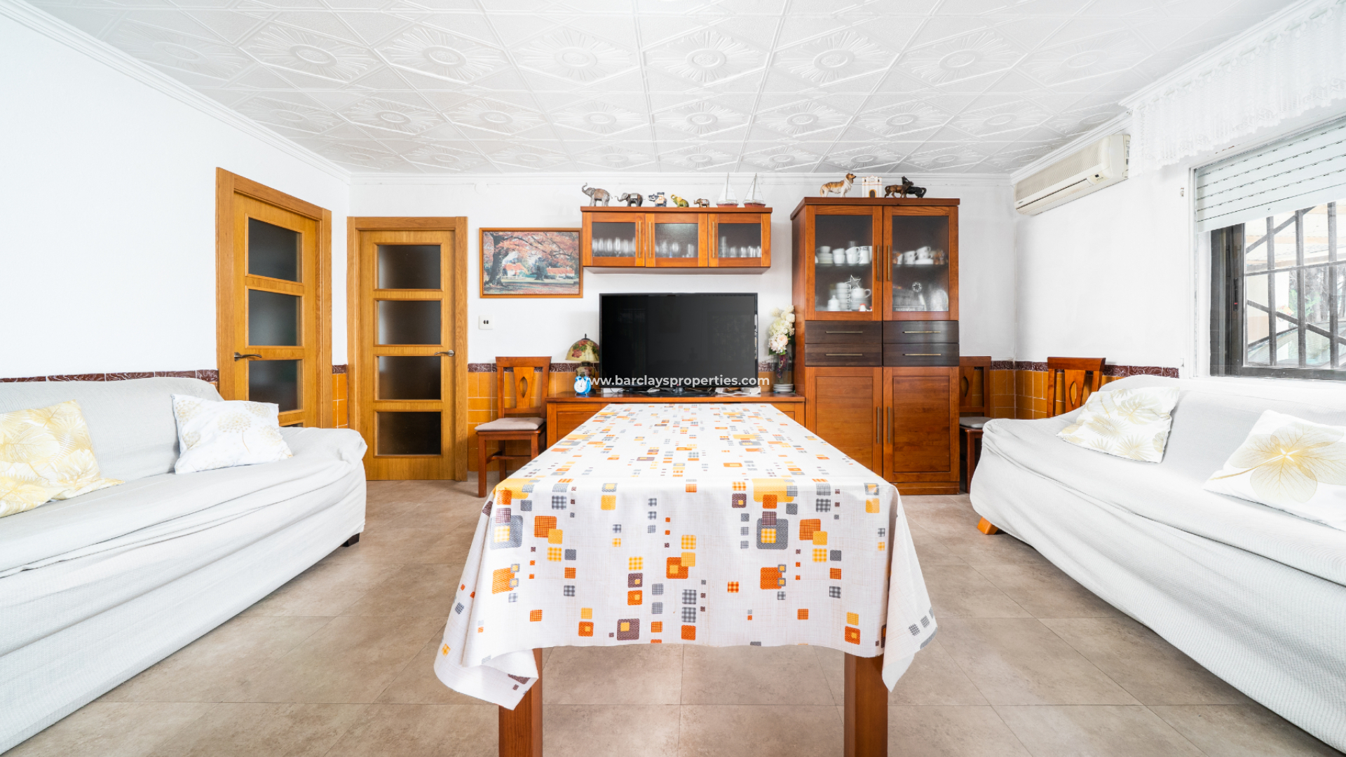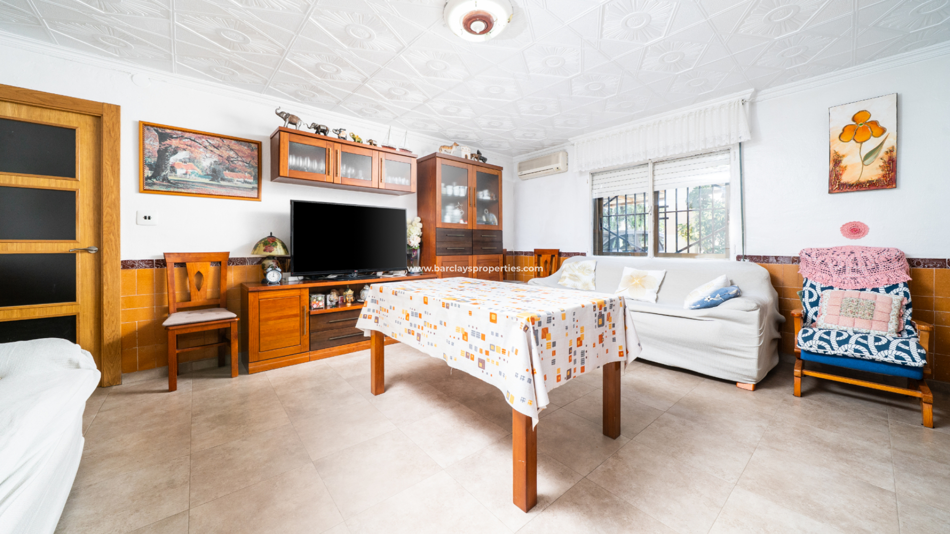 Binnenin is de woning recent gerenoveerd met nieuwe vloertegels, nieuwe binnendeuren en een beveiligde voordeur. De hoofdwoonkamer heeft airconditioning en veel natuurlijk licht, terwijl de keuken royaal van formaat is met een landelijke stijl. Vanuit de keuken is er toegang tot een bijkeuken/berging met toegang tot de tuin.