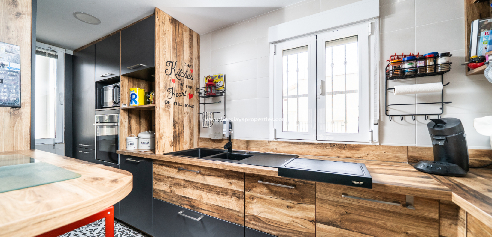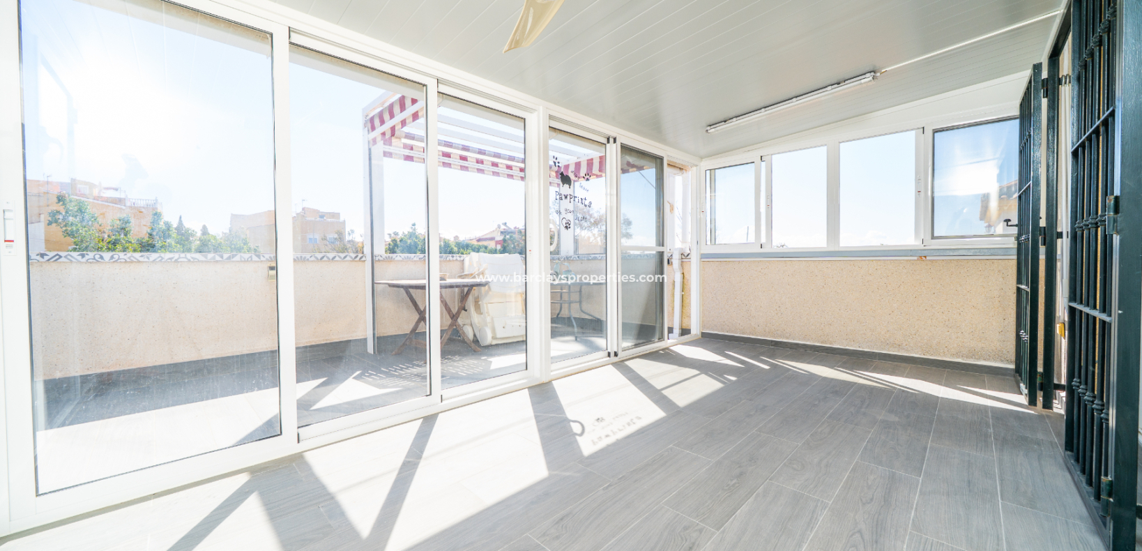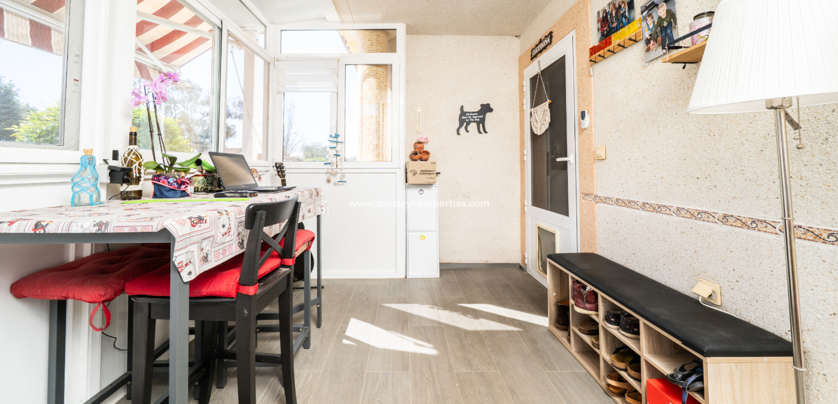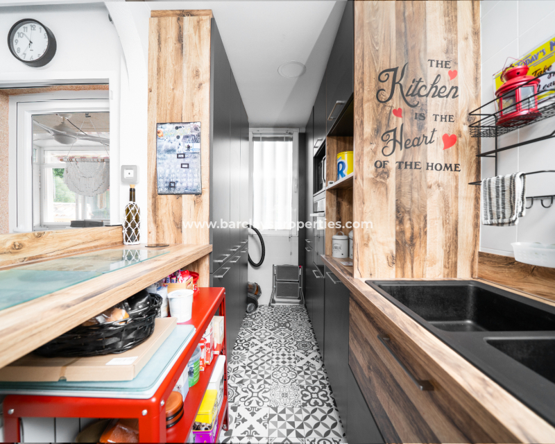 De ruime woonkamer is licht en uitnodigend, voorzien van airconditioning en een plafondventilator. De recent geïnstalleerde keuken biedt voldoende opbergruimte en moderne afwerkingen. Aangrenzend aan de woonkamer bevindt zich een grote serre met plafondventilator – perfect om te ontspannen of gasten te ontvangen in elk seizoen.
