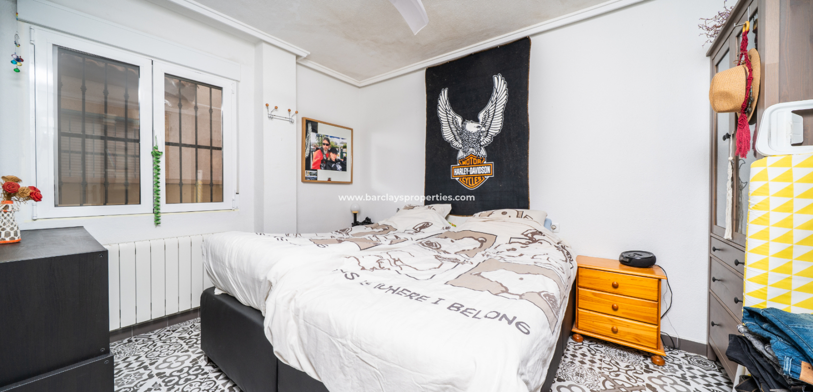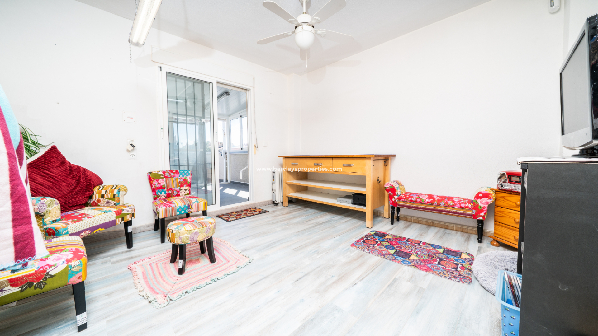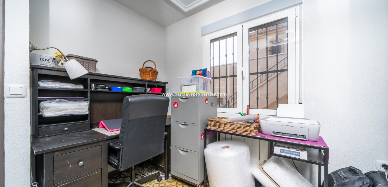 Een van de slaapkamers op de begane grond wordt momenteel gebruikt als kantoor en beschikt over een plafondventilator, terwijl de hoofdslaapkamer eveneens voorzien is van een plafondventilator voor extra comfort.