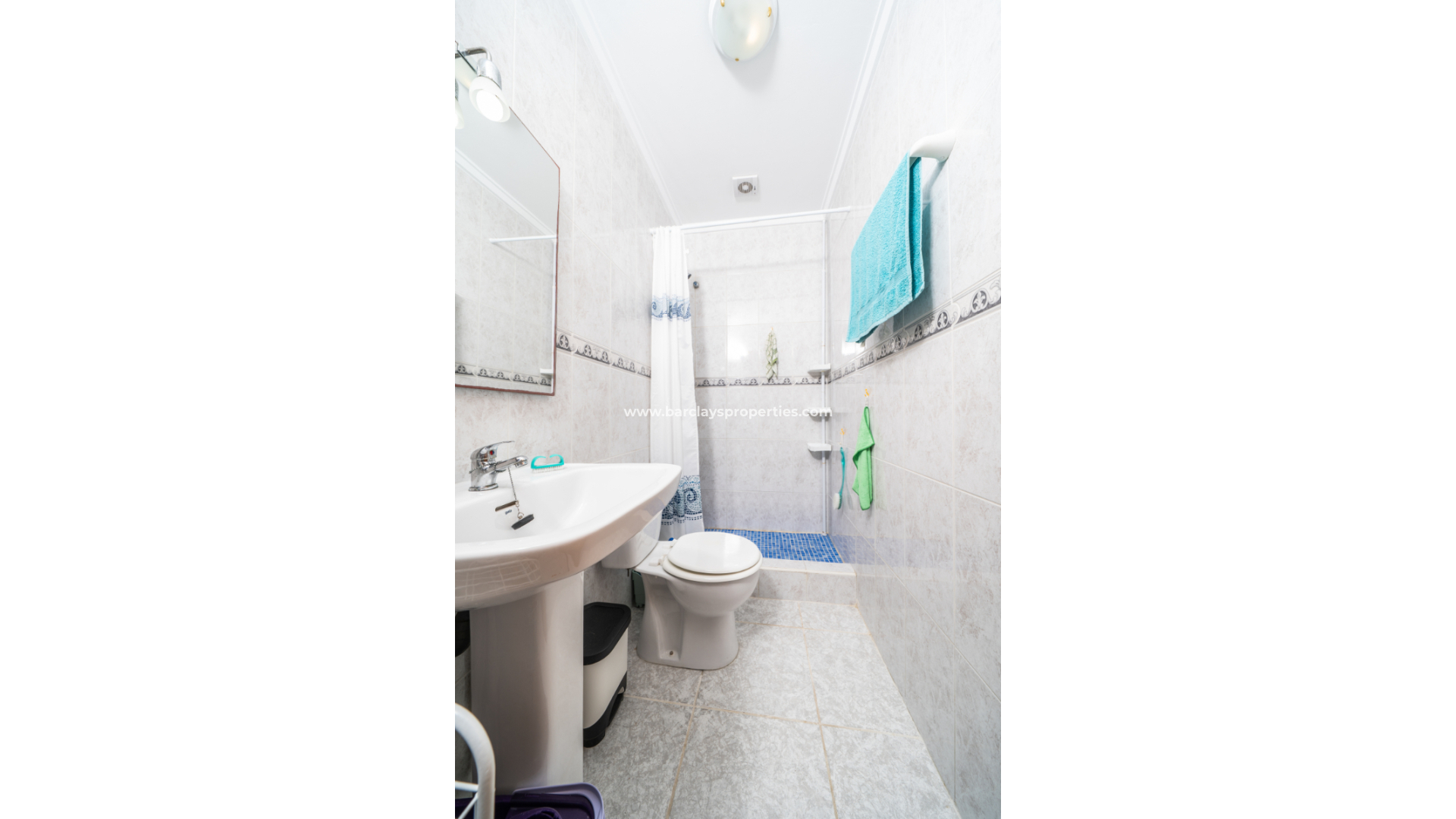 Een wenteltrap leidt naar een overloop / wasruimte en vanaf daar bereikt u het ruime solarium met prachtig uitzicht over het platteland richting Guardamar.