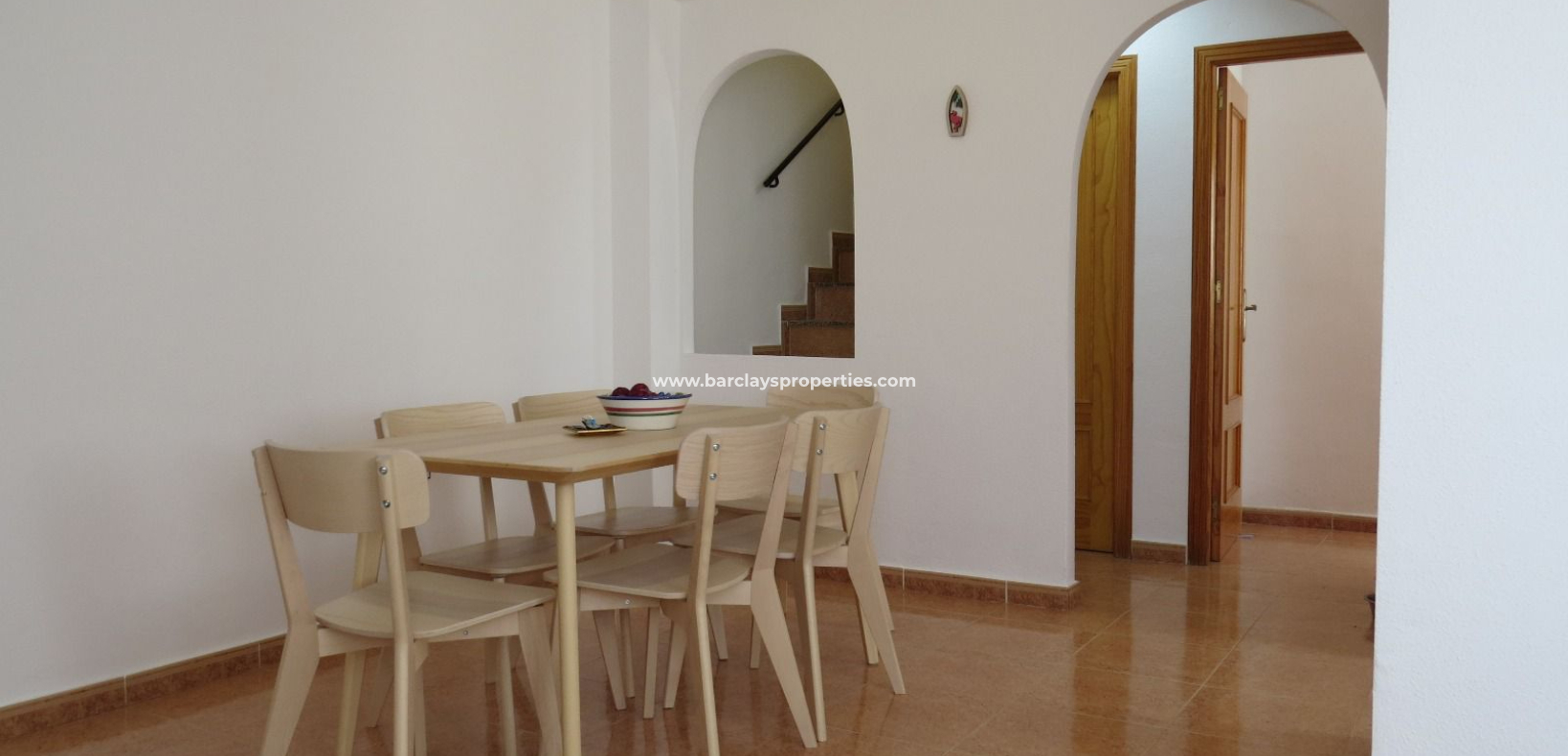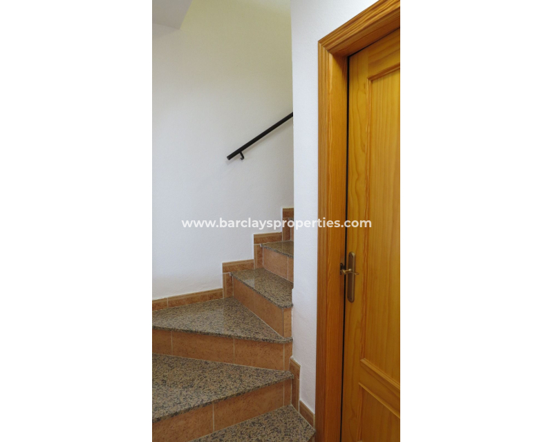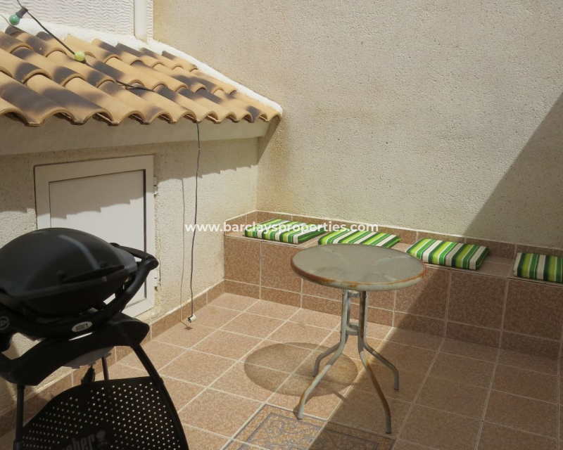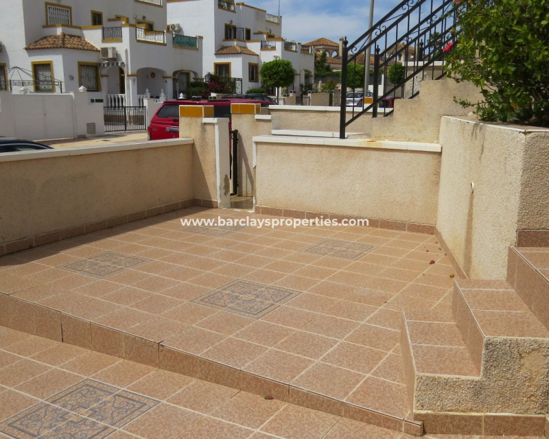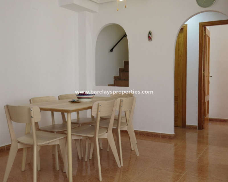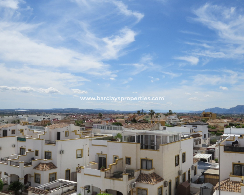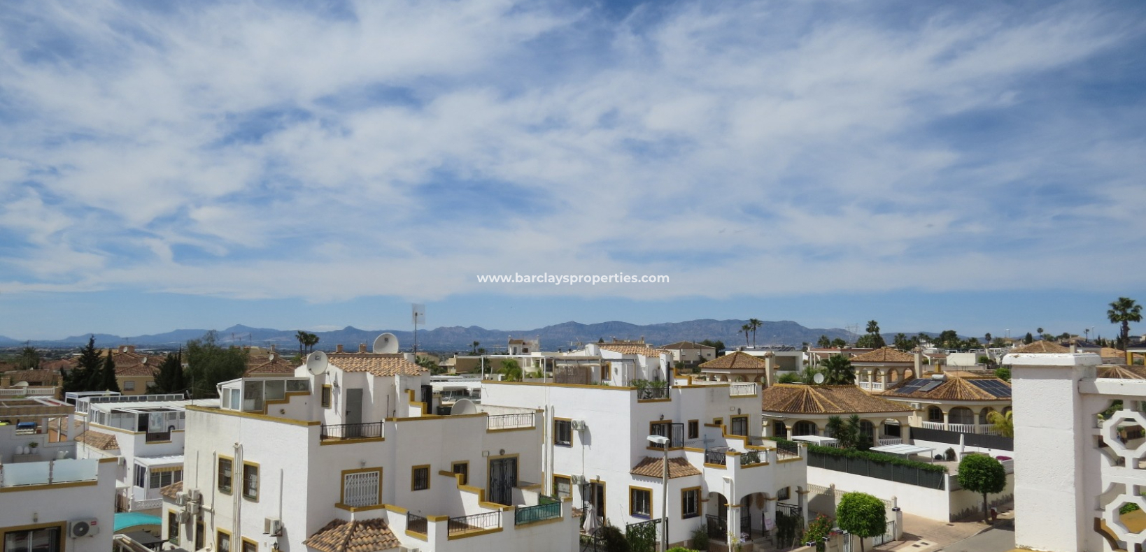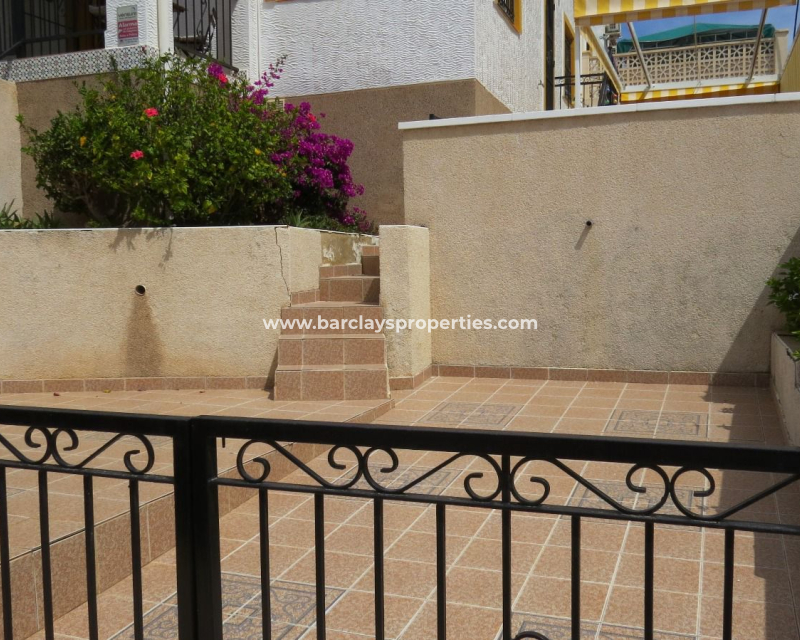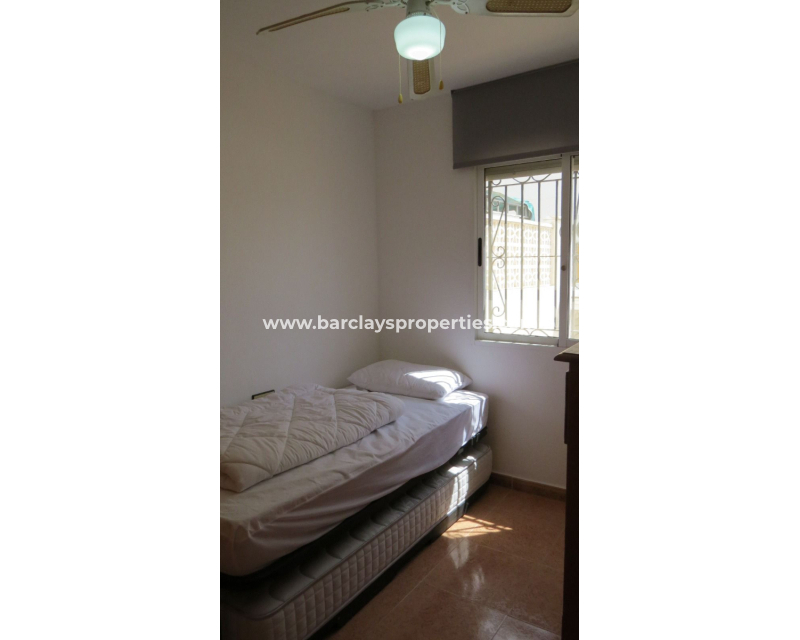 Deze goed onderhouden twee verdiepingen tellende quad villa is gelegen in een rustige doch centraal gelegen privé-gemeenschap in de populaire urbanisatie La Marina, San Fulgencio. De woning biedt 3 slaapkamers, 2 badkamers en een royale woonoppervlakte van 81m². Het beschikt over een onafhankelijke keuken, dubbele beglazing, airconditioning, witgoed, een versterkte veiligheidsdeur en een berging. Geniet van ontspanning op het ruime voorterras met parkeerplaats of dineer op het verhoogde zijterras in de schaduw. Het huis heeft een gezellig balkon, een lichte woonkamer en een dakterras met panoramisch uitzicht op de omgeving en de verre bergen. De hoofdslaapkamer heeft een eigen privéterras. ➡️ Slechts 3 km van het strand en 500 meter van alle essentiële voorzieningen, maakt de woning deel uit ➡️ van een privé-gemeenschap met toegang tot een groot gemeenschappelijk zwembad en tuinen, wat uitstekend verhuurpotentieel biedt dankzij de nabijheid van golfbanen, de luchthaven van Alicante (25 km) en de rustige doch levendige omgeving.