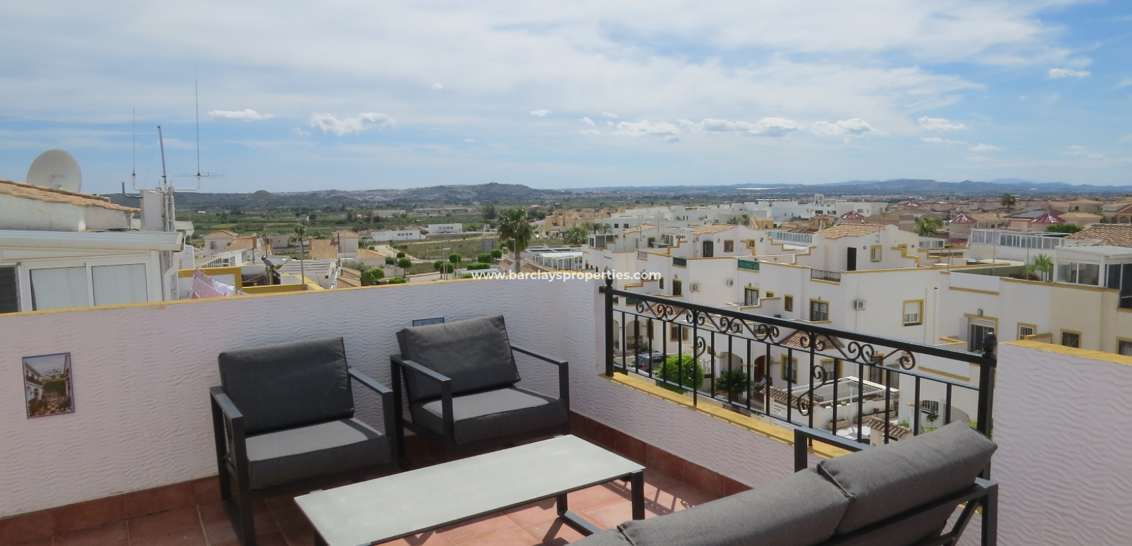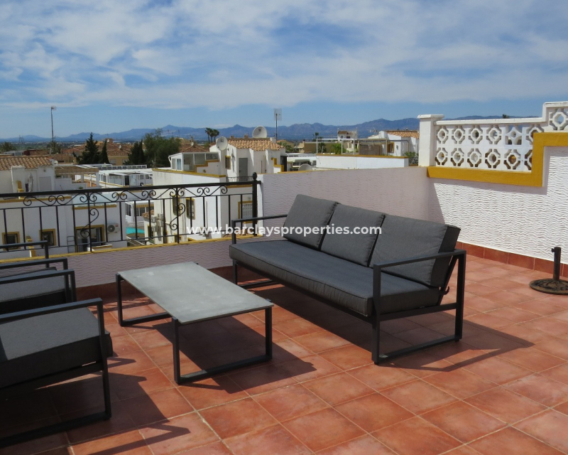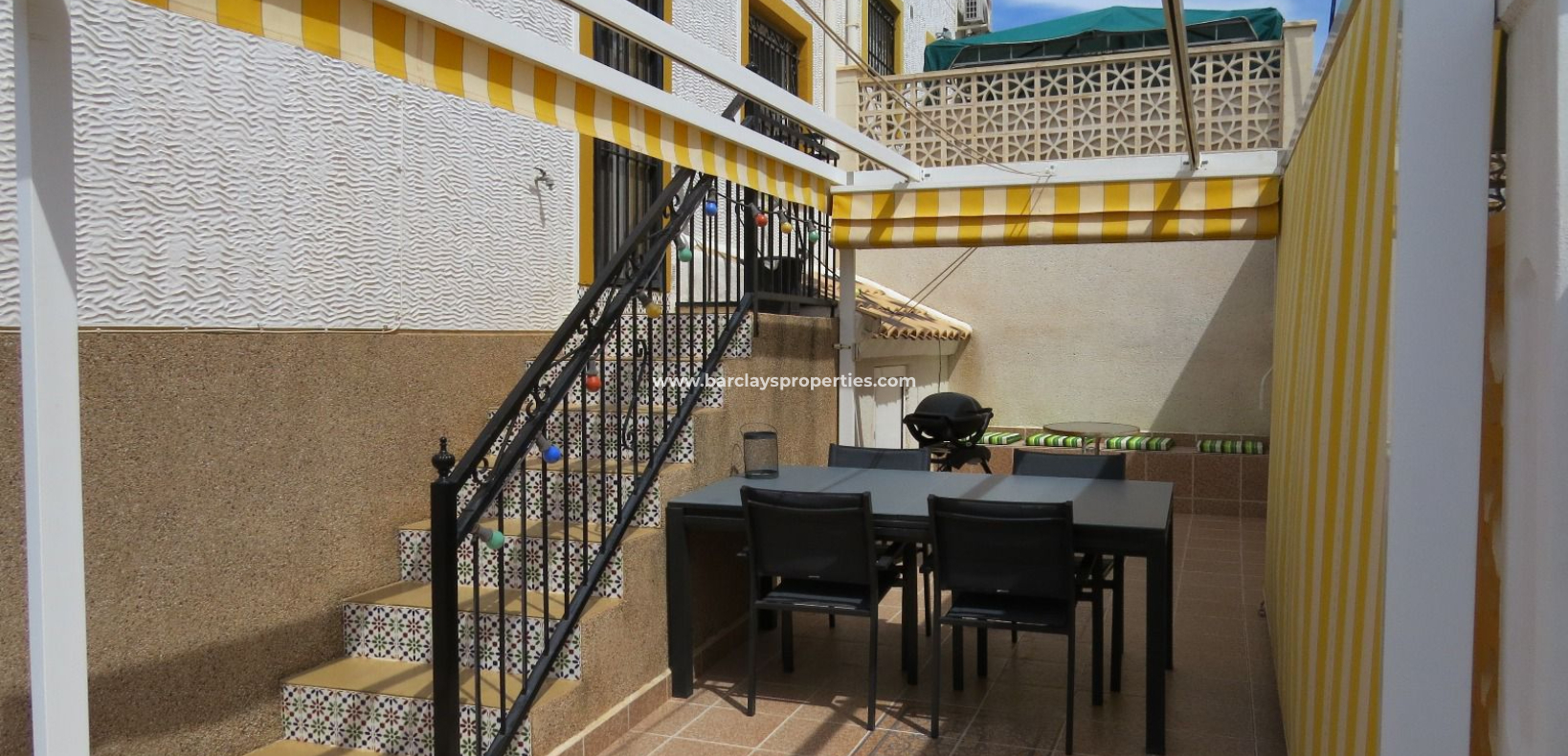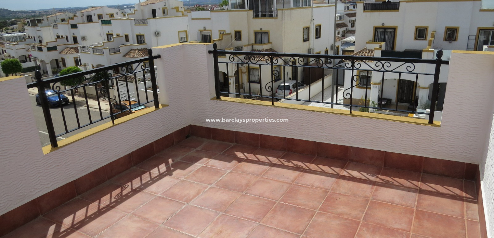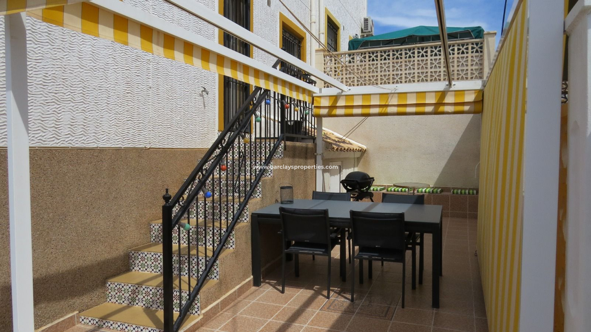Deze goed onderhouden twee verdiepingen tellende quad villa is gelegen in een rustige doch centraal gelegen privé-gemeenschap in de populaire urbanisatie La Marina, San Fulgencio. De woning biedt 3 slaapkamers, 2 badkamers en een royale woonoppervlakte van 81m². Het beschikt over een onafhankelijke keuken, dubbele beglazing, airconditioning, witgoed, een versterkte veiligheidsdeur en een berging. Geniet van ontspanning op het ruime voorterras met parkeerplaats of dineer op het verhoogde zijterras in de schaduw. Het huis heeft een gezellig balkon, een lichte woonkamer en een dakterras met panoramisch uitzicht op de omgeving en de verre bergen. De hoofdslaapkamer heeft een eigen privéterras. ➡️ Slechts 3 km van het strand en 500 meter van alle essentiële voorzieningen, maakt de woning deel uit ➡️ van een privé-gemeenschap met toegang tot een groot gemeenschappelijk zwembad en tuinen, wat uitstekend verhuurpotentieel biedt dankzij de nabijheid van golfbanen, de luchthaven van Alicante (25 km) en de rustige doch levendige omgeving.