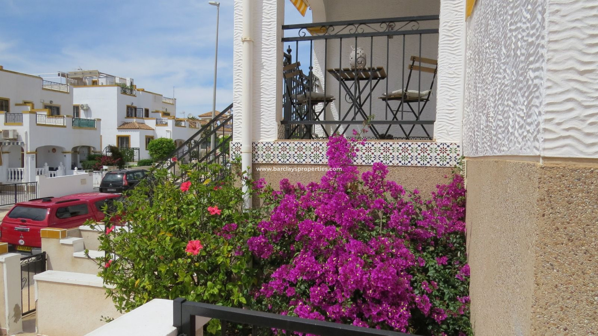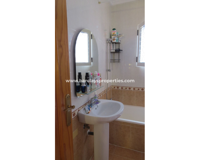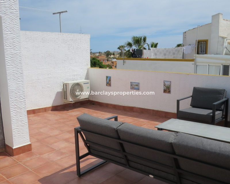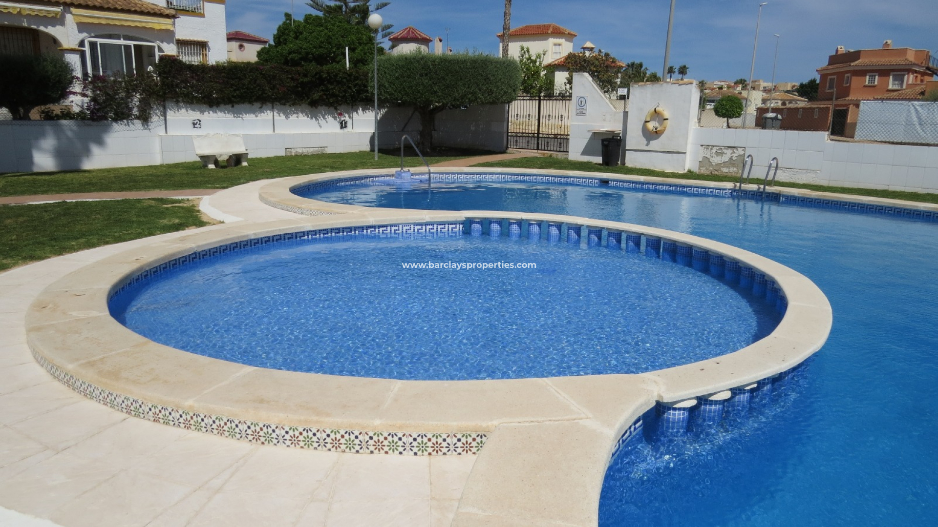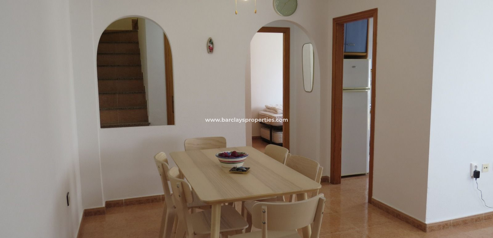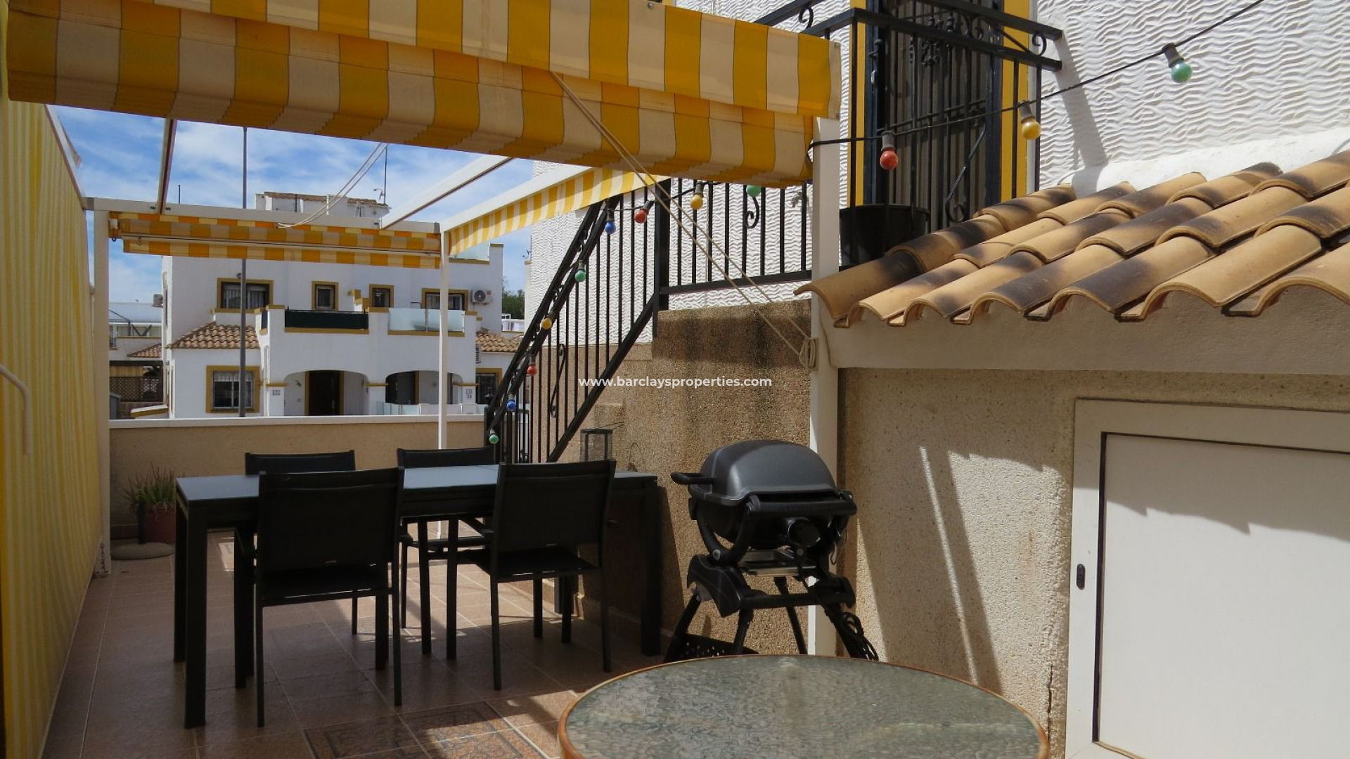 Deze goed onderhouden twee verdiepingen tellende quad villa is gelegen in een rustige doch centraal gelegen privé-gemeenschap in de populaire urbanisatie La Marina, San Fulgencio. De woning biedt 3 slaapkamers, 2 badkamers en een royale woonoppervlakte van 81m². Het beschikt over een onafhankelijke keuken, dubbele beglazing, airconditioning, witgoed, een versterkte veiligheidsdeur en een berging. Geniet van ontspanning op het ruime voorterras met parkeerplaats of dineer op het verhoogde zijterras in de schaduw. Het huis heeft een gezellig balkon, een lichte woonkamer en een dakterras met panoramisch uitzicht op de omgeving en de verre bergen. De hoofdslaapkamer heeft een eigen privéterras. ➡️ Slechts 3 km van het strand en 500 meter van alle essentiële voorzieningen, maakt de woning deel uit ➡️ van een privé-gemeenschap met toegang tot een groot gemeenschappelijk zwembad en tuinen, wat uitstekend verhuurpotentieel biedt dankzij de nabijheid van golfbanen, de luchthaven van Alicante (25 km) en de rustige doch levendige omgeving.