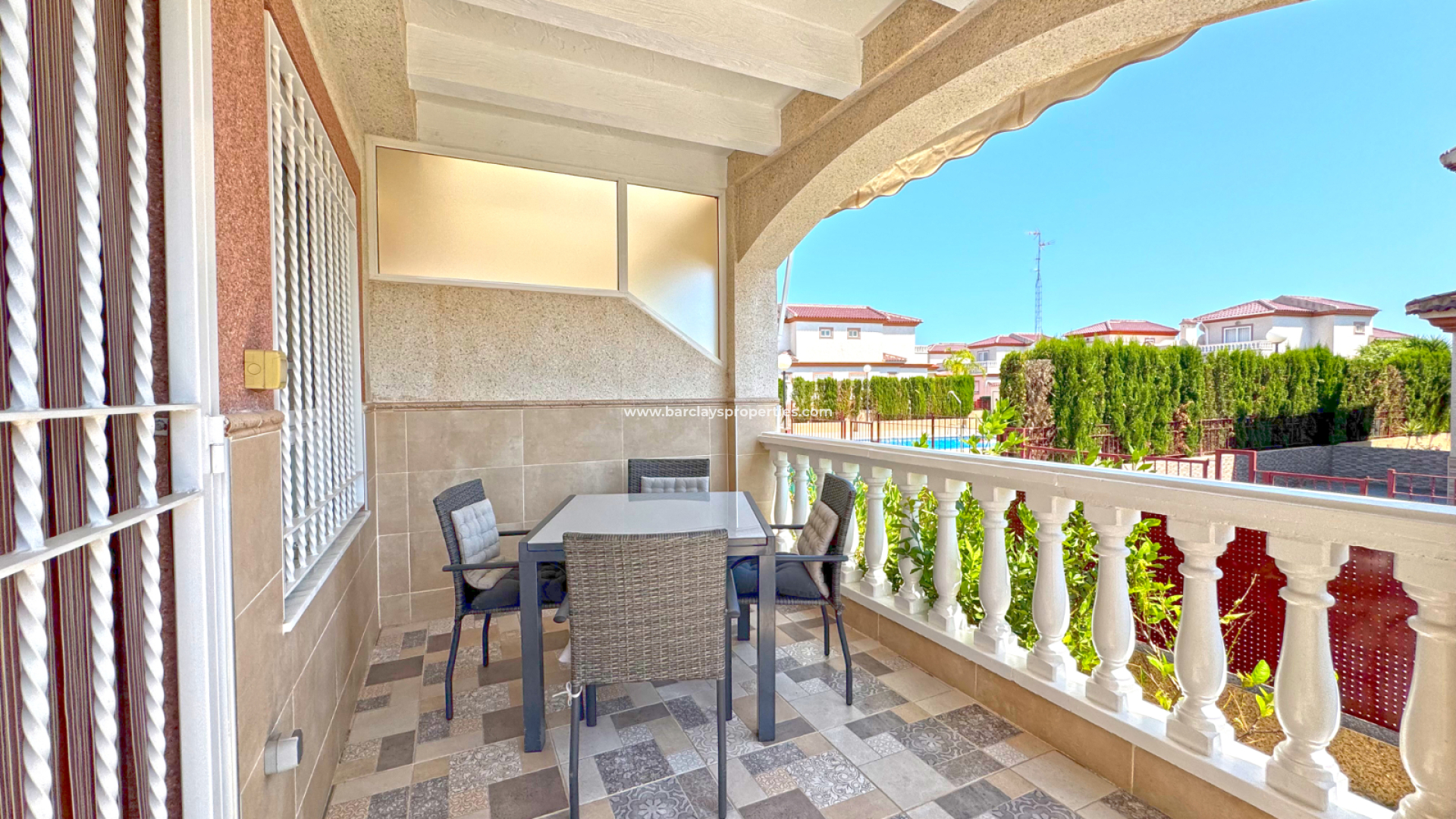De buitenruimte is ideaal om te genieten van het mediterrane klimaat, met toegang tot een goed onderhouden gemeenschappelijk zwembad.