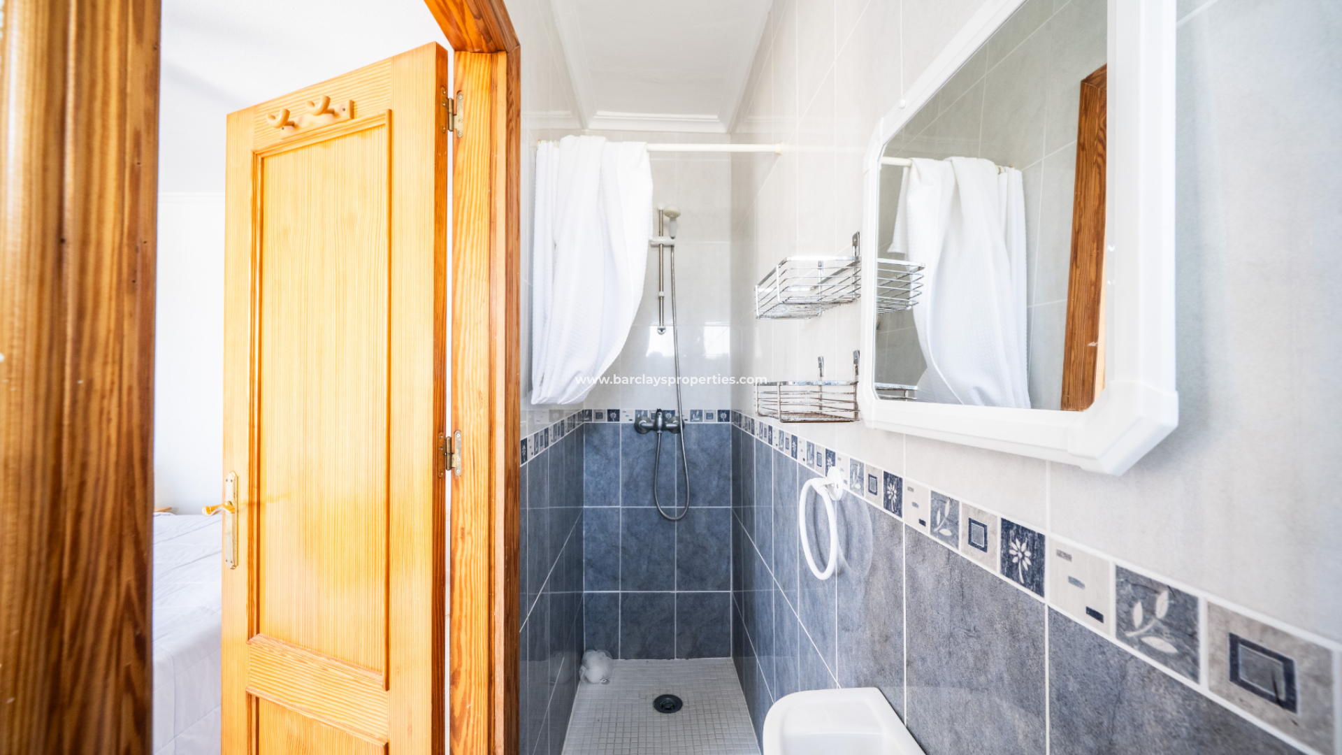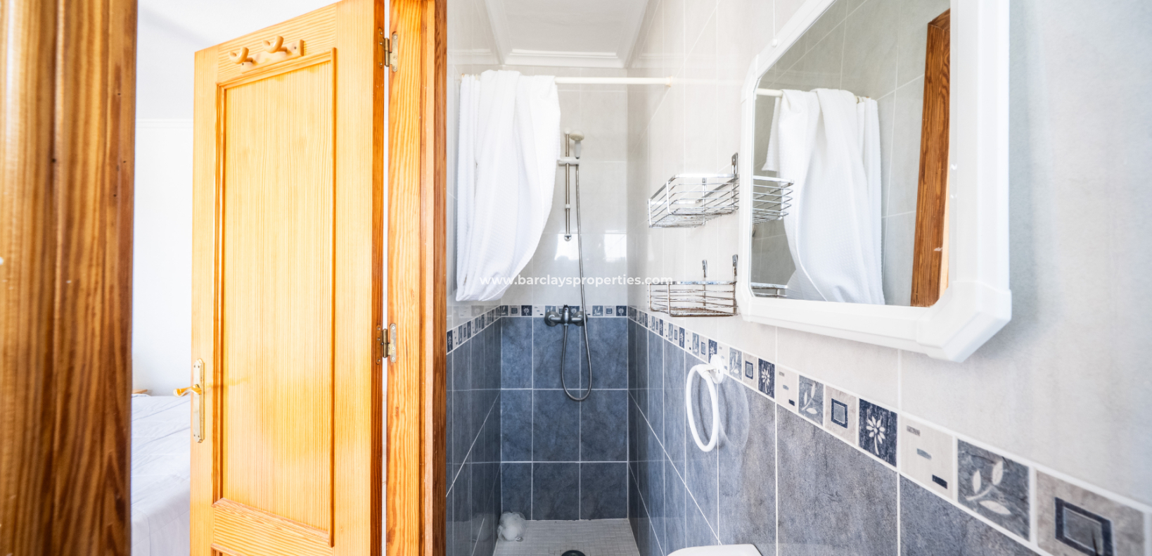 De derde slaapkamer is ook een grote tweepersoonskamer, voorzien van een plafondventilator en een eigen compacte en-suite badkamer met douche, toilet en wastafel.