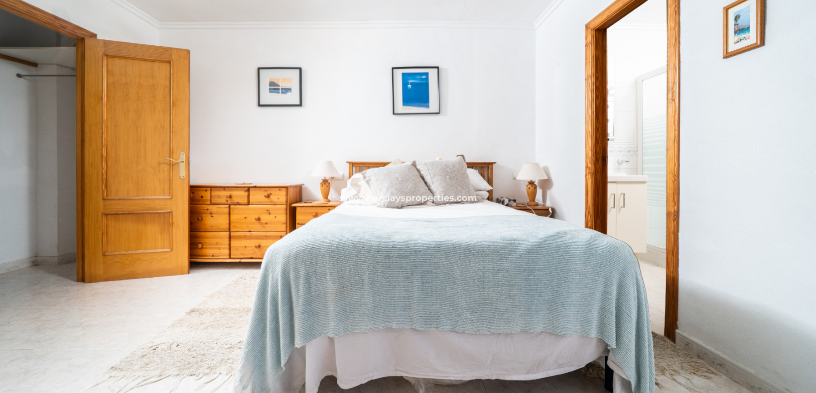 De eerste slaapkamer is een tweepersoonskamer en herbergt handig de wasmachine en boiler. Een trap leidt naar de bovenverdieping, waar ➡️ een ruime tweede slaapkamer is voorzien van een inloopkast, airconditioning, een eigen balkon en een en-suite badkamer met douche, toilet en wastafelmeubel.