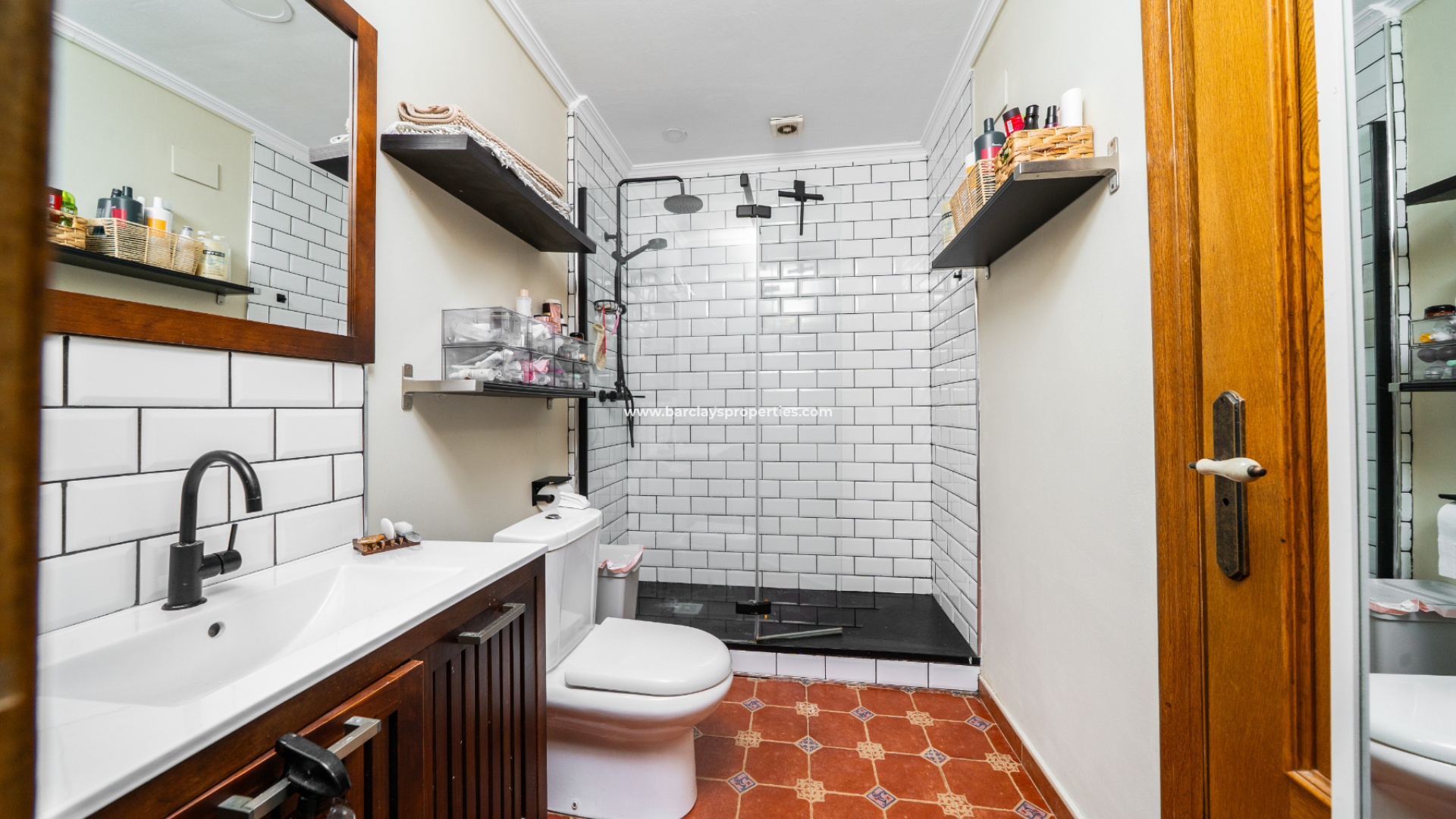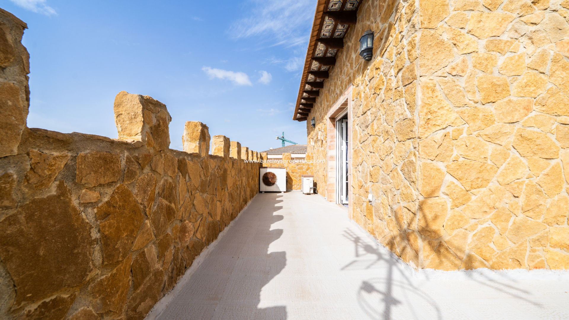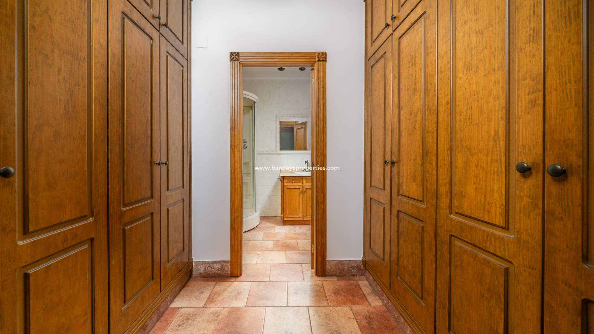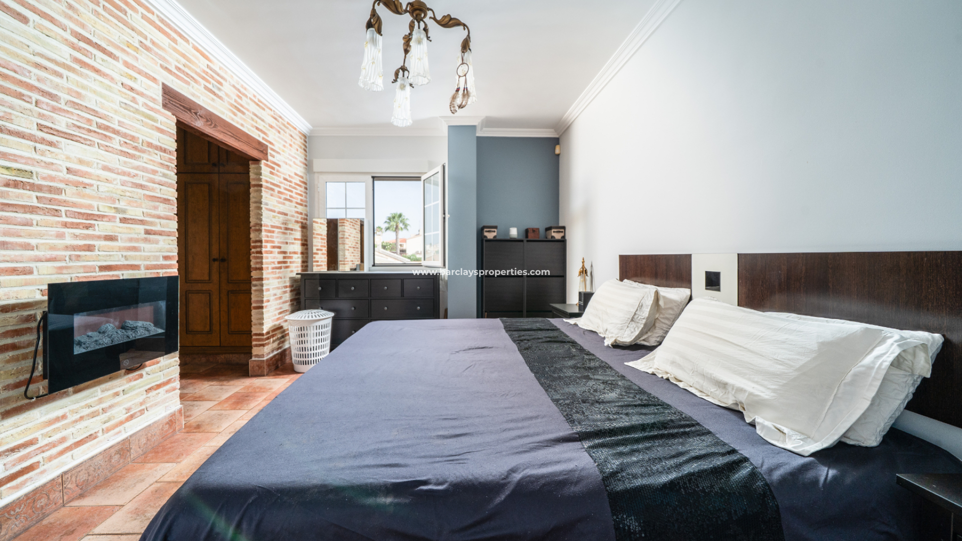 Op de bovenverdieping bevindt zich een royale slaapkamer met airconditioning, een kleedruimte, een en-suite badkamer met douche, en directe toegang tot een groot privébalkon – ideaal om te ontspannen of gasten te ontvangen, met ✅ een prachtig uitzicht over de urbanisatie La Escuera, de aangrenzende urbanisatie La Marina en het platteland richting Rojales.