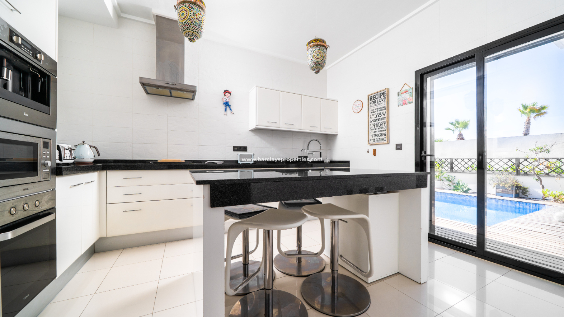 Het huis is gevuld met natuurlijk licht, dankzij ➡️ hoge plafonds in de ruime woonkamer en grote patiodeuren die vanuit elke kamer directe toegang bieden tot het zwembadgebied. Houten vloeren lopen door de hele woning, wat warmte en elegantie toevoegt. De keuken is uitgerust met een kookeiland en moderne afwerkingen, ideaal voor zowel dagelijks gebruik als voor entertainment. Bovendien leidt een handige toegangsdeur naar de tuin.