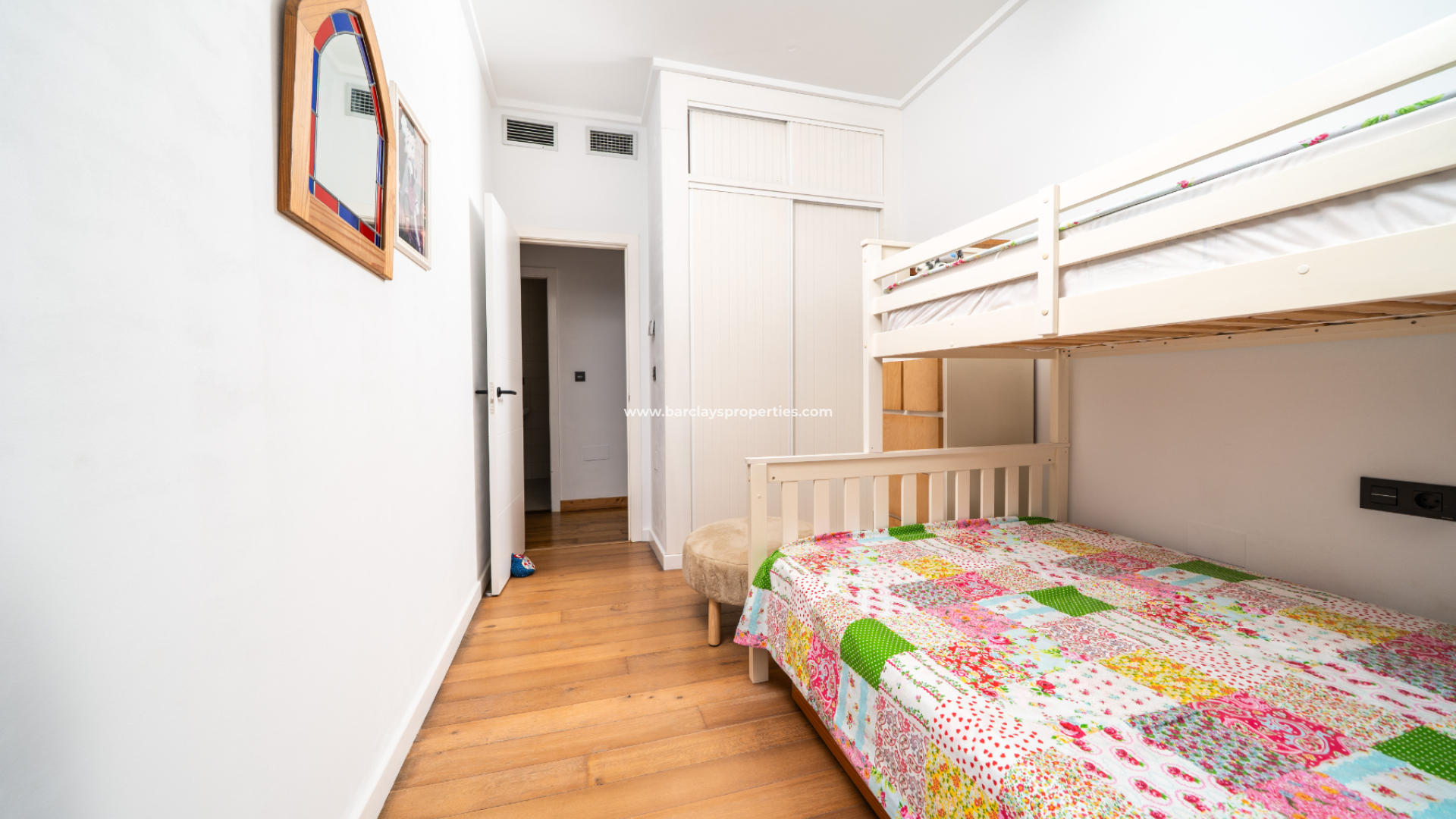 Vanuit de hal vinden we een bijkeuken en alle drie de slaapkamers (waarvan twee met ingebouwde kasten en de master heeft een eigen kleedkamer) en twee badkamers. Eén badkamer heeft een wastafel, een hangend toilet met een wand-“drukknop” spoeling en een ligbad van volledige grootte met douche. De tweede badkamer heeft een ander ontwerp met dubbele wastafels, een hangend toilet en een moderne wand-tot-wand douche.