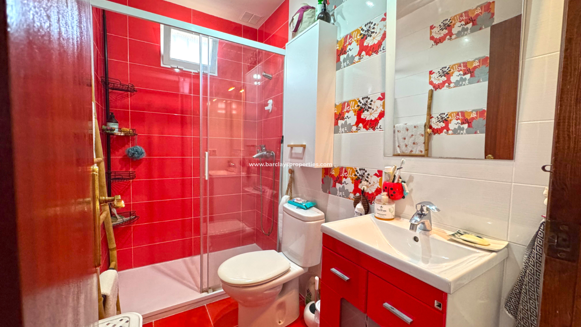De woning omvat een tweepersoonsslaapkamer en een recent gerenoveerde badkamer met inloopdouche, toilet, wastafel en een raam voor natuurlijk licht en ventilatie. Een privé zonneterras biedt extra buitenruimte, ideaal om te genieten van het warme mediterrane klimaat.