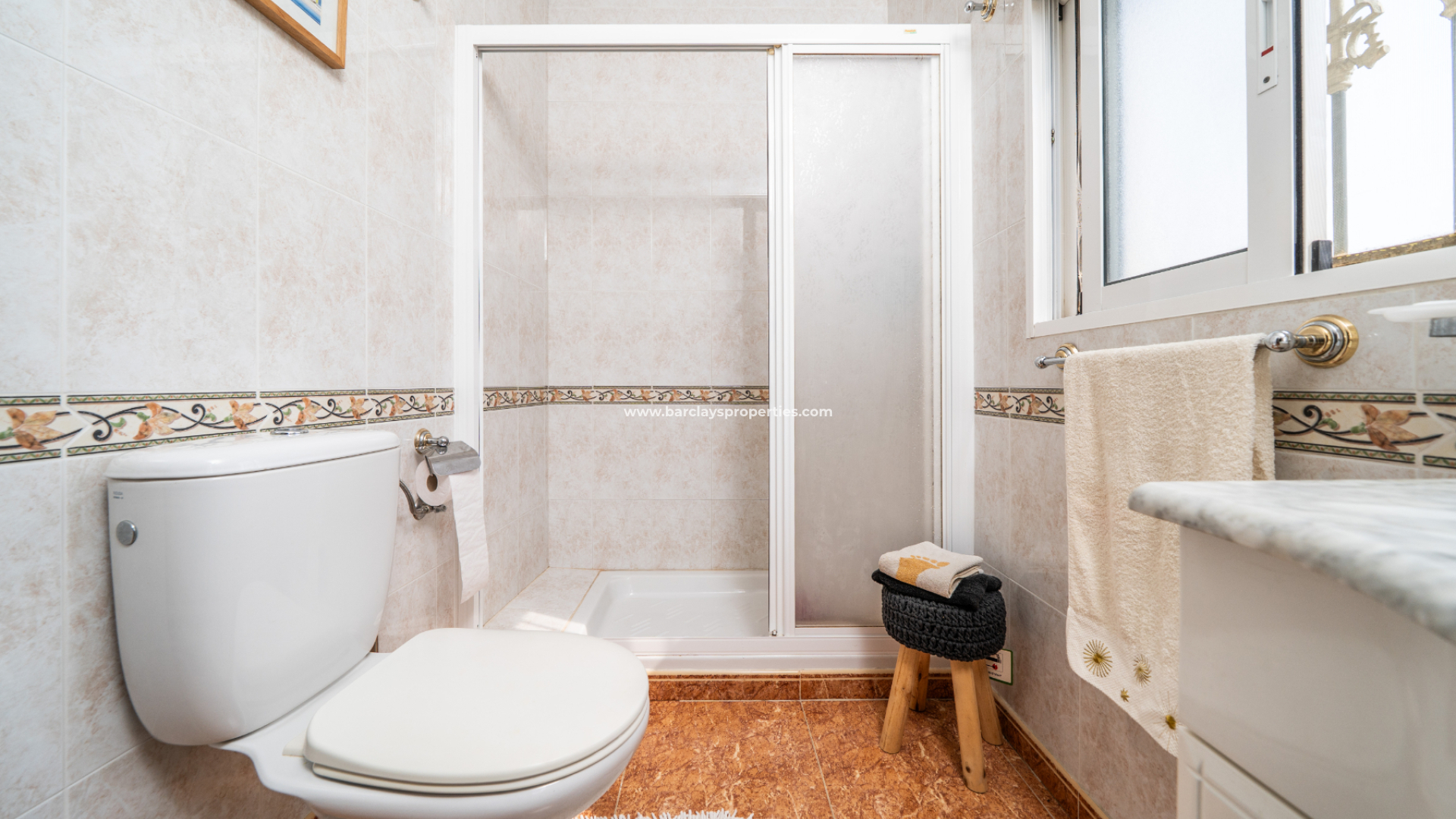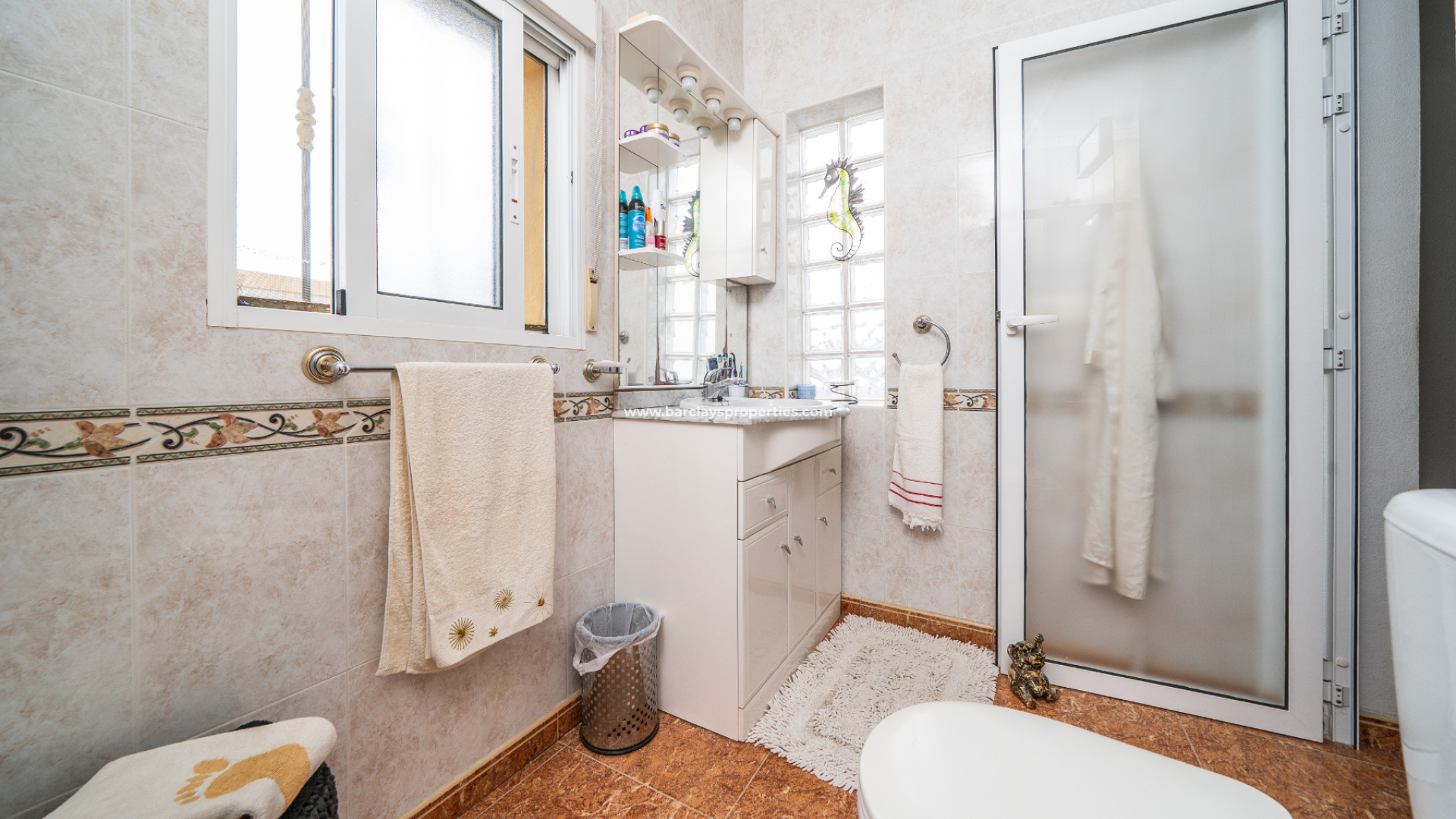 Vanuit hier bereikt men de slaapvertrekken met drie tweepersoonsslaapkamers. De hoofdslaapkamer beschikt over een inbouwkast, een plafondventilator en een eigen badkamer met inloopdouche, wc en wastafelmeubel. De tweede slaapkamer, momenteel in gebruik als eetkamer, heeft een inbouwkast, terwijl de derde slaapkamer is uitgerust met een plafondventilator. Een familiebadkamer met ligbad, wc, bidet en wastafelmeubel maakt de indeling compleet.