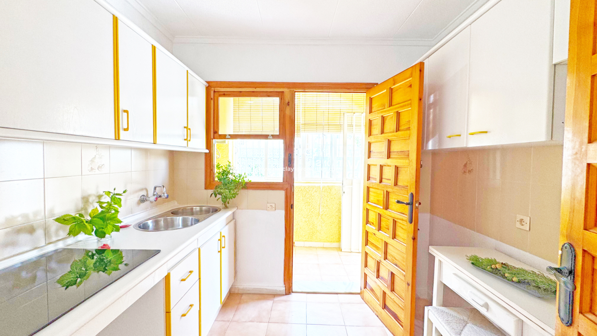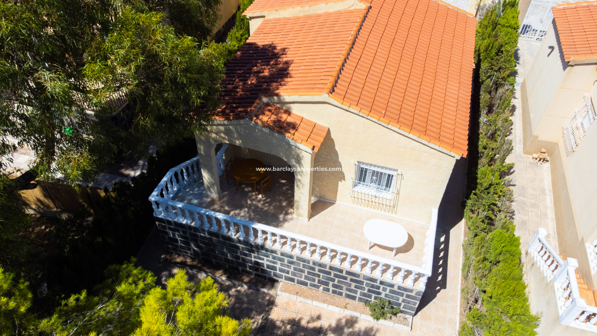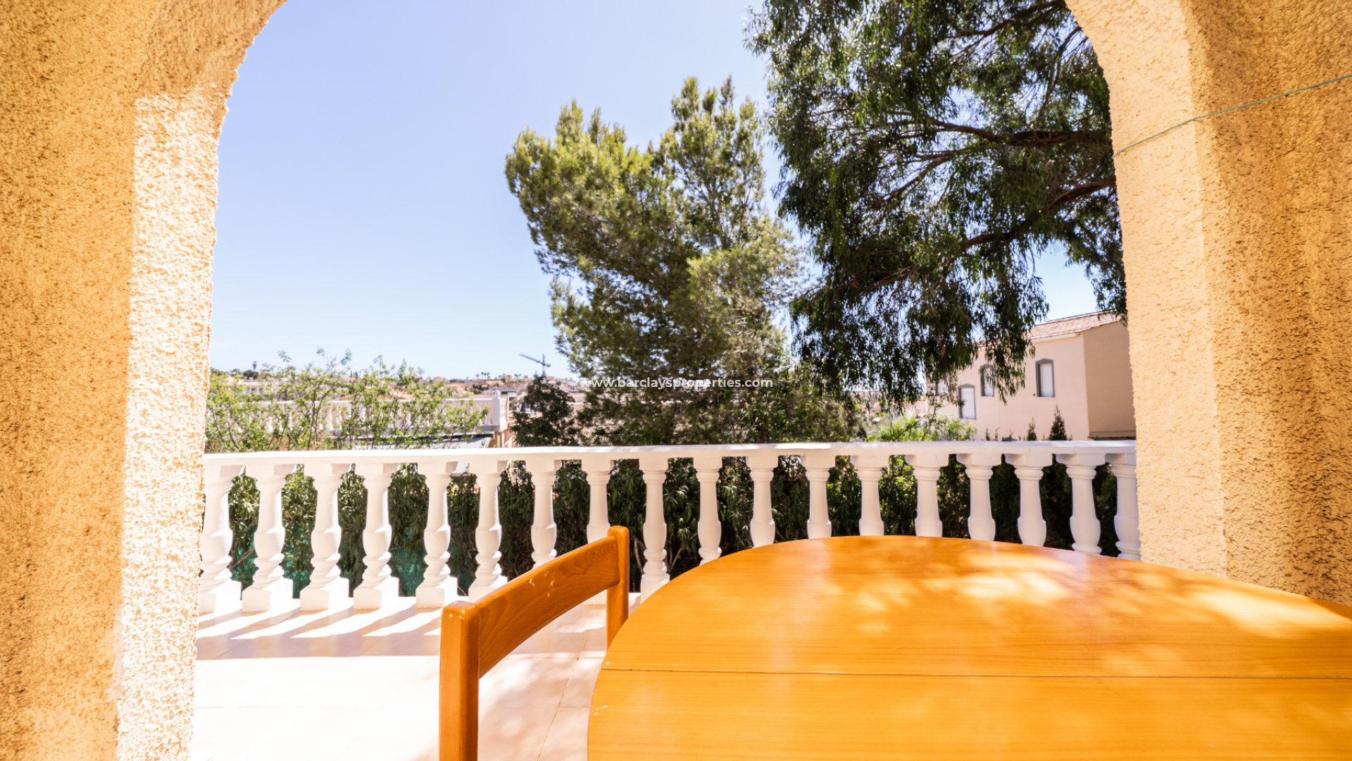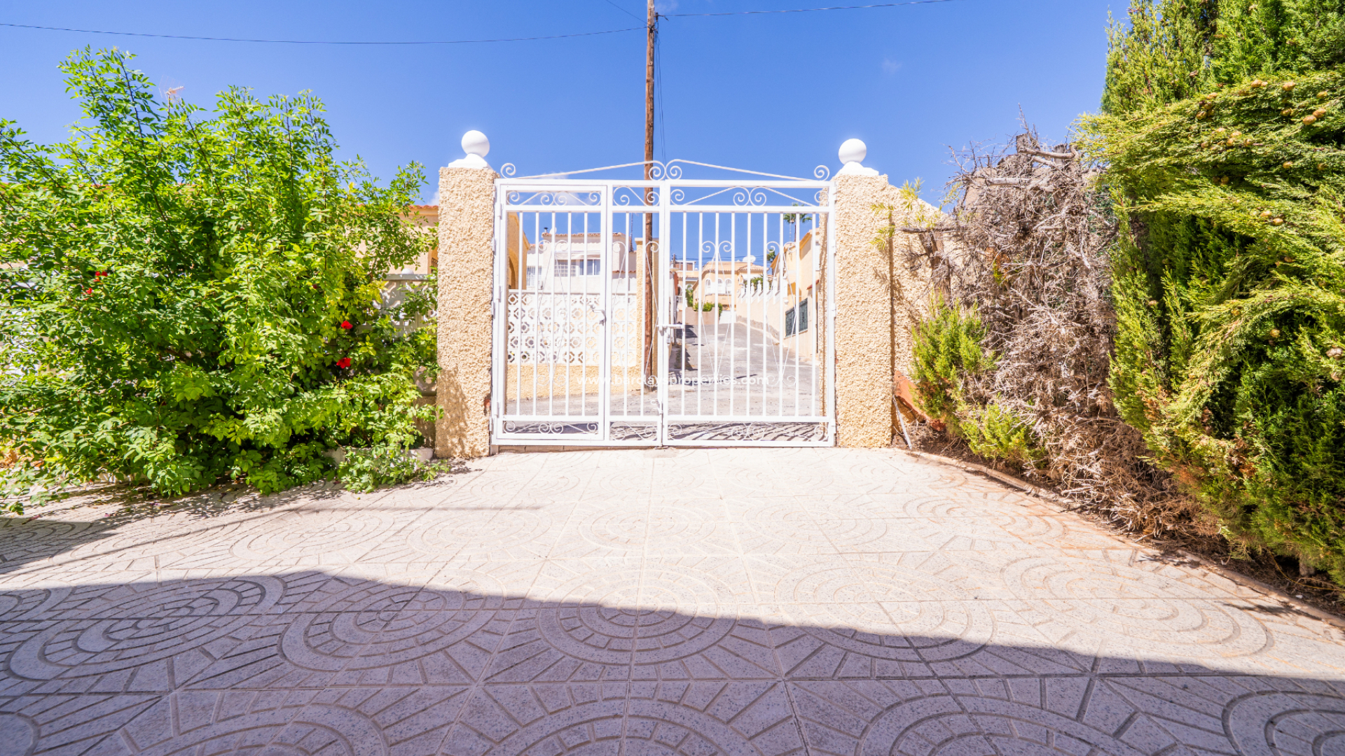 De woning profiteert van een verhoogd achterterras en een overdekte veranda met balustrades. Dit gedeelte biedt niet alleen een heerlijke plek om te zitten en te ontspannen, maar ook praktische bergruimte eronder. Vanaf het terras geniet u van uitzicht richting Guardamar del Segura.