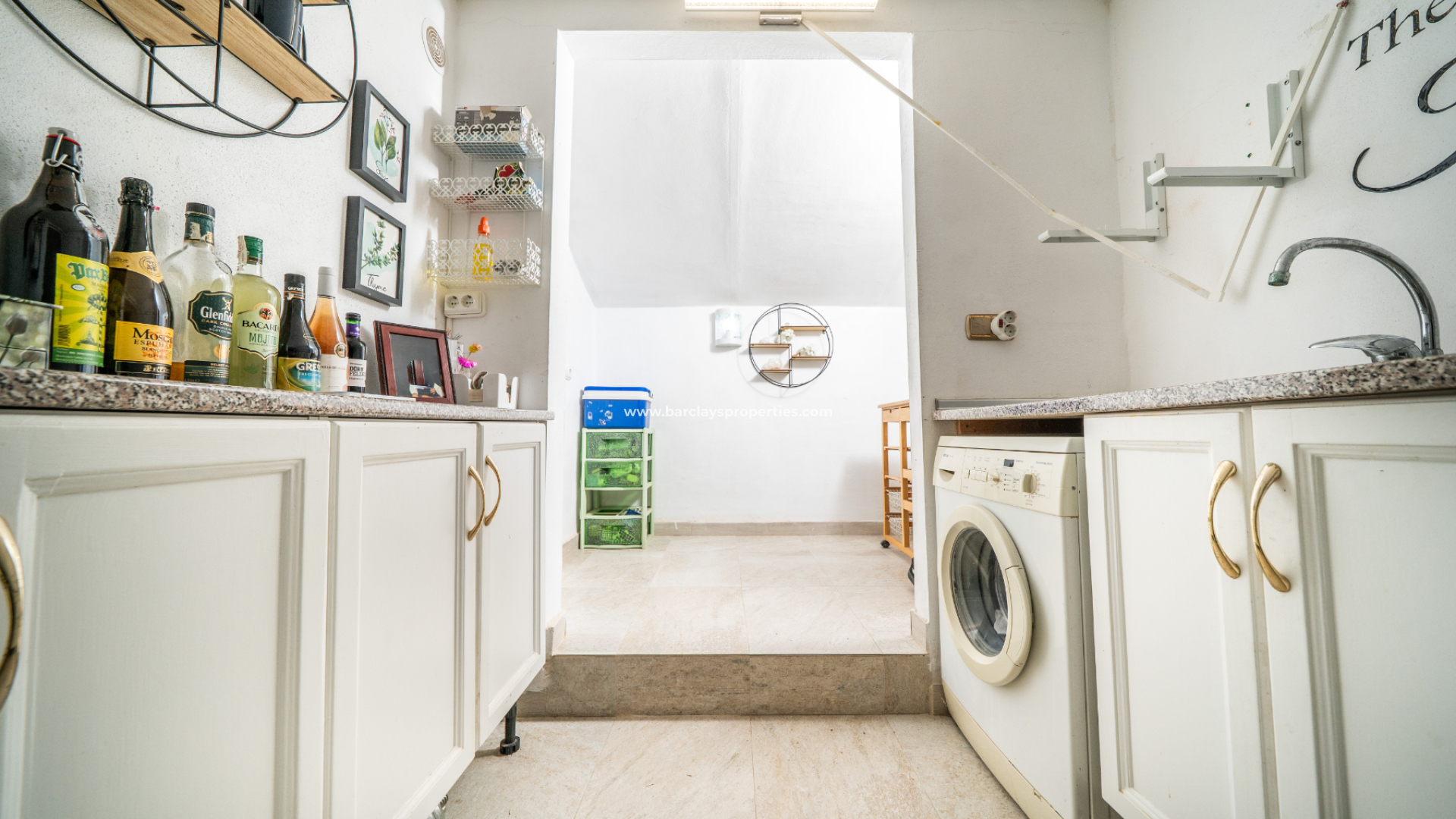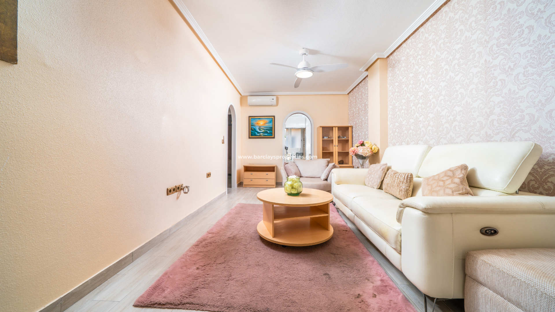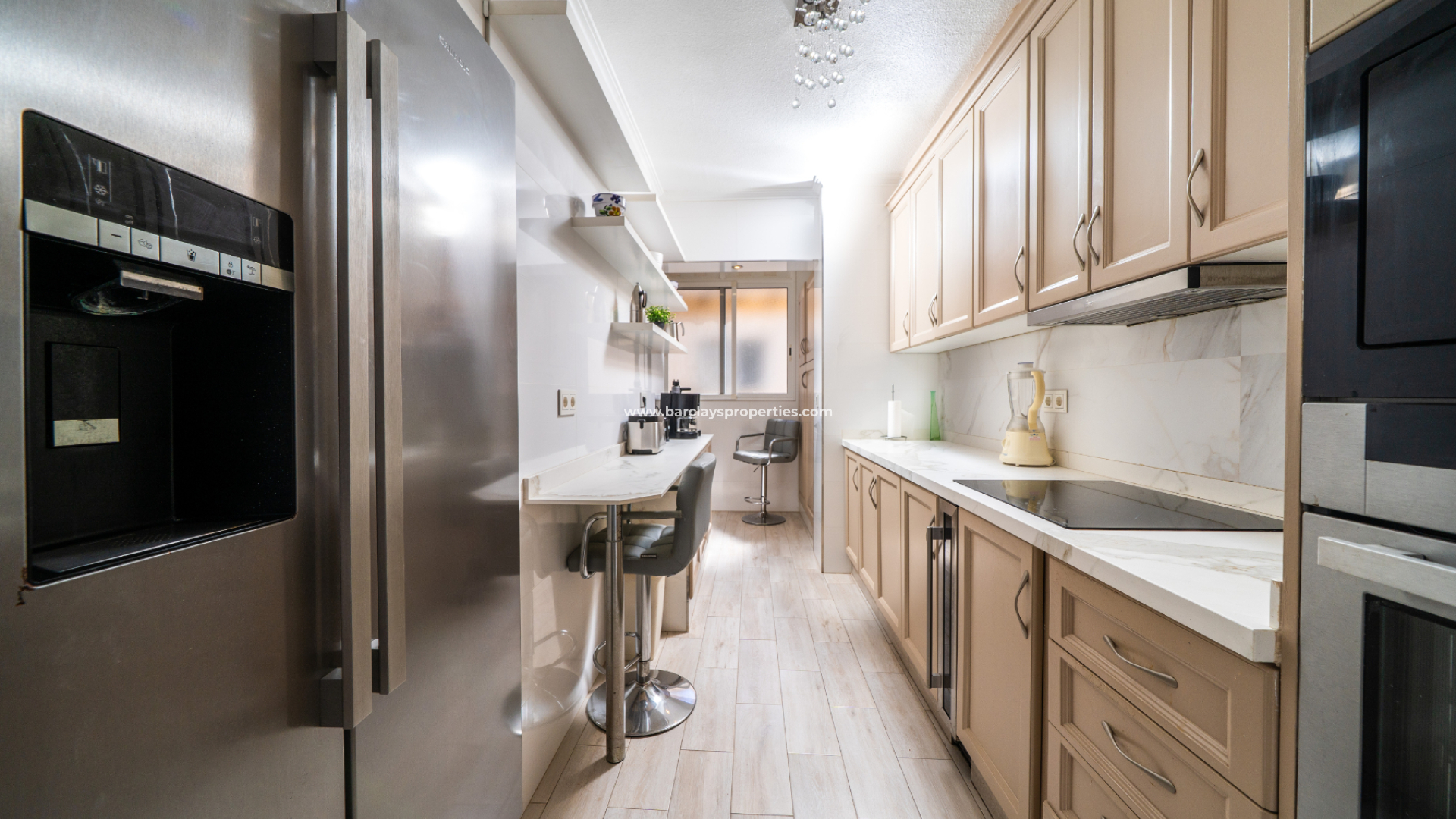 De woonkamer is voorzien van airconditioning en een plafondventilator en is uitgebreid tot het balkon, nu gebruikt als eethoek, ➡️ met indrukwekkend uitzicht over de zoutmeren en de zee. De moderne keuken is afgewerkt met beige units en omvat alle elektrische apparaten, een wijnkoelkast, een afvalverwijderingssysteem, voldoende opbergruimte en verlichting onder de kasten.