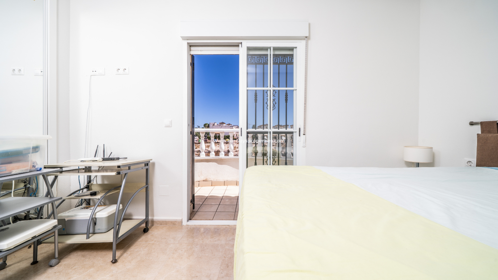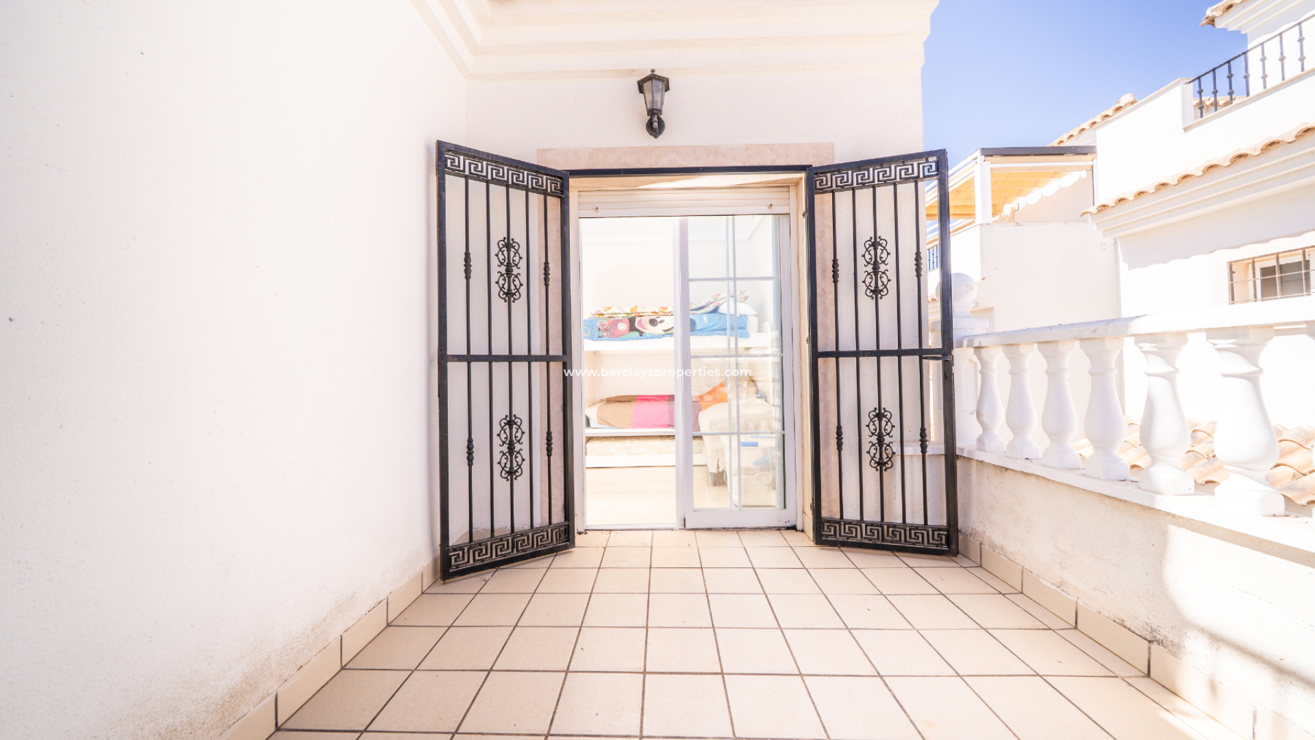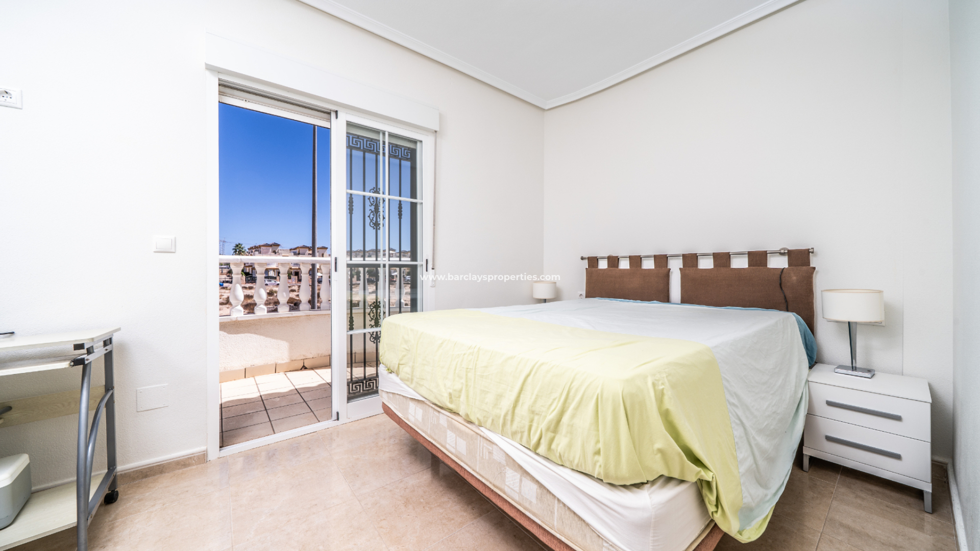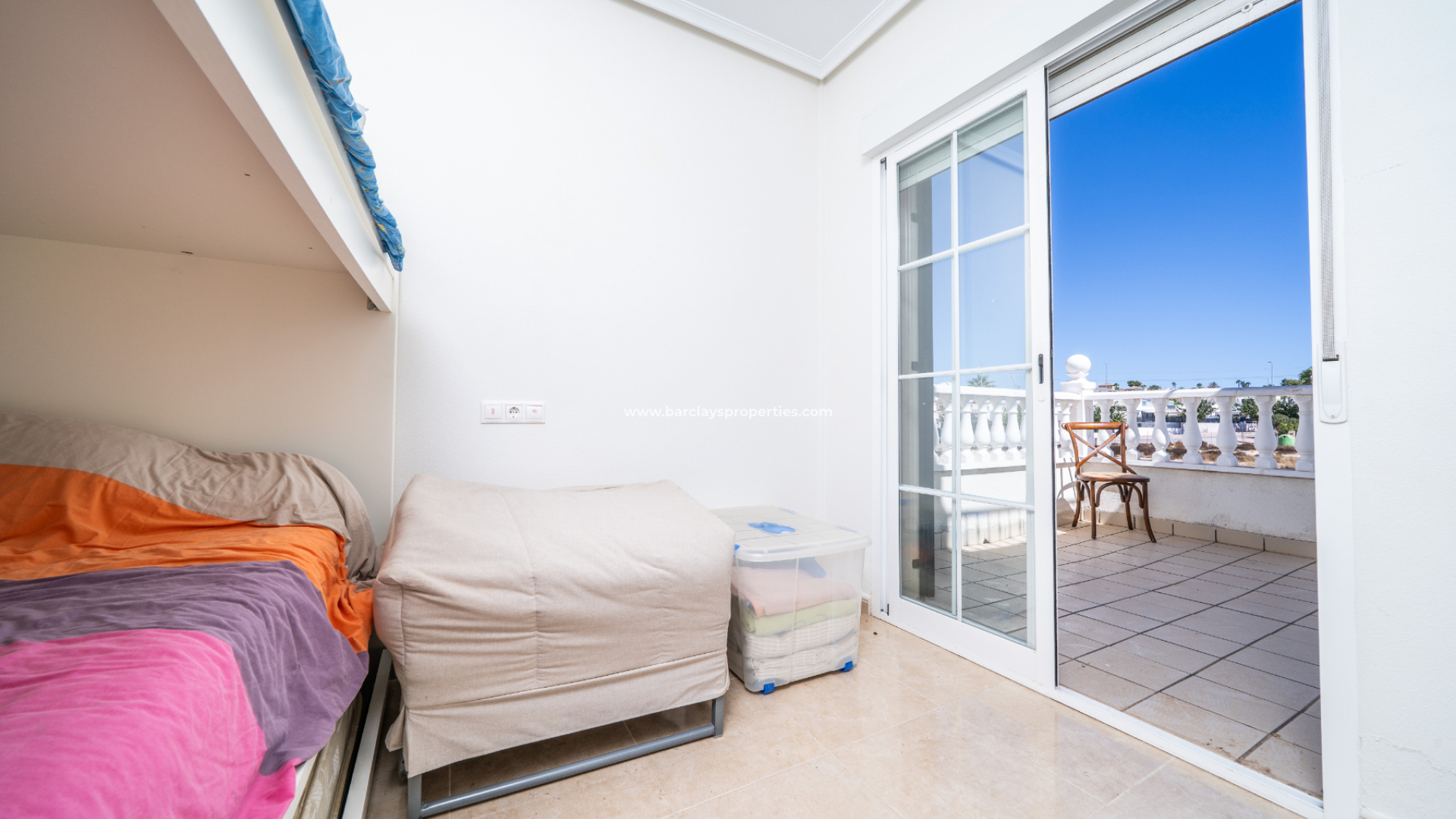 Boven is de tweede slaapkamer uitgerust met stapelbedden, kastruimte en openslaande deuren naar een balkon. De hoofdslaapkamer beschikt ook over ingebouwde spiegelkasten, openslaande deuren naar het balkon met uitzicht over de urbanisatie en ook op deze verdieping vinden we een familiebadkamer met ligbad, bidet, toilet en badmeubel.