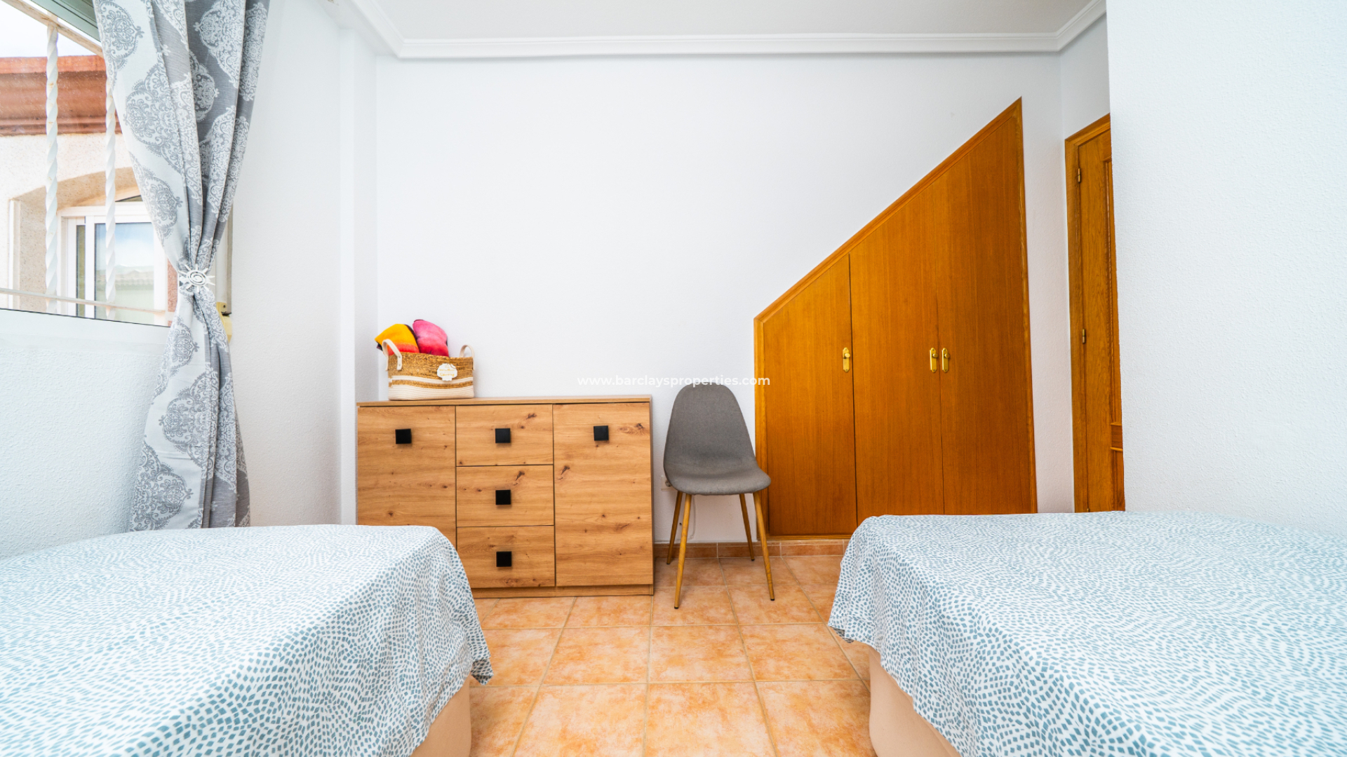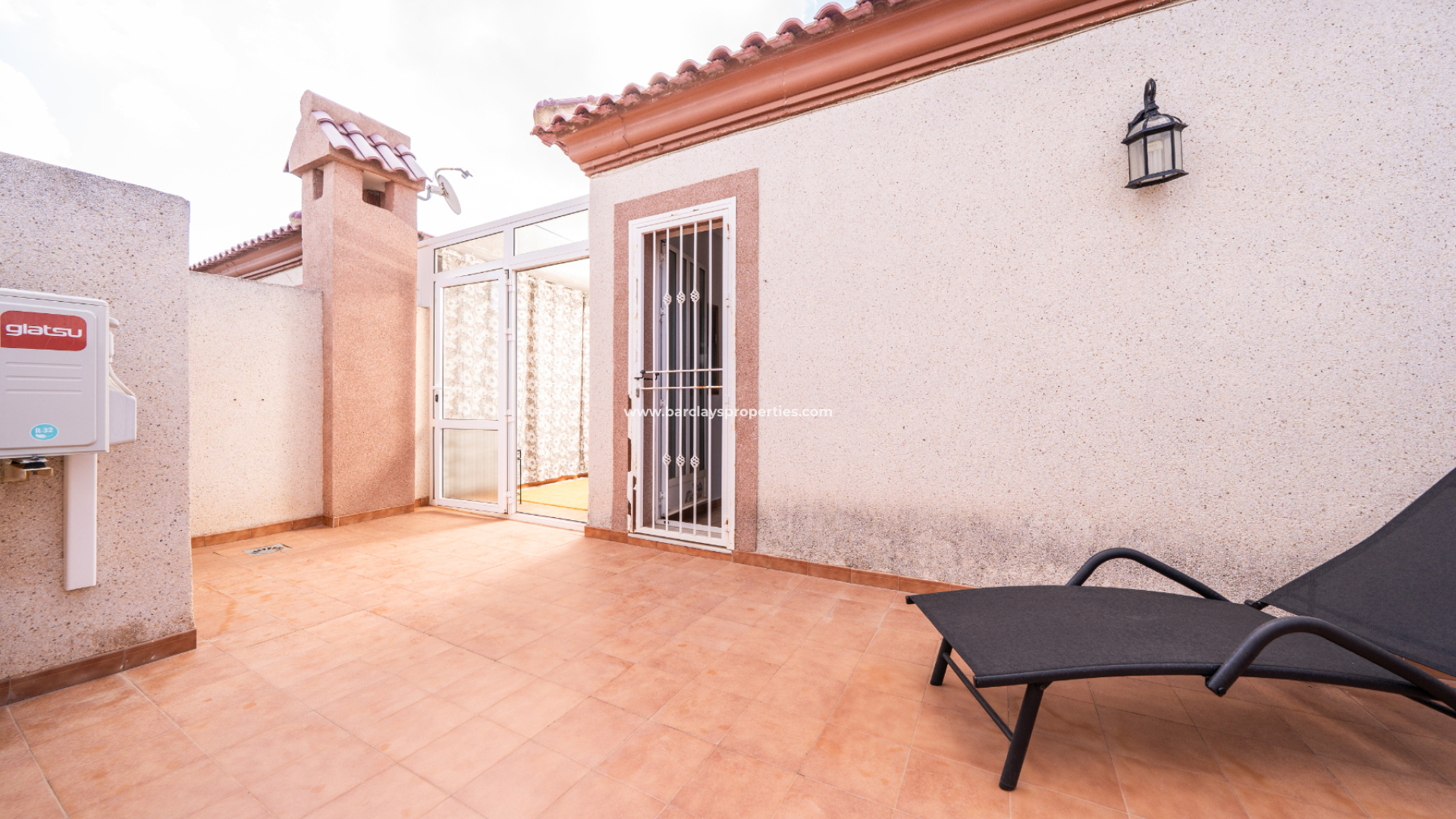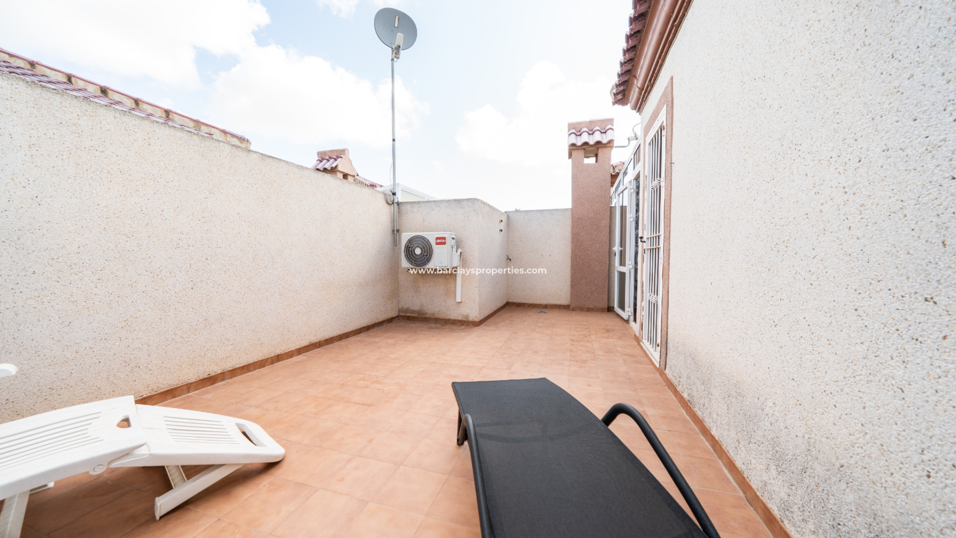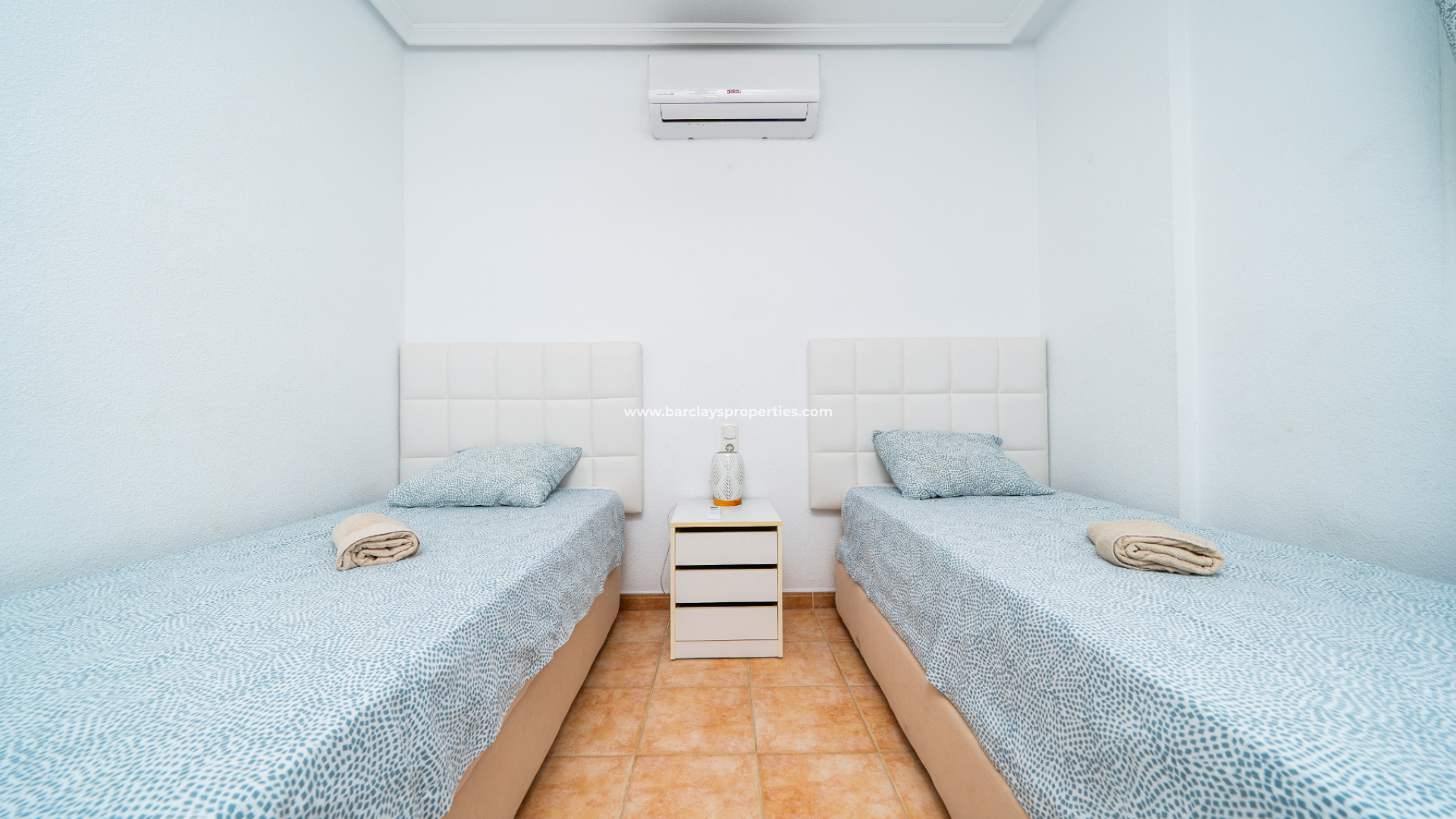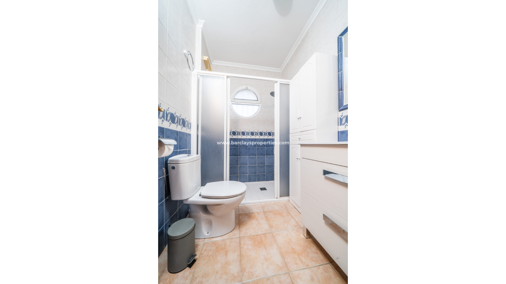 Dit aantrekkelijke, op het zuidwesten georiënteerde huis beschikt over een glazen veranda aan de voorkant met een ontspannende zithoek die leidt naar een ruime woonkamer uitgerust met airconditioning en plafondventilator, en een aparte volledig uitgeruste keuken met toegang tot een bijkeuken en opslagruimte. Er zijn drie slaapkamers, allemaal met inbouwkasten, plafondventilatoren en airconditioning. Twee van de slaapkamers bevinden zich op de begane grond samen met een van de badkamers met een ligbad van volledige grootte. Op de eerste verdieping vinden we de derde slaapkamer, de master, die smaakvolle inbouwkasten met spiegeldeuren heeft. De badkamer op dit niveau heeft een inloopdouche.