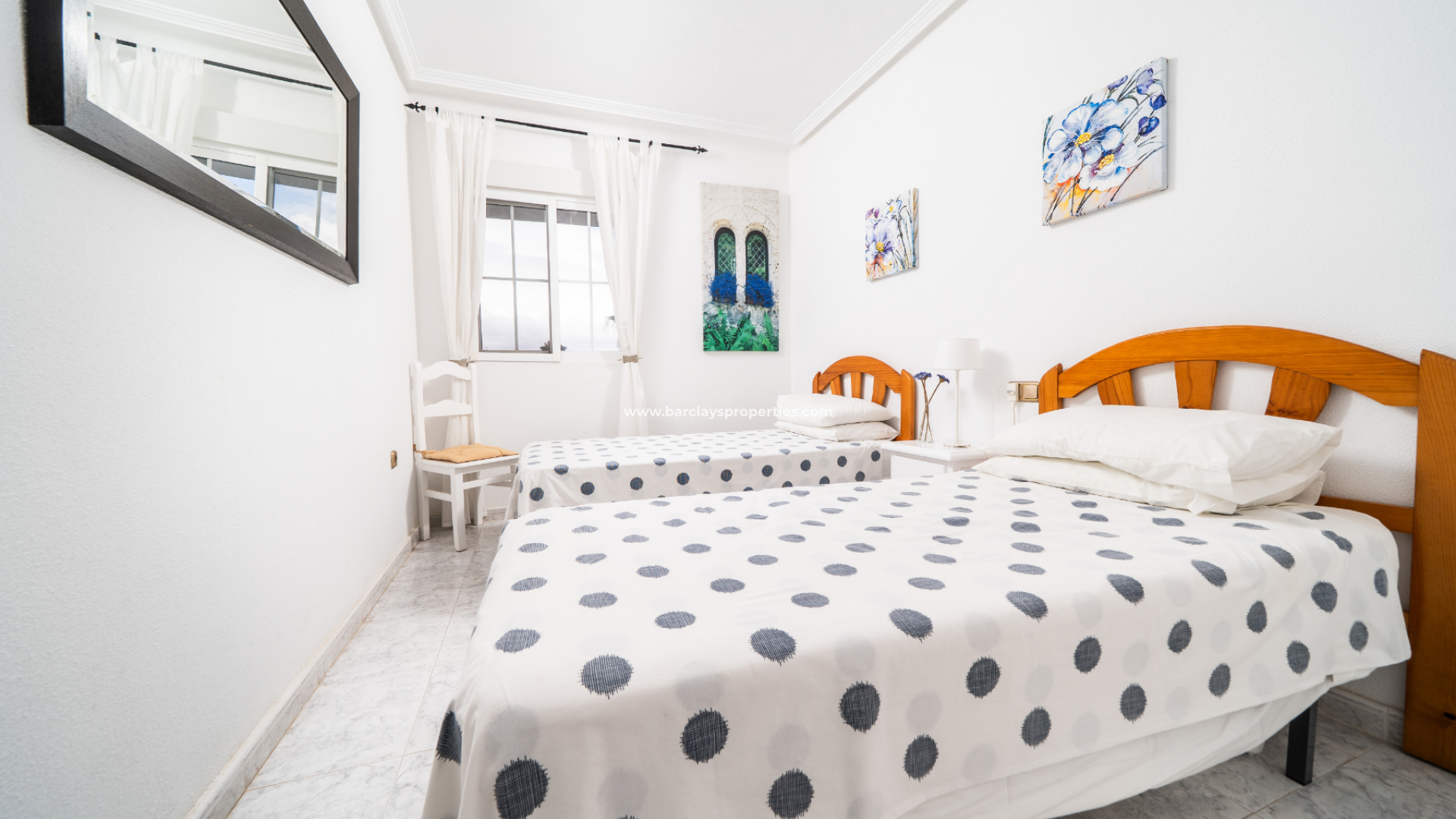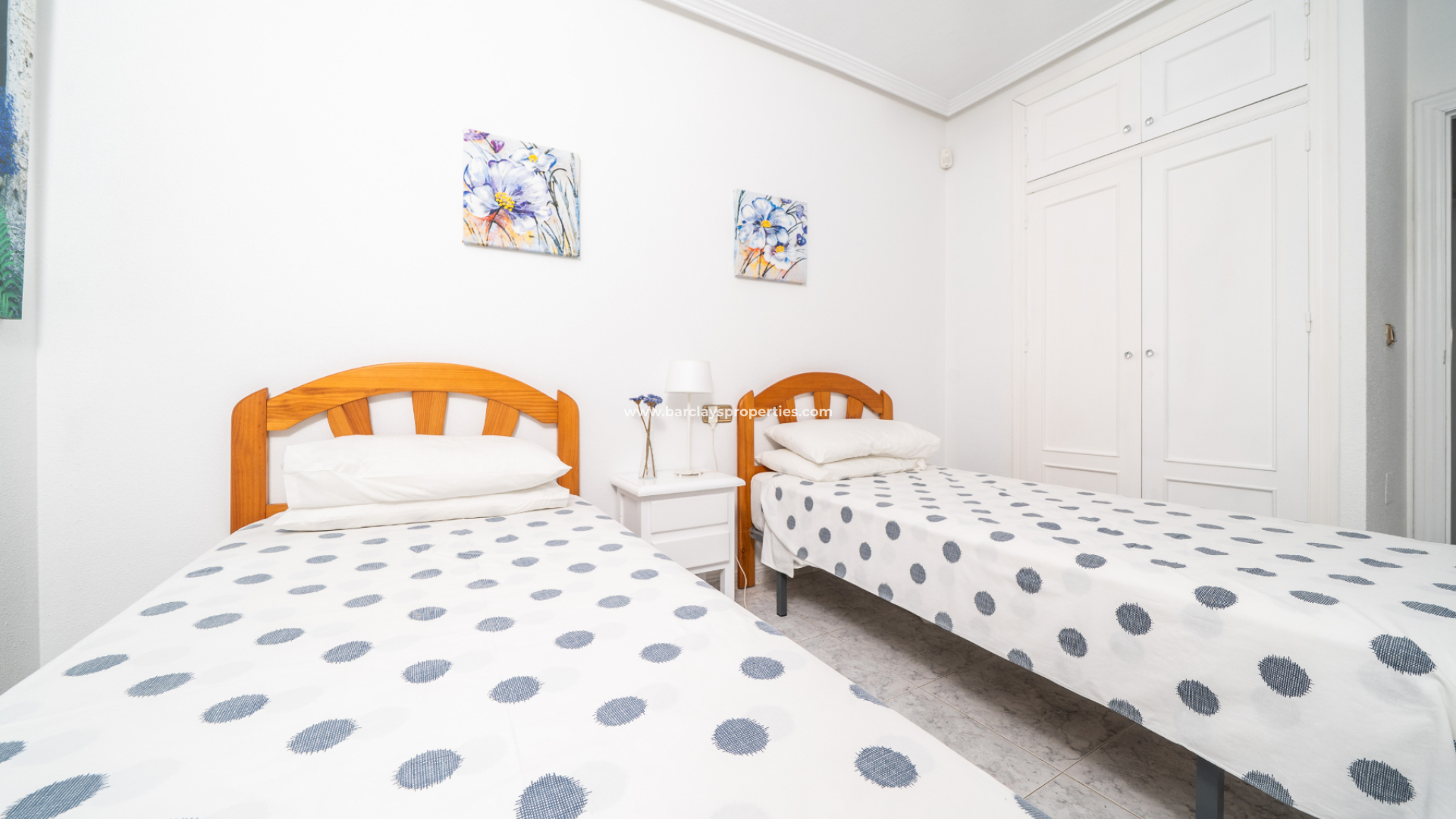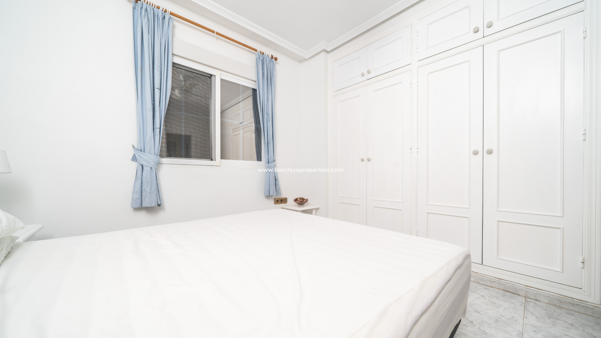Het appartement beschikt over twee slaapkamers: een tweepersoonskamer met plafondventilator en inbouwkast en een tweepersoons hoofdslaapkamer met plafondventilator en een vierdeurs kledingkast. De moderne badkamer is voorzien van een muur-tot-muur douche, een badmeubel, een bidet en een toilet.