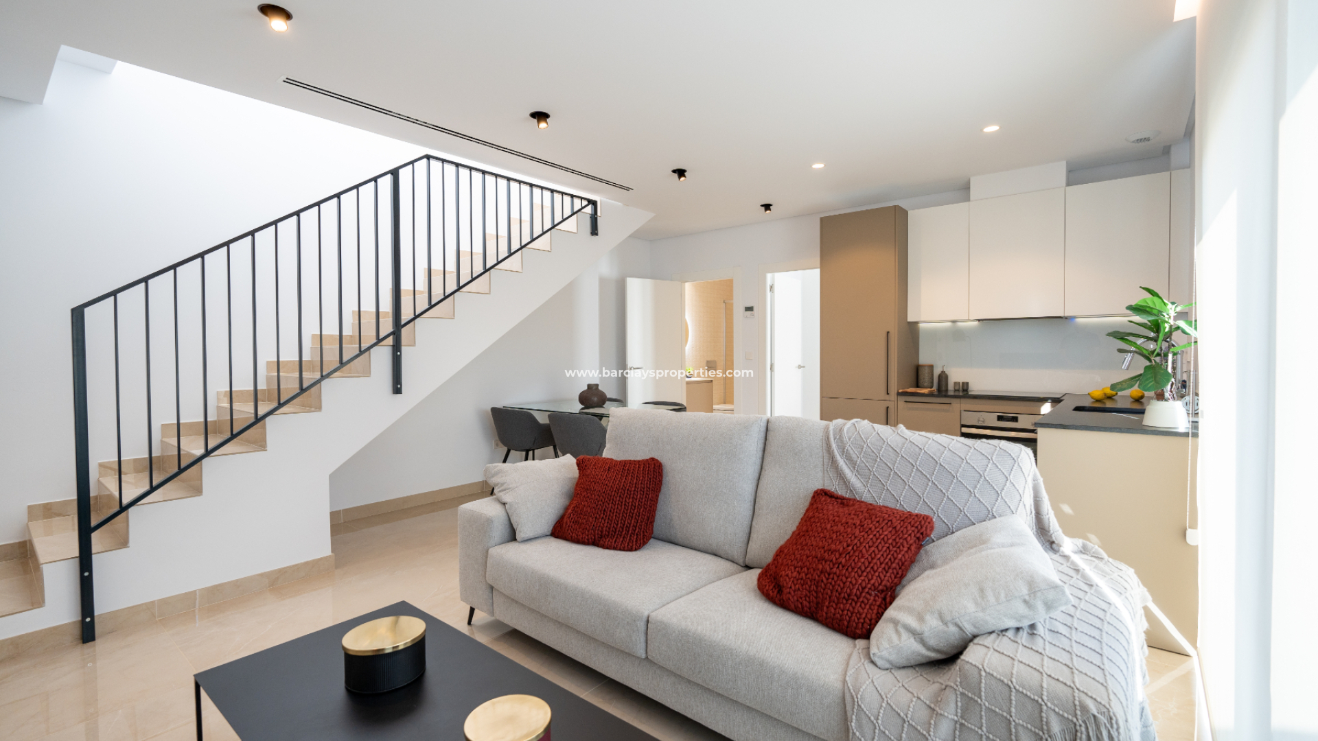 Ontdek deze prachtige nieuwbouwbungalows in een privé-gemeenschap nabij La Marina El Pinet, die een luxueuze woonervaring over twee verdiepingen bieden met een 10-jarige structurele garantie. Deze eigentijdse woningen beschikken over ➡️ een ruime bebouwde oppervlakte van 98 m² en privétpercelen variërend van 136 tot 156 m², privétuinen (variërend van 82 tot 101 m²), en prijzen vanaf 459.000 tot 535.000€. Ze bestaan uit 3 slaapkamers en 3 moderne badkamers, waarbij de master suite toegang heeft tot een balkon met uitzicht op het gemeenschappelijke zwembad. Het hoofdwoongedeelte heeft lichte, gepolijste vloeren en een open keuken met strakke, neutraal getinte kasten. Premium-voorzieningen zijn onder meer airconditioning in de hele woning, dubbele beglazing en elektrische rolluiken voor verbeterd comfort en veiligheid. Bewoners profiteren van ➡️ een prachtig gemeenschappelijk zwembad omgeven door tuinen en het gemak van één toegewezen parkeerplaats. Gelegen in een rustige omgeving maar toch dicht bij voorzieningen, en ➡️ op slechts 10 minuten lopen van het strand, bieden deze woningen een groot verhuurpotentieel op een zeer gewilde locatie.