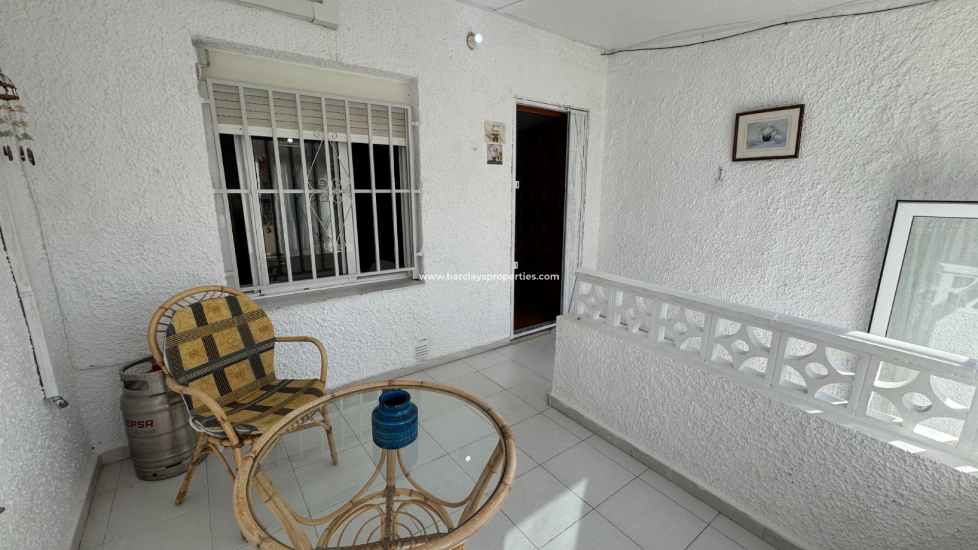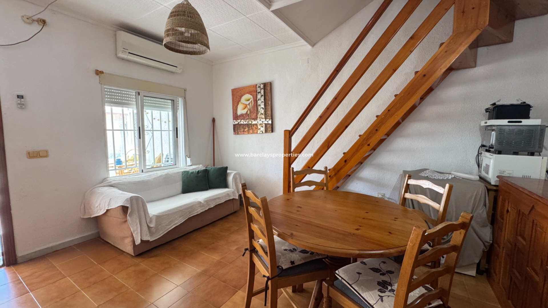 De woning beschikt over een glazen terras dat leidt naar een lichte woon- en eetkamer met airconditioning. De open keuken is voorzien van een gasfornuis en een recent geïnstalleerde elektrische boiler. De badkamer op de begane grond is uitgerust met een inloopdouche, toilet en wastafel. De uitgebouwde slaapkamer op dit niveau is voorzien van een plafondventilator en ingebouwde kastruimte.