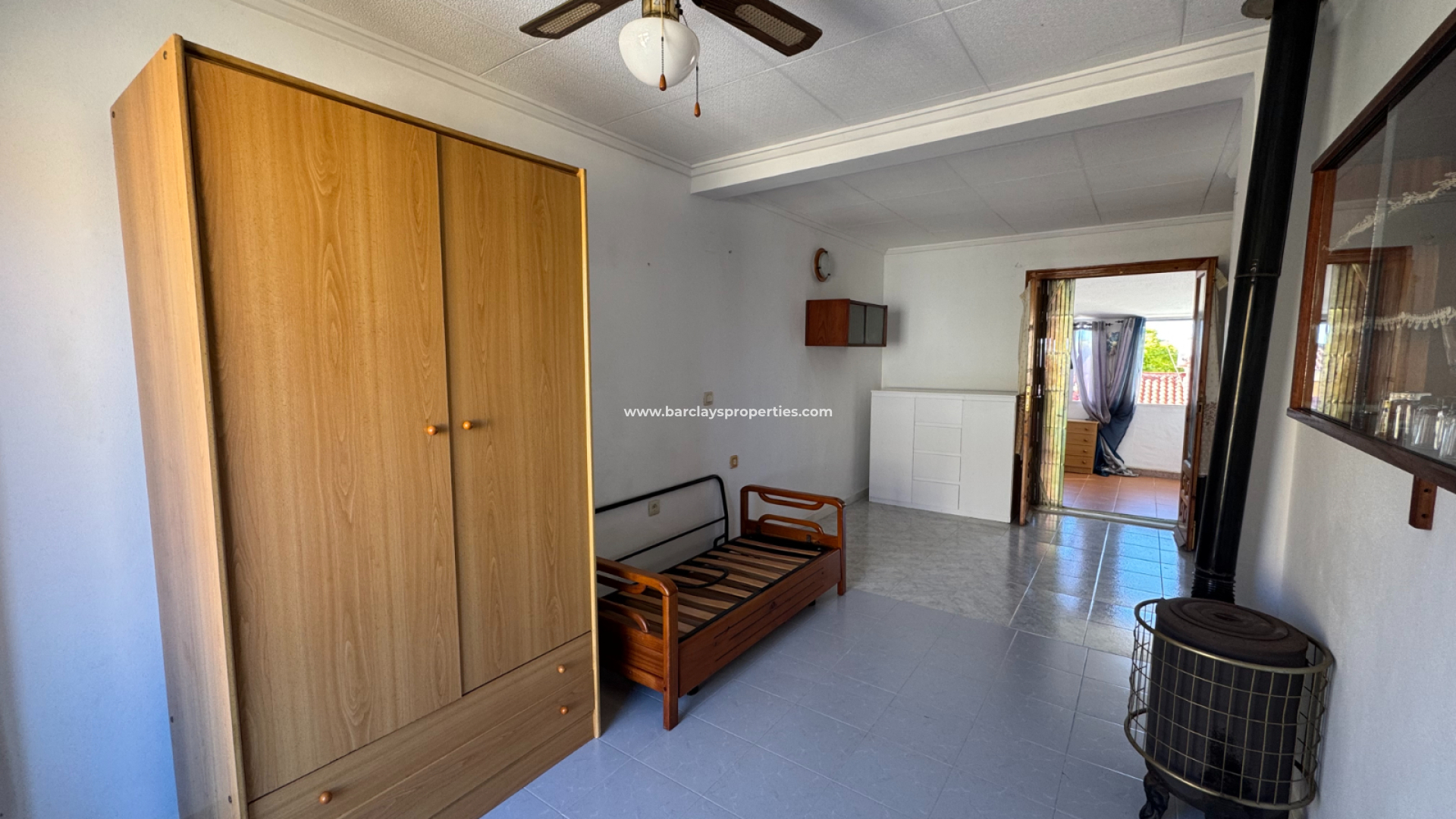 Een houten trap leidt naar de bovenverdieping, waar zich een extra ruimte bevindt die een tweede woonkamer of logeervertrek zou kunnen zijn en is voorzien van een houtkachel en plafondventilator. Openslaande deuren leiden naar een balkon dat geniet van ➡️ aangenaam uitzicht op de bergen. We vinden op dit niveau ook een twee- of tweepersoonskamer met een grote inloopkast en een tweede badkamer met inloopdouche, toilet en wastafel.