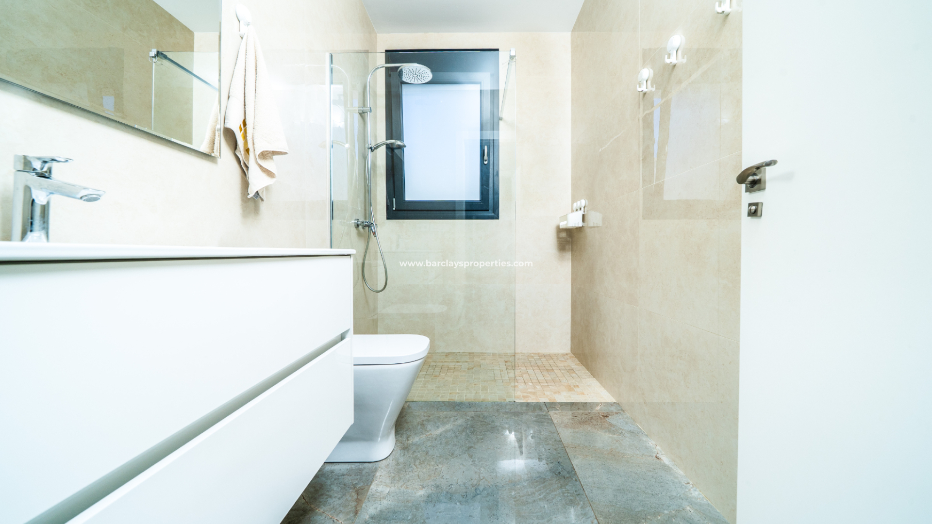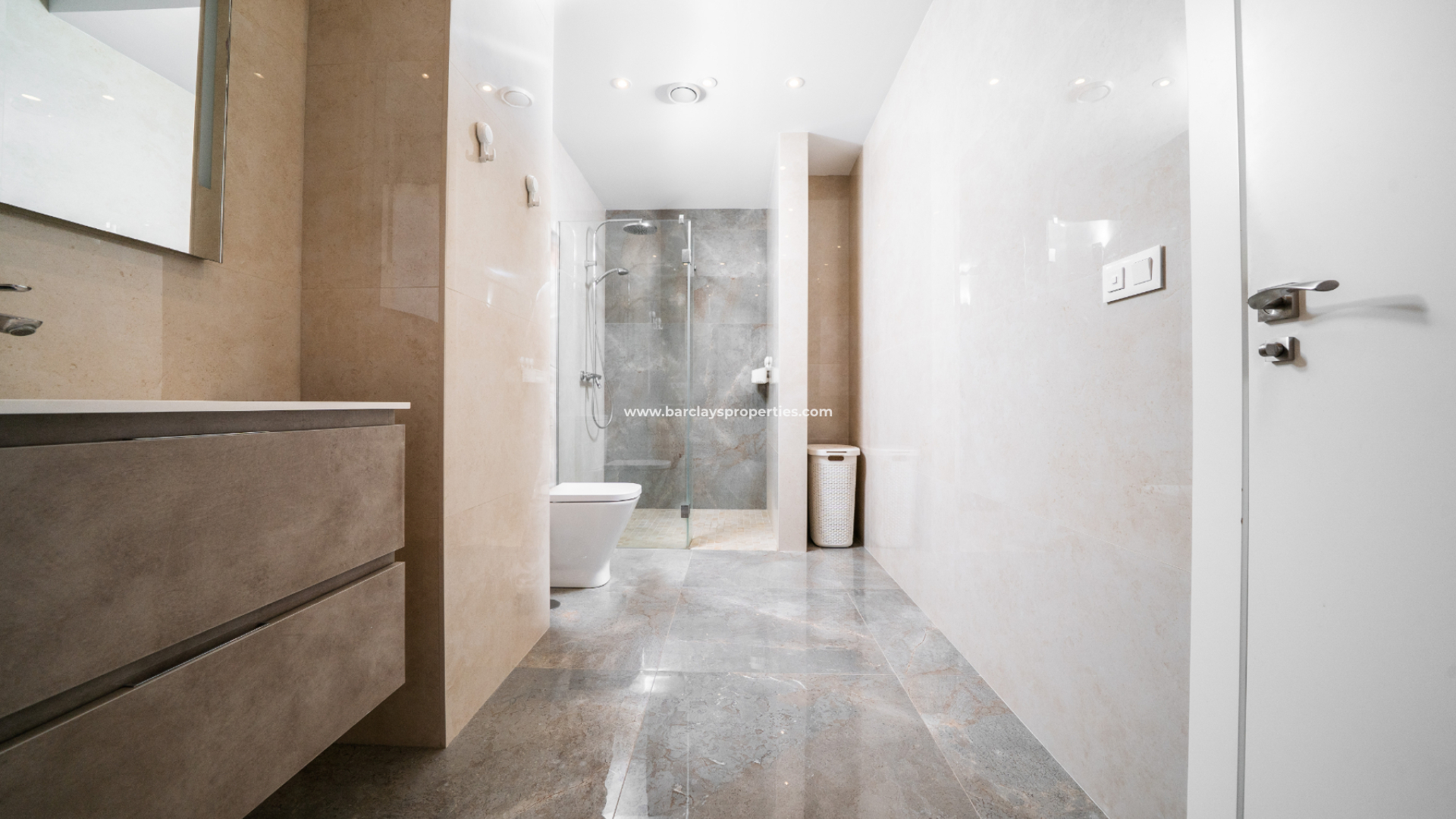 De master bedroom is uitzonderlijk: voorzien van maar liefst tien ingebouwde kasten, airconditioning en een ruime en-suite badkamer met walk-in douche, wastafelmeubel en toilet.