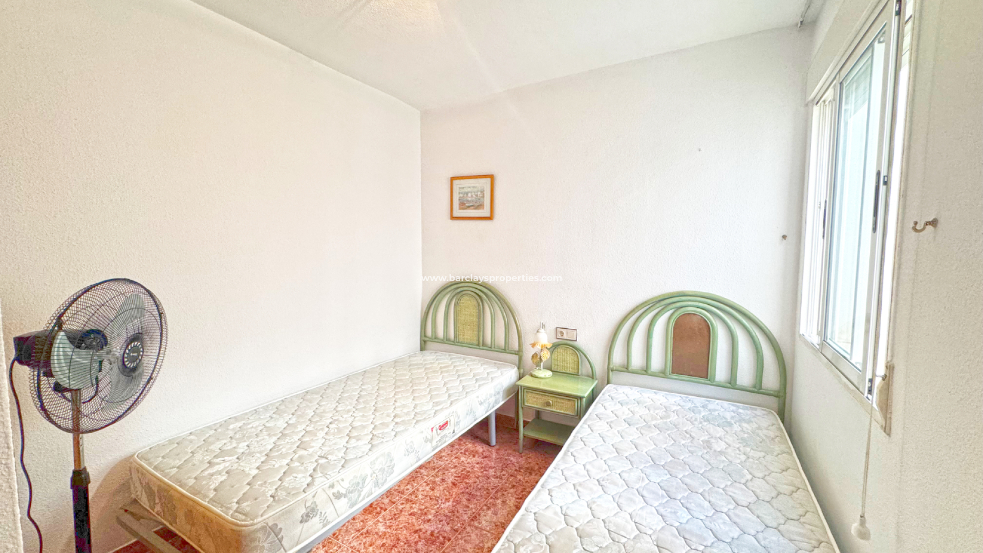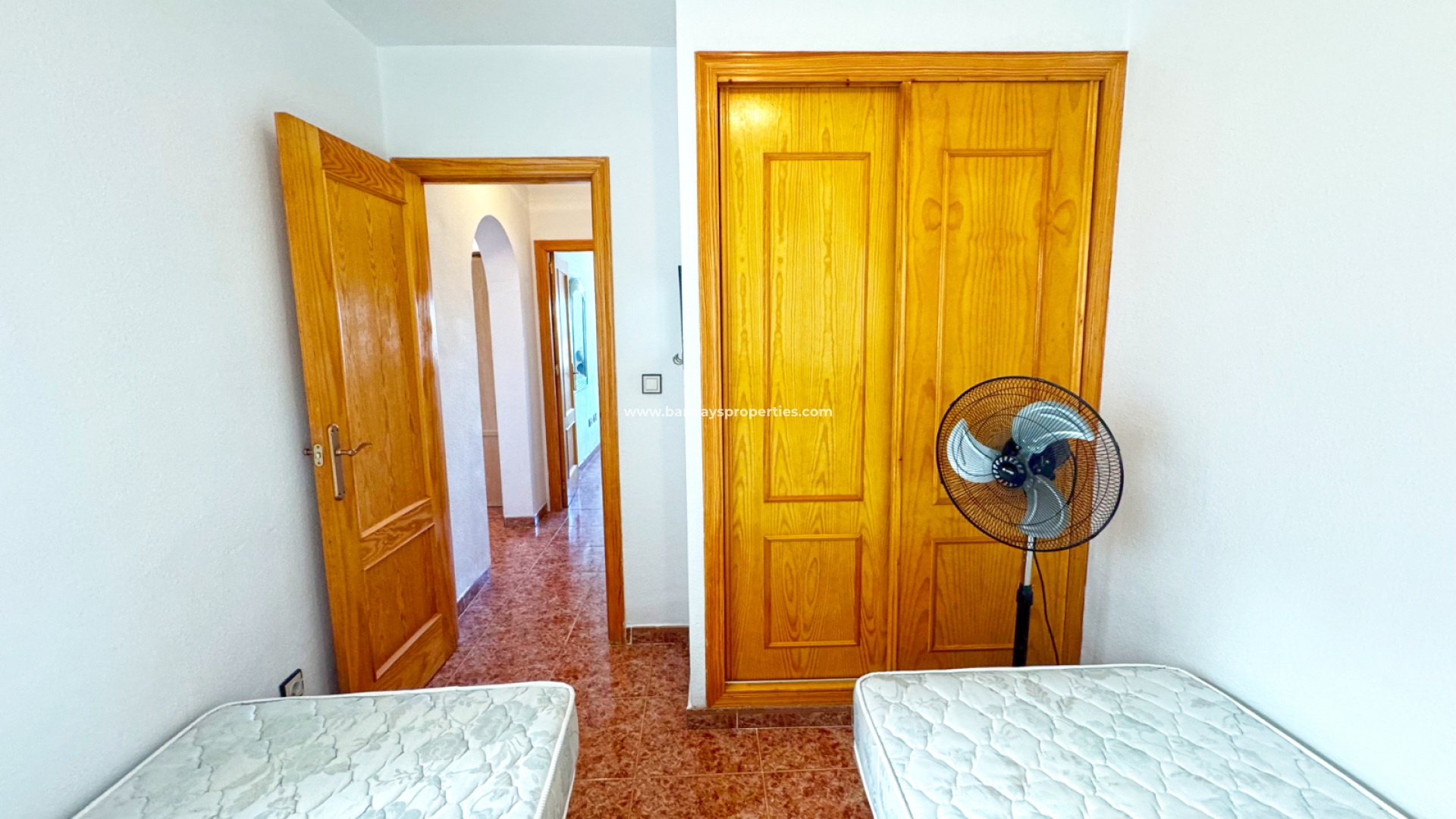 Binnen leidt de woonkamer naar twee comfortabele slaapkamers. De hoofdslaapkamer is voorzien van een tweepersoonsbed, airconditioning, een inbouwkast en een plafondventilator, terwijl de tweede slaapkamer beschikt over twee eenpersoonsbedden en een inbouwkast.