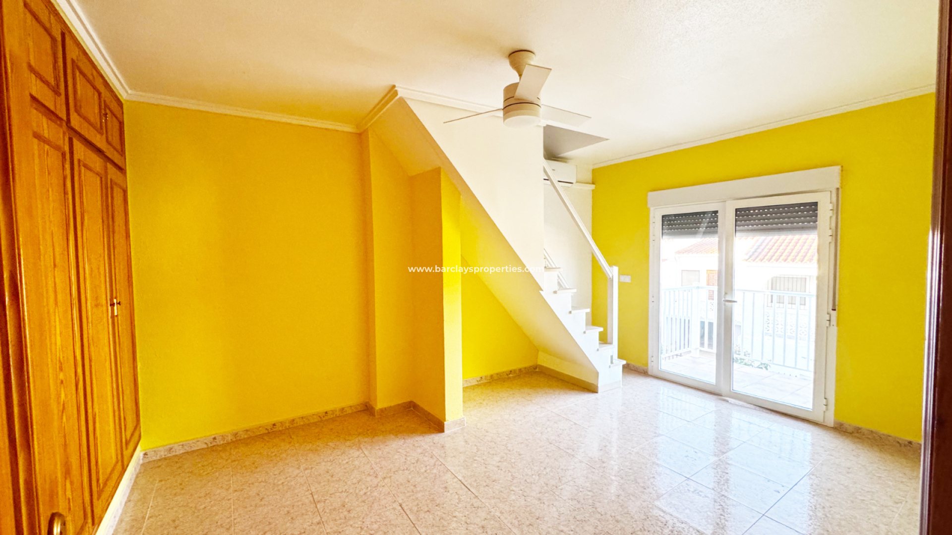 Deze uitgebreide rijtjeswoning in La Marina biedt een indrukwekkende 120 m² aan bebouwde ruimte verdeeld over twee verdiepingen, met drie comfortabele slaapkamers en twee goed uitgeruste badkamers. Het interieur beschikt over een uitnodigende open keuken en is uitgerust met moderne gemakken zoals airconditioning, dubbele beglazing en een gezellige houtkachel voor koelere avonden. De functionaliteit wordt verbeterd door een speciale berging en de installatie van zonnepanelen, wat de energie-efficiëntie bevordert. Extern beschikt de woning over een daksolarium, perfect om te zonnebaden en te genieten van het prachtige uitzicht op de omgeving. Gelegen in een rustige maar zeer gunstige omgeving, ligt dit huis op slechts 400 meter van lokale voorzieningen, 3 km van het strand, 25 km van de luchthaven en 10 km van de dichtstbijzijnde golfbaan, waardoor het een woning is met een groot verhuurpotentieel.